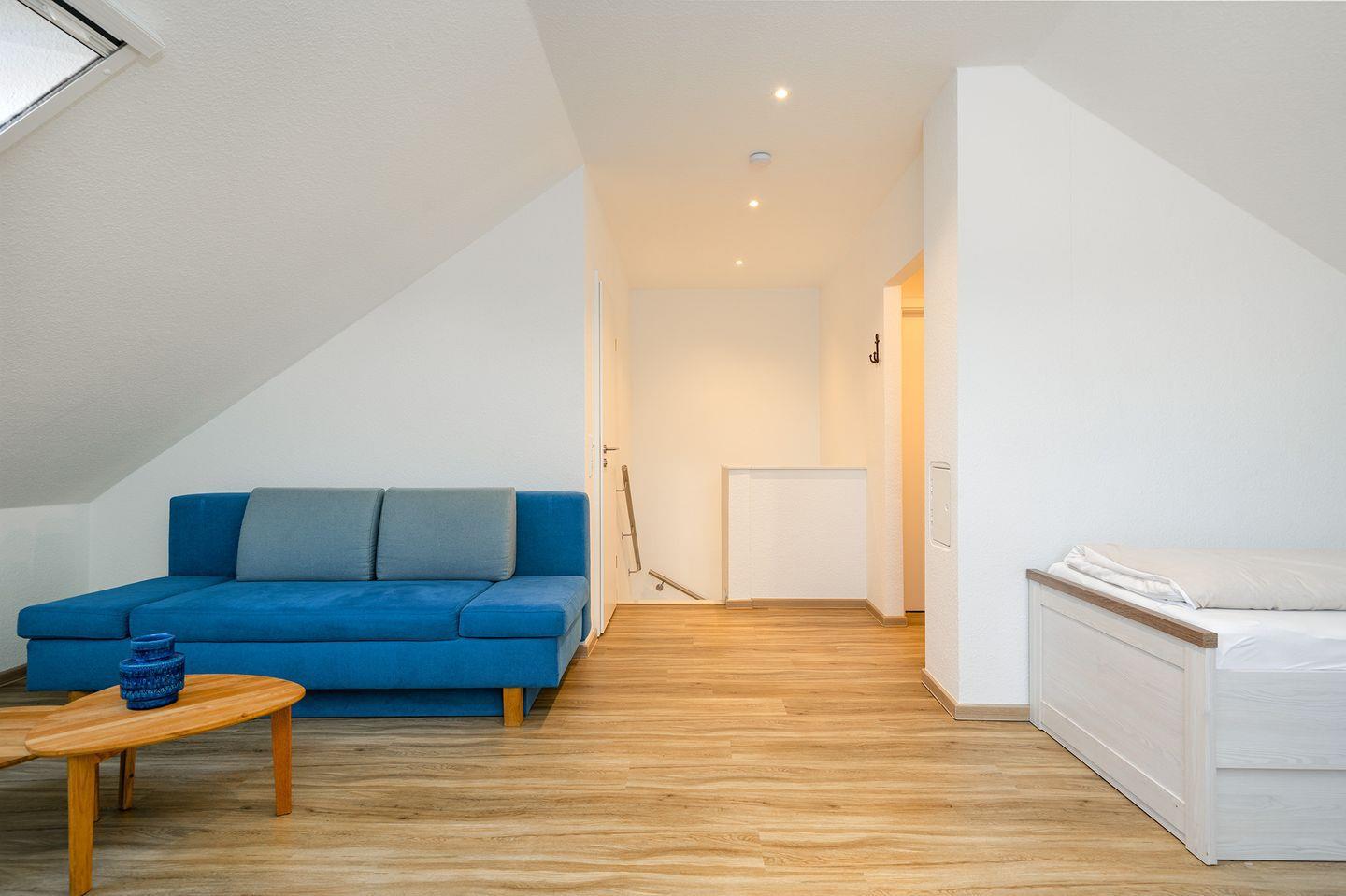 Vom Wohnbereich führt eine Treppe in das ausgebaute Dachgeschoss. Hier finden Sie ein 2. Duschbad mit Föhn, eine begehbare Kleiderkammer und das großzügige Dachstudio mit 2 Einzelbetten und ausziehbarem Schlafsofa (140x200).