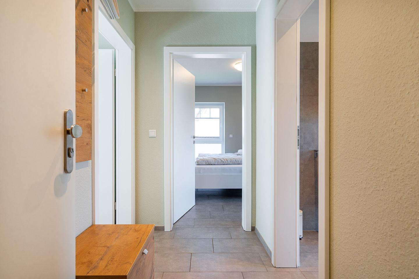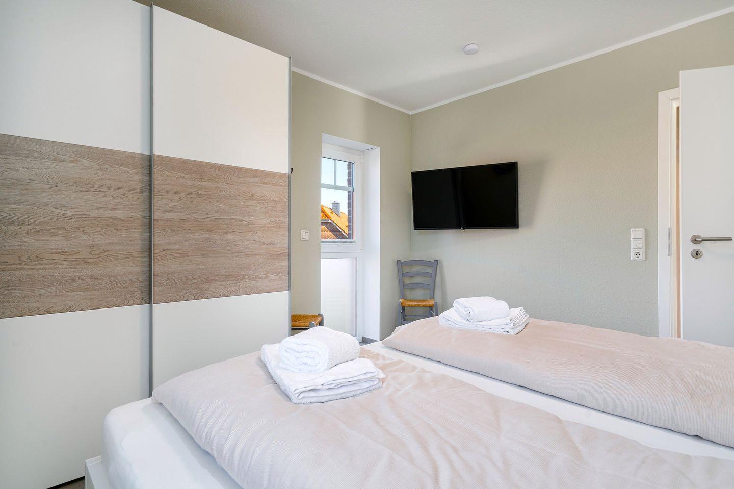 Auf gleicher Ebene befindet sich ein Schlafzimmer mit Doppelbett, Kleiderschrank und TV, ein modernes Duschbad mit Föhn und ein Abstellraum mit Waschtrockner, Bügeleisen, Bügelbrett und Wäscheständer.