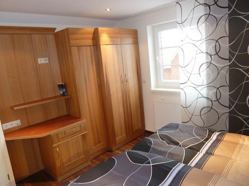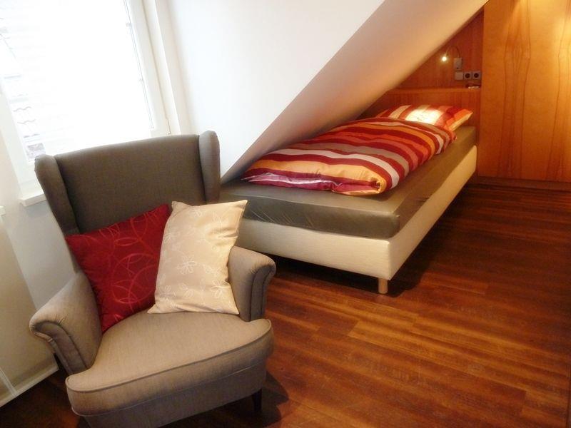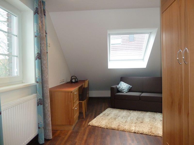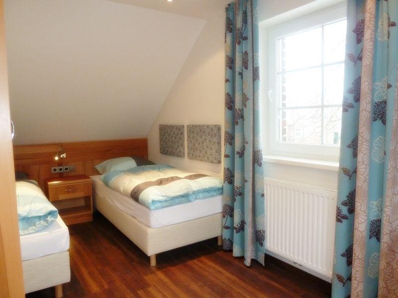 Im Obergeschoss befindet sich ein gemütliches Einzelzimmer mit 1,20 m Bett , 1 Schlafzimmer mit Doppelbett 1,80 m. und ein großes Schlafzimmer mit 2x0,90 m Einzelbetten und 1 sep. Schlafcouch, Schreibtisch, Brettspiele, Bücher. Bei schlechtem Wetter haben Sie hier ein zweites Wohnzimmer. Ein weiteres Schlafzimmer mit einem Doppelbett 1,80 m befindet sich im Erdgeschoss. Alle Betten sind mit Boxspringmatratzen ausgestattet.
