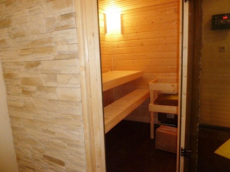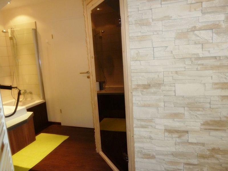 Das mediterrane Badezimmer mit Musikanlage im EG lädt zum Verweilen ein. Dort befindet sich eine Kombination aus Finnische- und Dampfsauna sowie eine Whirlpoolwanne. Ein Föhn steht ebenfalls zur Verfügung. Das Bad ist vom Flur, als auch vom Schlafzimmer im EG erreichbar.