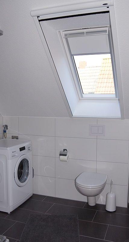 In dem Badezimmer mit Dusche (niedriger Einstieg) befindet sich auch die Waschmaschine. Auch ein Föhn ist vorhanden.