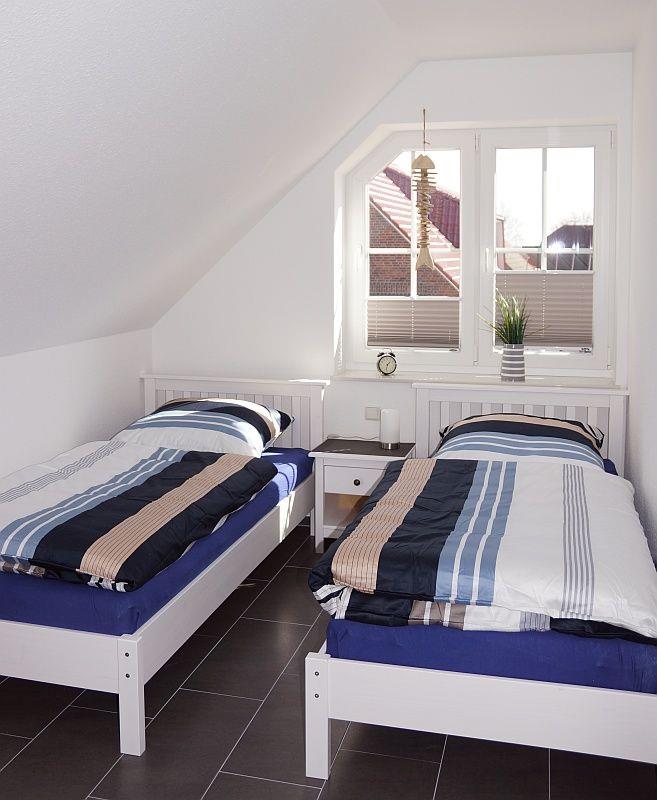Auf der ersten Etage befinden sich zwei Schlafräume, einer mit einem Doppelbett und der andere mit zwei Einzelbetten. Die Fenster lassen sich mit Plissees verdunkeln. Auf der zweiten Etage, in der ausgebauten Galerie, befindet sich ein weiterer Raum (ohne Tür) mit einer gemütlichen Schlafcouch und einem weiteren internetfähigen Smart-TV.