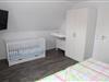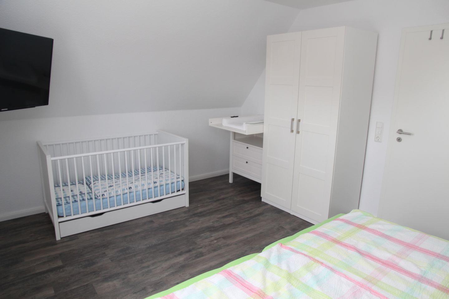 Im Obergeschoss befinden sich zwei gemütliche Schlafzimmer (eines mit Doppelbett, Kleiderschrank, Kinderbettchen und Wickelkommode, das andere mit 2 Einzelbetten/Kleiderschrank) und ein weiteres Badezimmer mit Dusche, Babybadewanne, Waschmaschine und Trockner. Die Treppe ist mit einem Treppenschutzgitter gesichert.