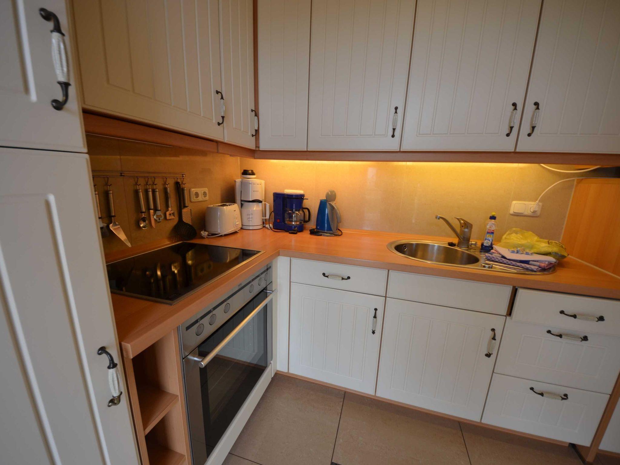 Sehr dekorative Landhaus-Einbauküche in vanillegelb, Geschirrspüler höher gelegt, Mikrowelle, Herd mit Cerankochfeld und Backofen, Flachschirm-Dunstabzugshaube, großer Kühlschrank mit 38 LGefrierteil, zwei Kaffeemaschinen, Wasserkocher, Eierkocher, Toaster, Waffeleisen, Mixer, ausreichend Edelstahltöpfe Schnellkochtopf, Gewürze, sehr schönes Geschirr, Auswahl an Gläsern.
