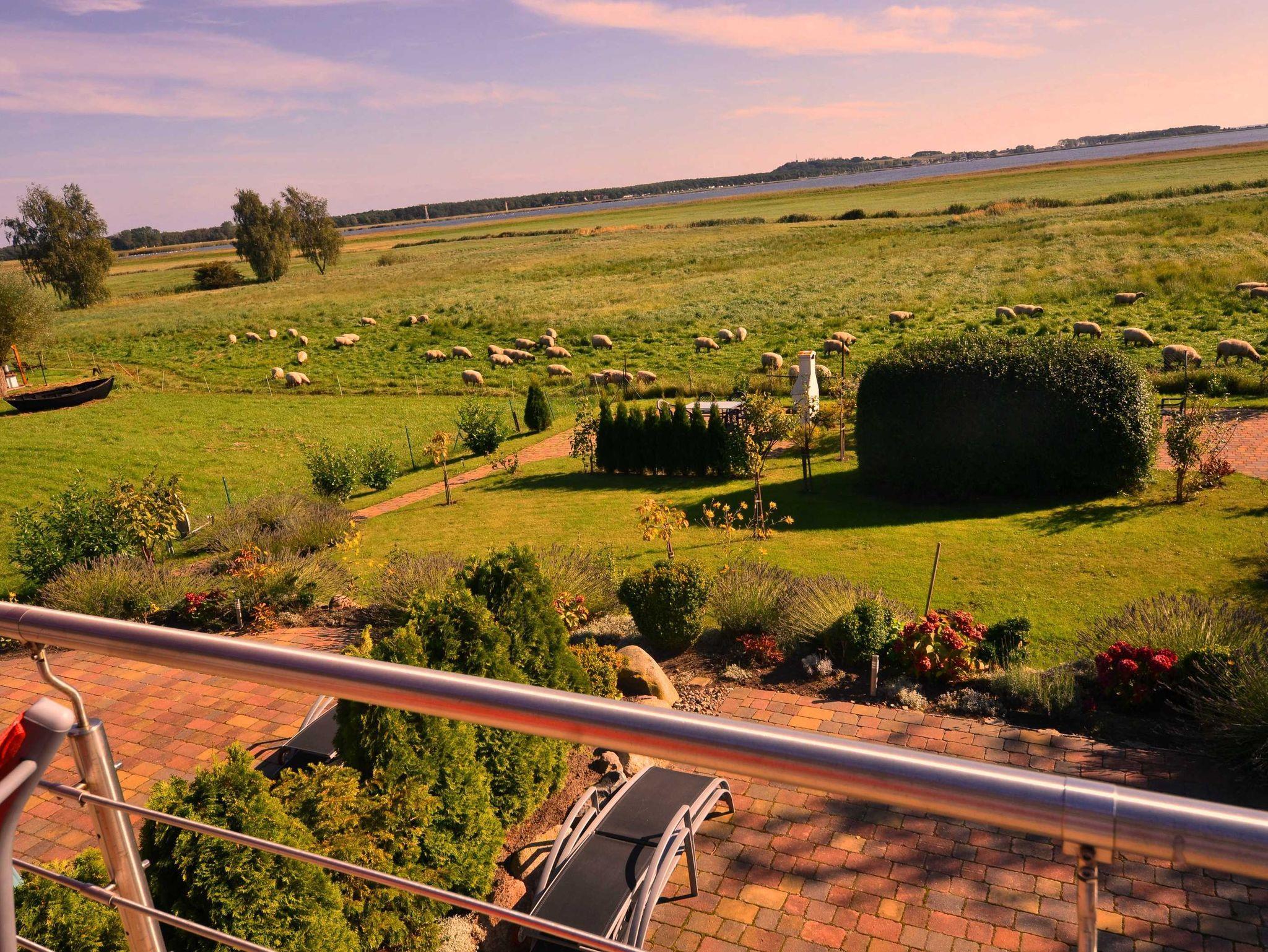 Großzügiges Wohn-/Esszimmer mit Ausgang zum großen Balkon mit direktem traumhaften Blick auf die Ostsee, den kleinen Hafen von Groß Zicker und die gegenüber der Bucht liegenden Orte Thiessow und Klein Zicker. Schöne Ledergarnitur mit Opiumtisch. Speisetafel mit sechs Stühlen, großer