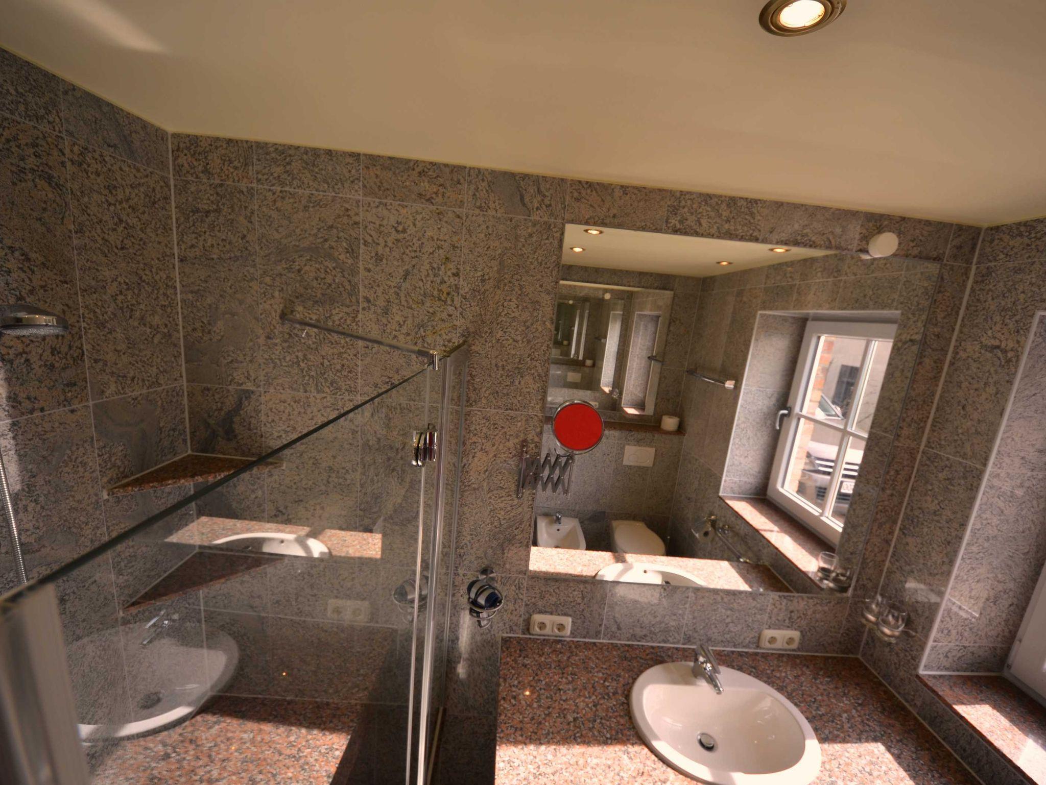 Ein Bad mit Badewanne (mit Glas-Duschabtrennung), Toilette und Bidet. Zweites Bad mit Duschbad, Granitverkleidung, Fußbodenheizung, Granit - Abdeckungen, große Spiegel, schöne Sanitärausstattung, Einbau-Waschbecken, beheizbarer Handtuchhalter, Fön, Schminkspiegel, dekorative Beleuchtung.