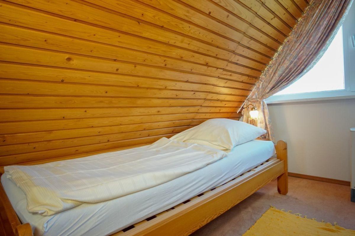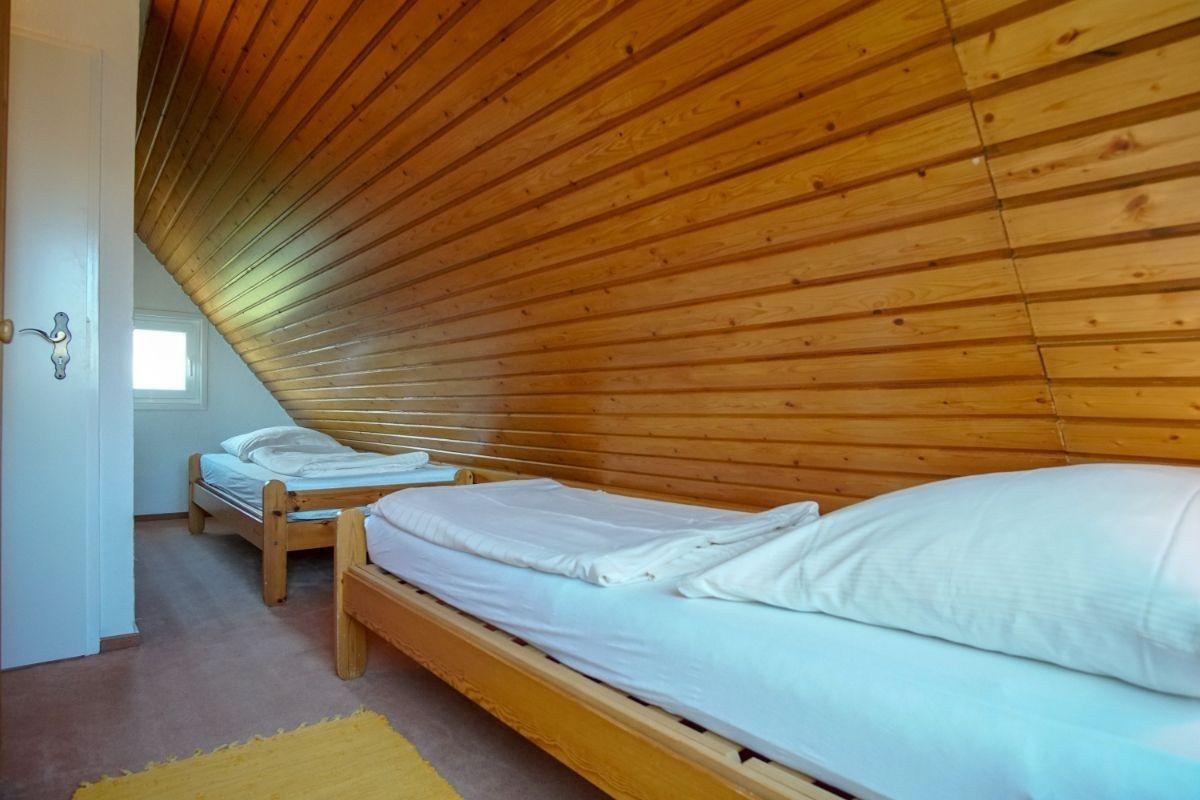 Im Obergeschoss finden Sie ein großes Schlafzimmer mit einem gemütlichen Doppelbett und ein kleineres Kinderzimmer mit zwei Einzelbetten.