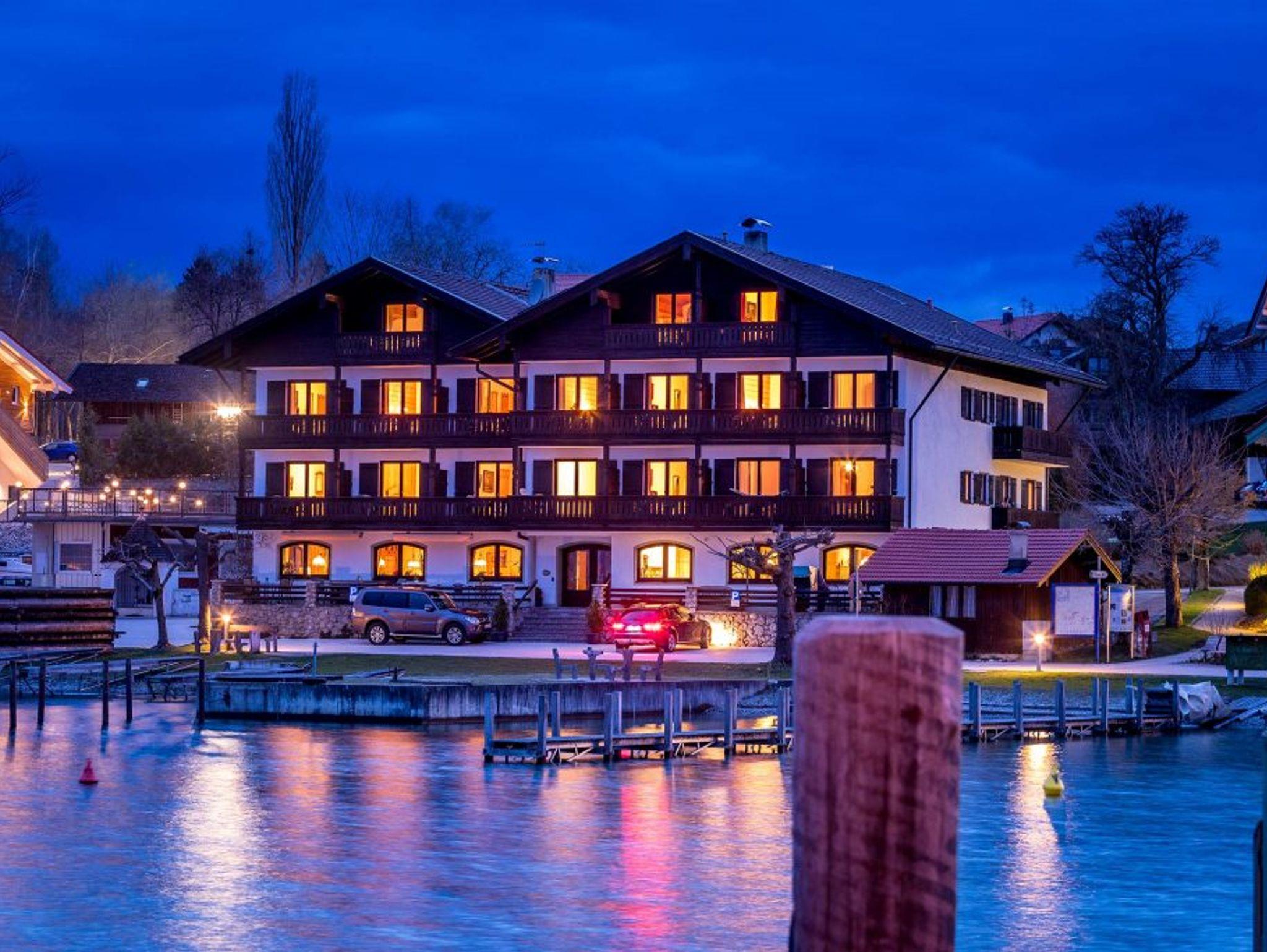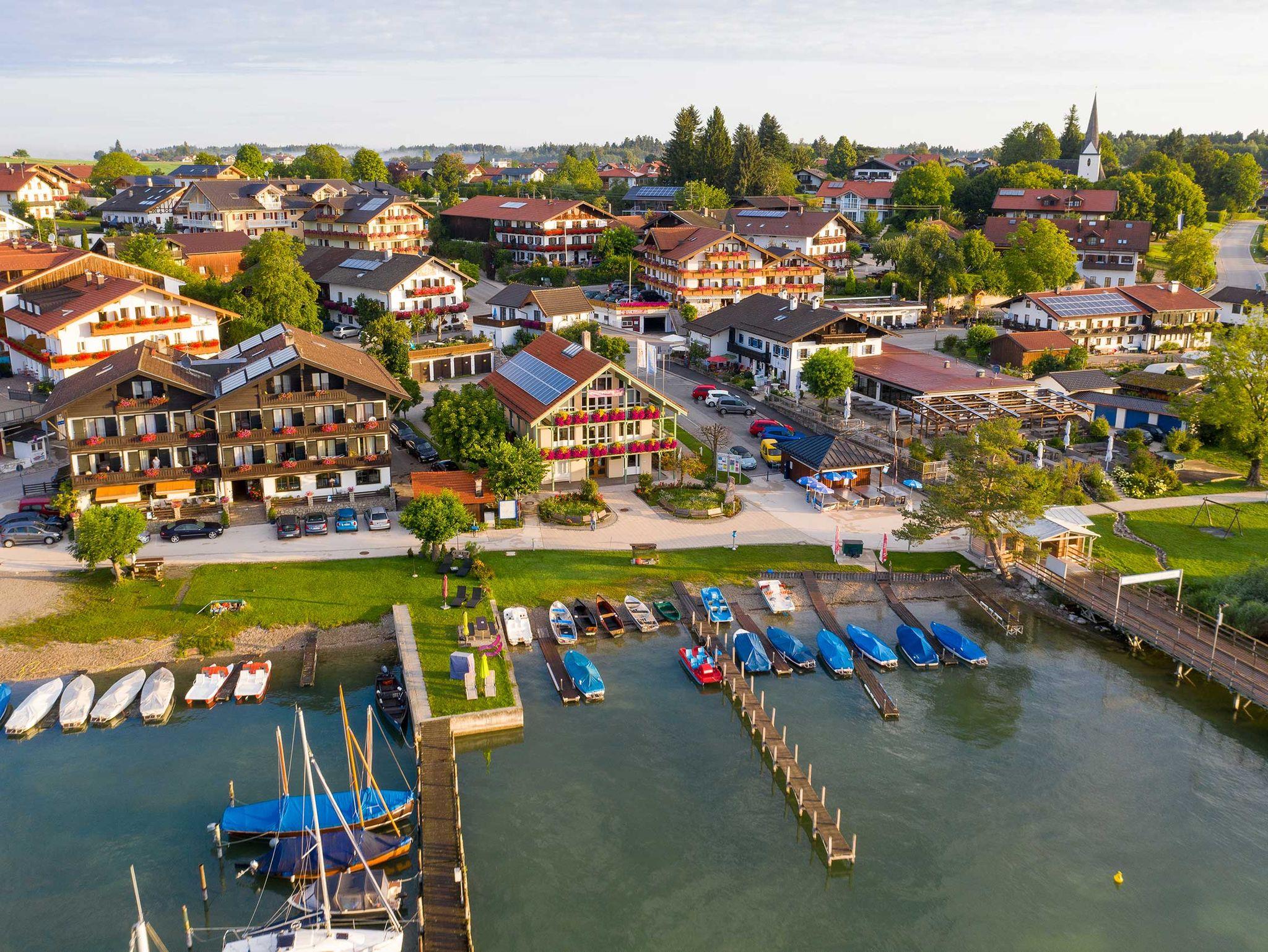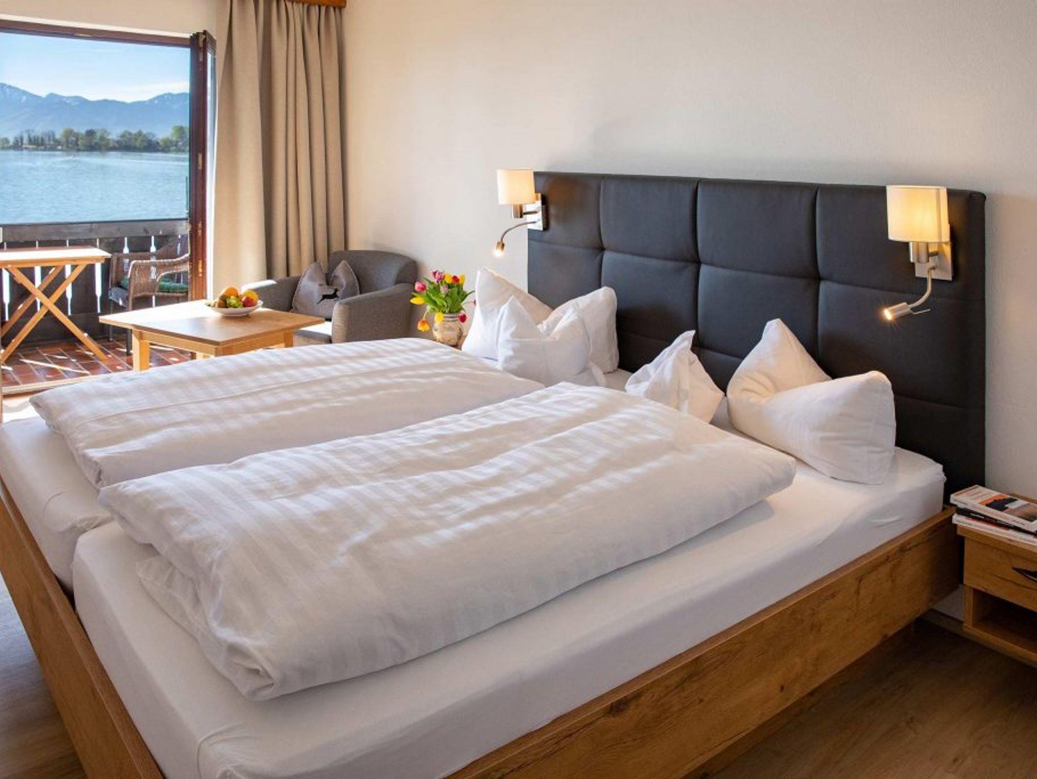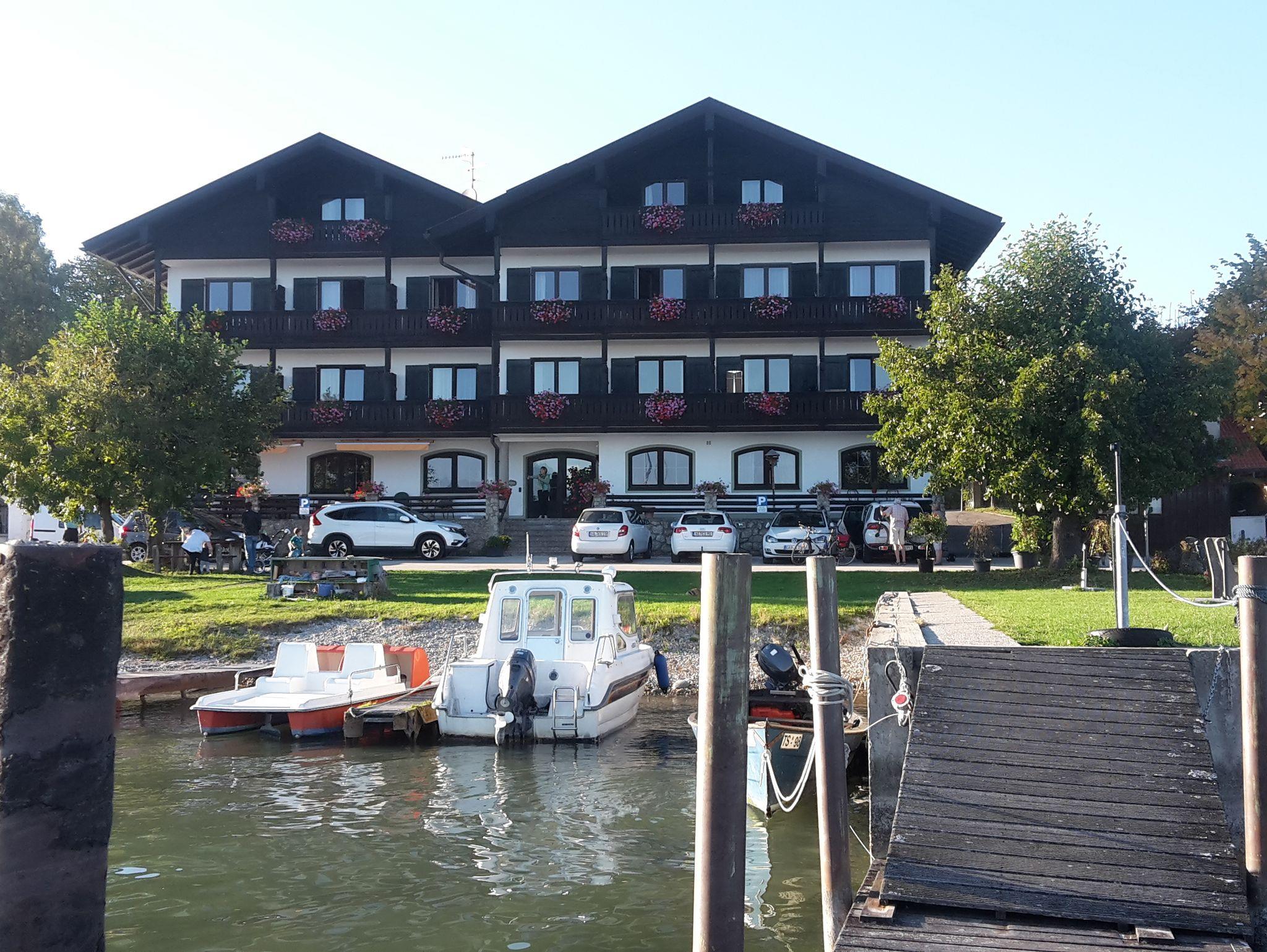 Unser Haus liegt ruhig, direkt am Ufer, mit herrlichem Blick über den See, auf die Fraueninsel und auf die Berge. Viele Gäste sagen, der schönste Platz rund um den Chiemsee. Vor dem Haus unser Yachthafen, mit Segel-, Ruder- und Elektrobooten zum Verleih. Direkter Seezugang, ca. 60 m. zur Anlegestelle der Chiemseeschifffahrt auf die Frauen-und Herreninsel, Liegewiese am See mit Badeleiter und Liegestühlen. Nichtraucherzimmer, Ferienwohnungen, 1-Zimmer-Apartement stehen Ihnen zur Verfügung.