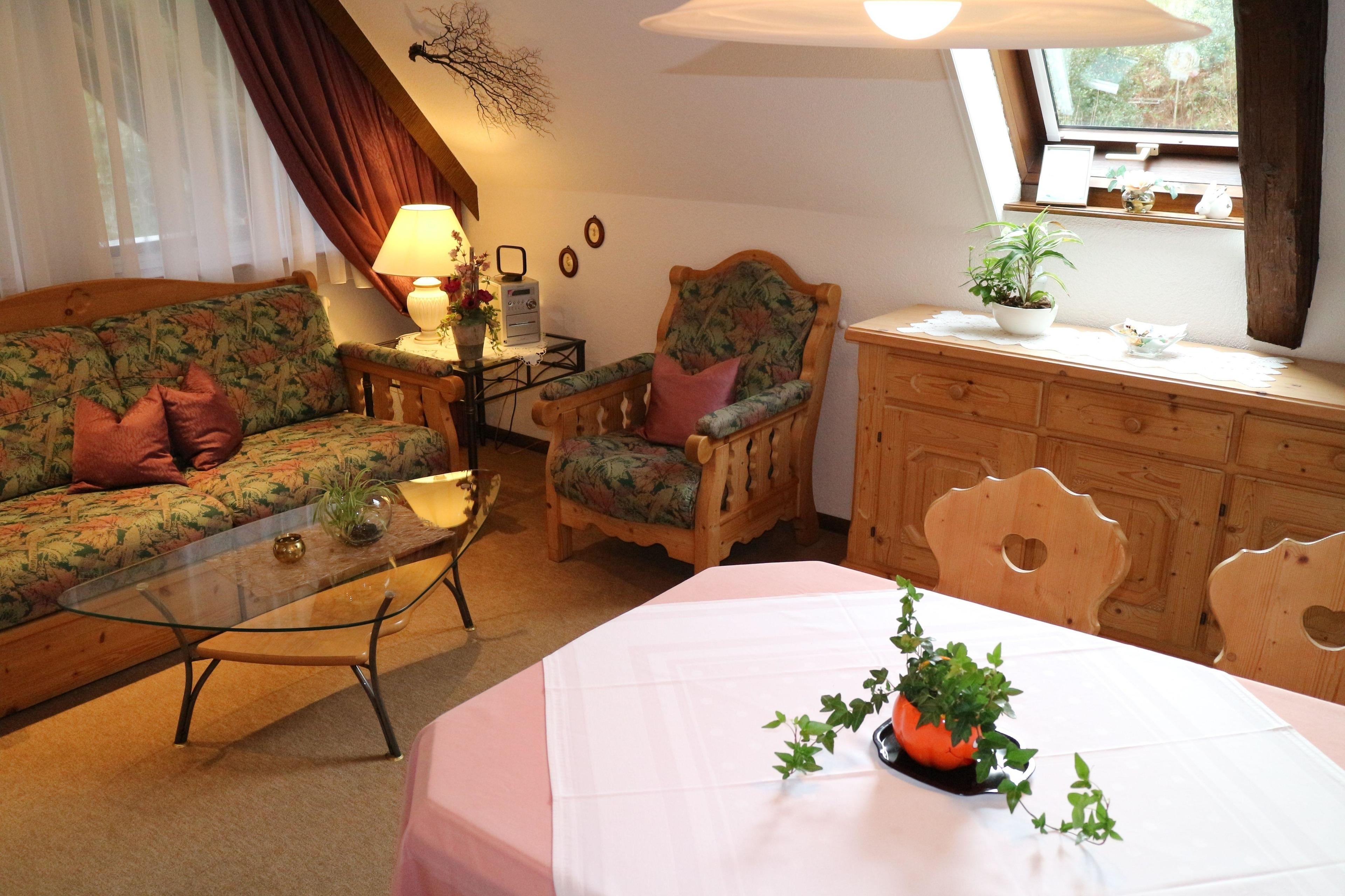 Der harmonisch eingerichtete Wohnraum mit Essecke, wurde mit Massivholzmöbeln ausgestattet und bietet den richtigen "Rahmen" zum gemütlichen Beisammensein. Die Wohnung \"Talblick\" befindet sich im 2. OG und verfügt über eine separate Küche, die komplett eingerichtet ist mit allem was Sie brauchen: Cerankochfeld 60 x 60, Dunstabzugshaube mit Abluft nach Außen und Backofen, Kühl-Gefrierkombination und natürlich Kochgeschirr. Ein kleiner Tisch mit Stühlen macht den "Arbeitsraum" zu einer gemütlichen Wohnküche.