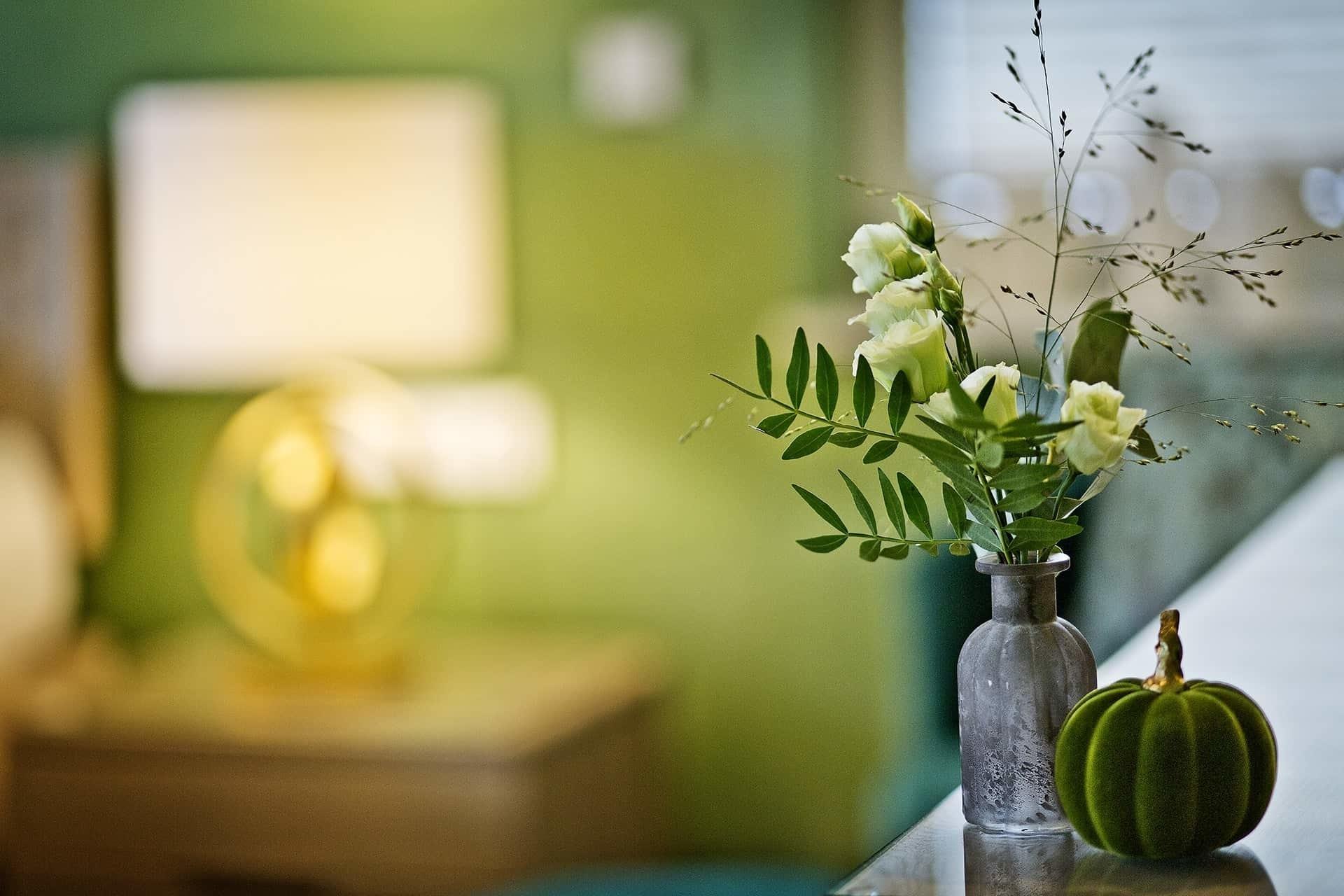 Nachttischlampen und Spiegel im Schmetterling-Design präsentieren sich in modernen Kupfer- und Gold-Tönen. Eine gemütliche Leseecke mit Samtsessel lädt zum Entspannen ein.