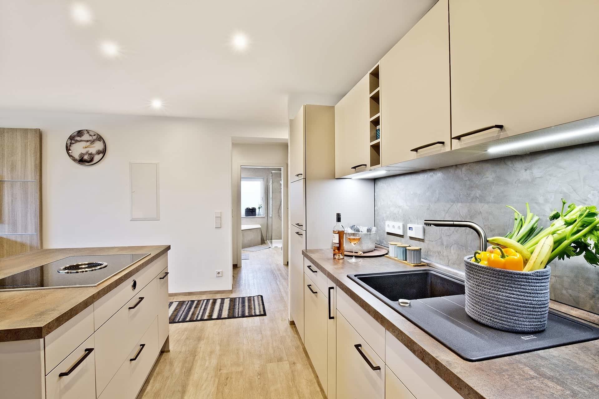 - Das Herz der Wohnung ist der offene Wohn- und Küchenbereich, der sehr kommunikativ ausgerichtet ist mit dem Essplatz mitten im Raum an der Kochinsel. Die hochwertige, voll ausgestattete Küche bietet alles, was Sie benötigen, auch für einen längeren Aufenthalt.