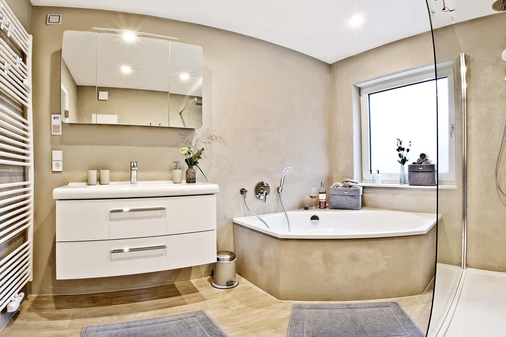 Im neuen Bad befindet sich eine coole Walk-In-Dusche mit großer Regenbrause sowie eine Eckbadewanne, ein Waschbecken mit Unterwaschtisch und WC. Außerdem: ein großer Spiegelschrank, ein Kosmetik-Spiegel, Föhn, Handtücher und Vorleger. Das Bad kann mittels Tageslichtfenster gut belüftet werden.