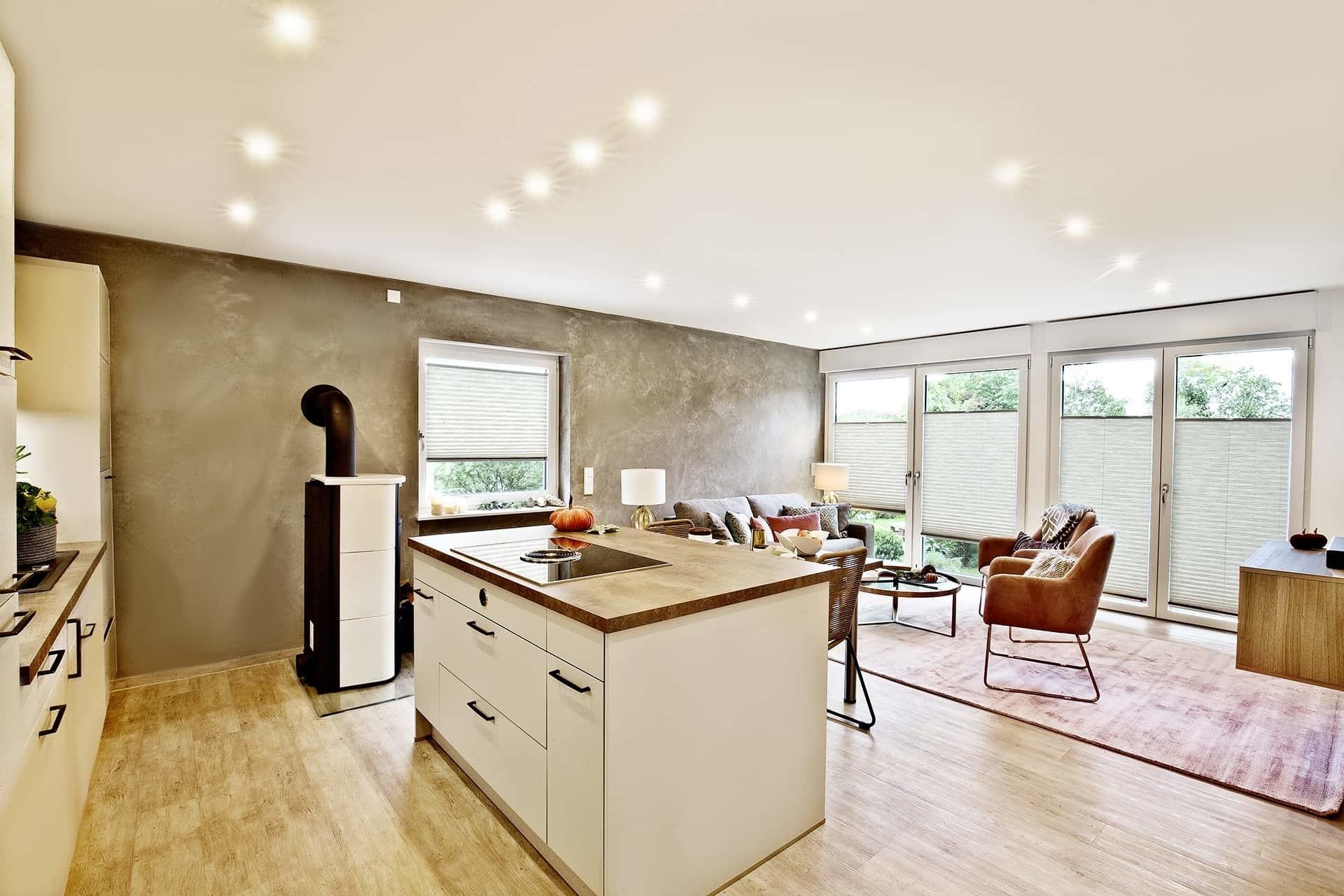 Vor der Küchenwand mit Spüle, Kühlschrank mit Gefrierfach, Backofen, Geschirrspüler, Waschtrockner und Regalen steht eine moderne Kochinsel mit 4-Platten-Induktionsherd. Der verschiebbare und im Design identische Esstisch - für bis zu vier Personen - fügt sich harmonisch an. Gegenüber des kuscheligen, hochwertigen Sofas - welches als zusätzliche Schlafmöglichkeit fungieren kann - befindet sich die Cine-Wall mit Flachbild-TV. Für die kühleren Tage steht ein knisternder Kamin zur Verfügung. Bodentiefe Fenster spenden viel Licht. Zwei Türen führen hinaus auf die Westseite des Hauses. Dort befindet sich eine eigene Gartenfläche von etwa 30 m² mit Outdoor-Sitzmöglichkeit für bis zu vier Personen.