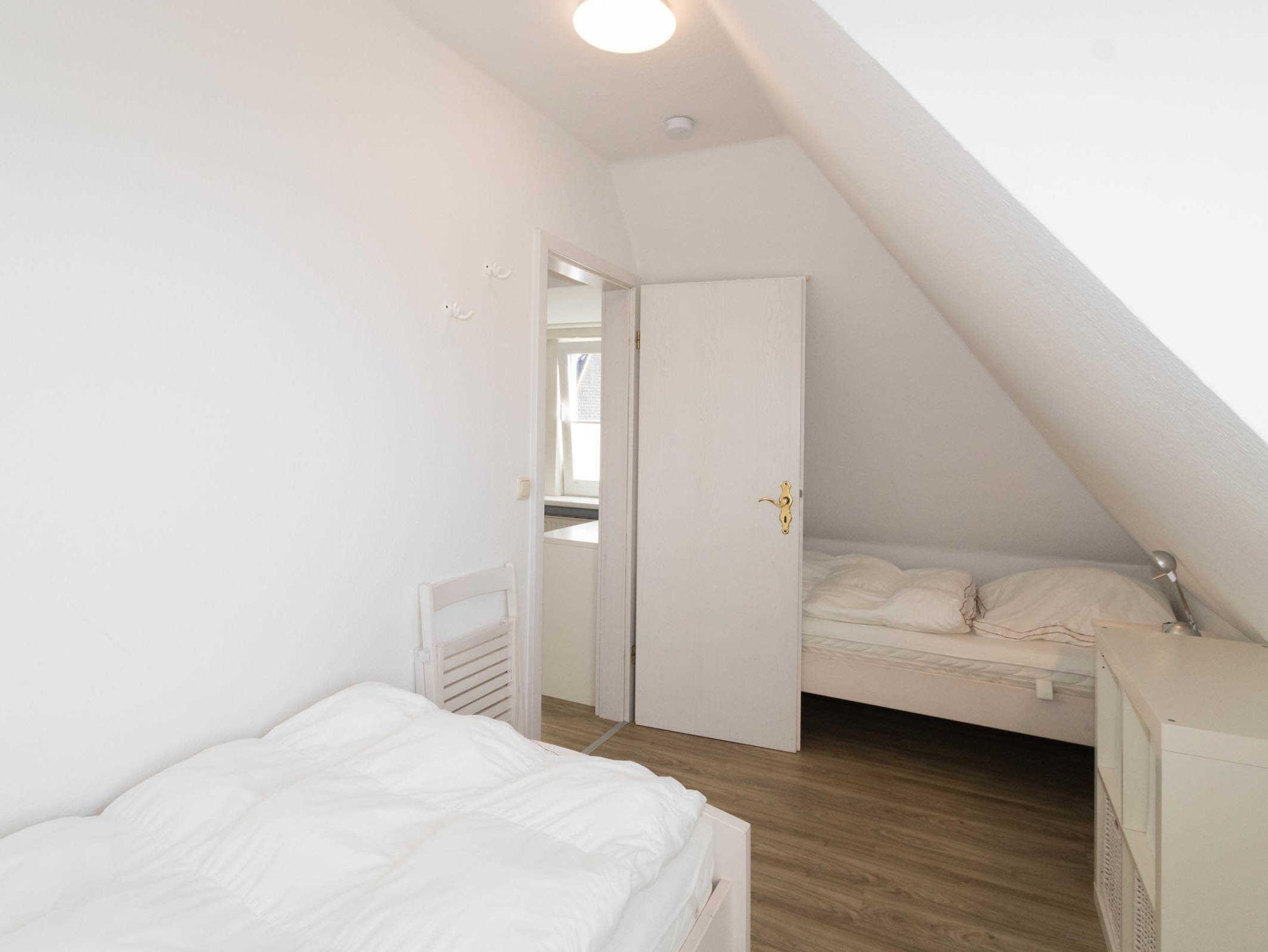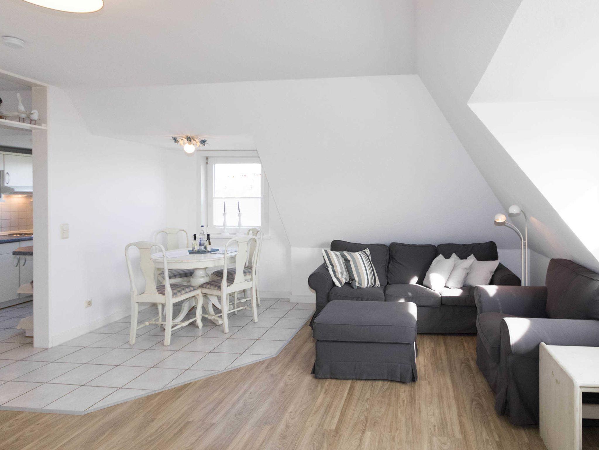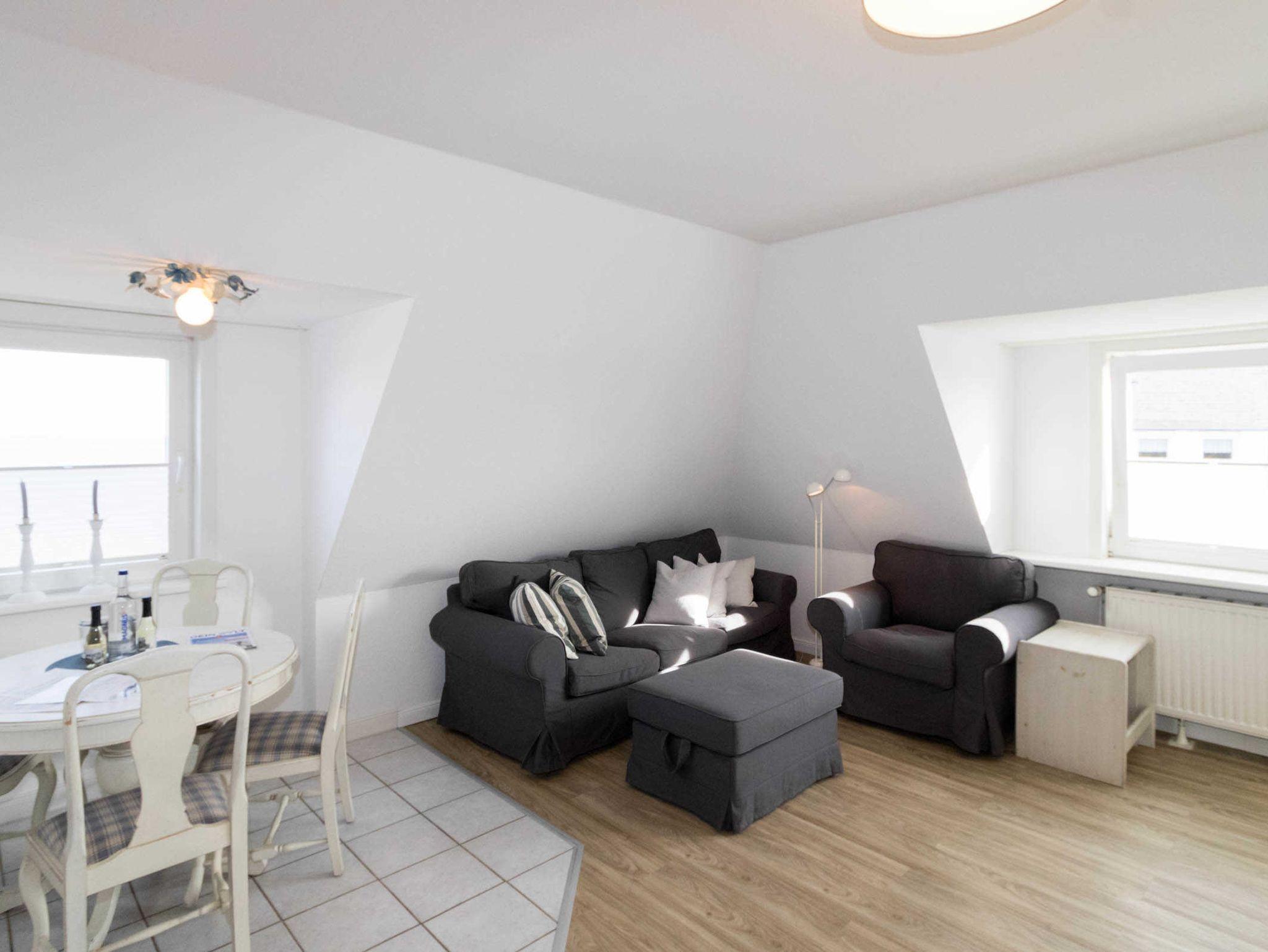 Die Wohnung verfügt über eine sep. kleine Küche, einen Wohnraum, der mit Esstisch für 4 Personen ausgestattet ist. Im Wohnraum befindet sich auch ein Schrankbett (140 x 190cm). Ein Nebenzimmer mit 2 Einzelbetten bietet die Schlafgelegenheit für die 3. und 4. Person. Das Duschbad ist innenliegend.