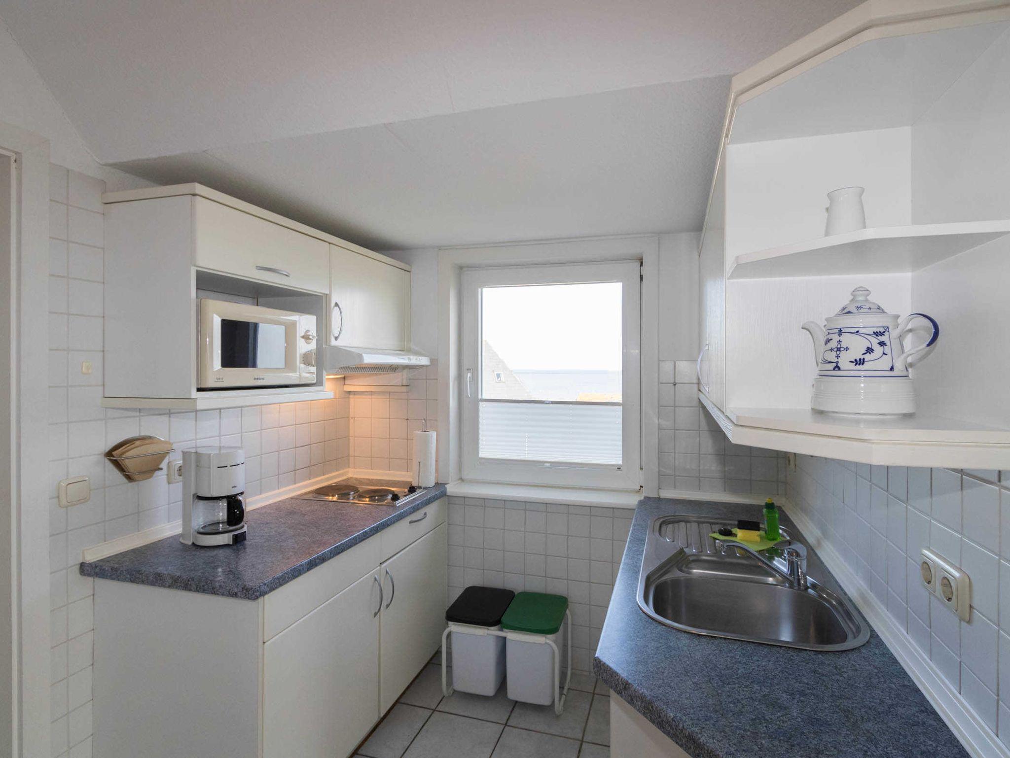 Die sep. kleine Küche ist mit einem 2-Platten-Herd und Mikrowelle ausgestattet.