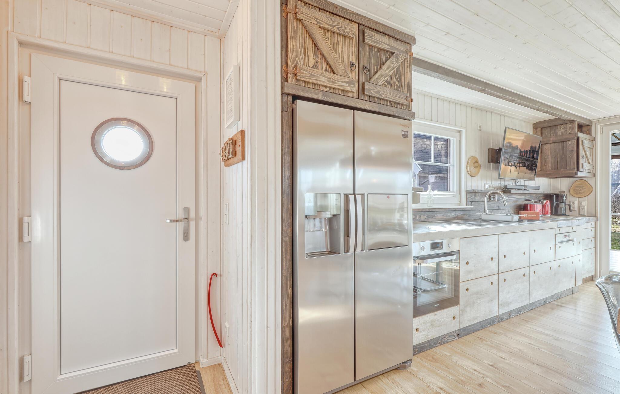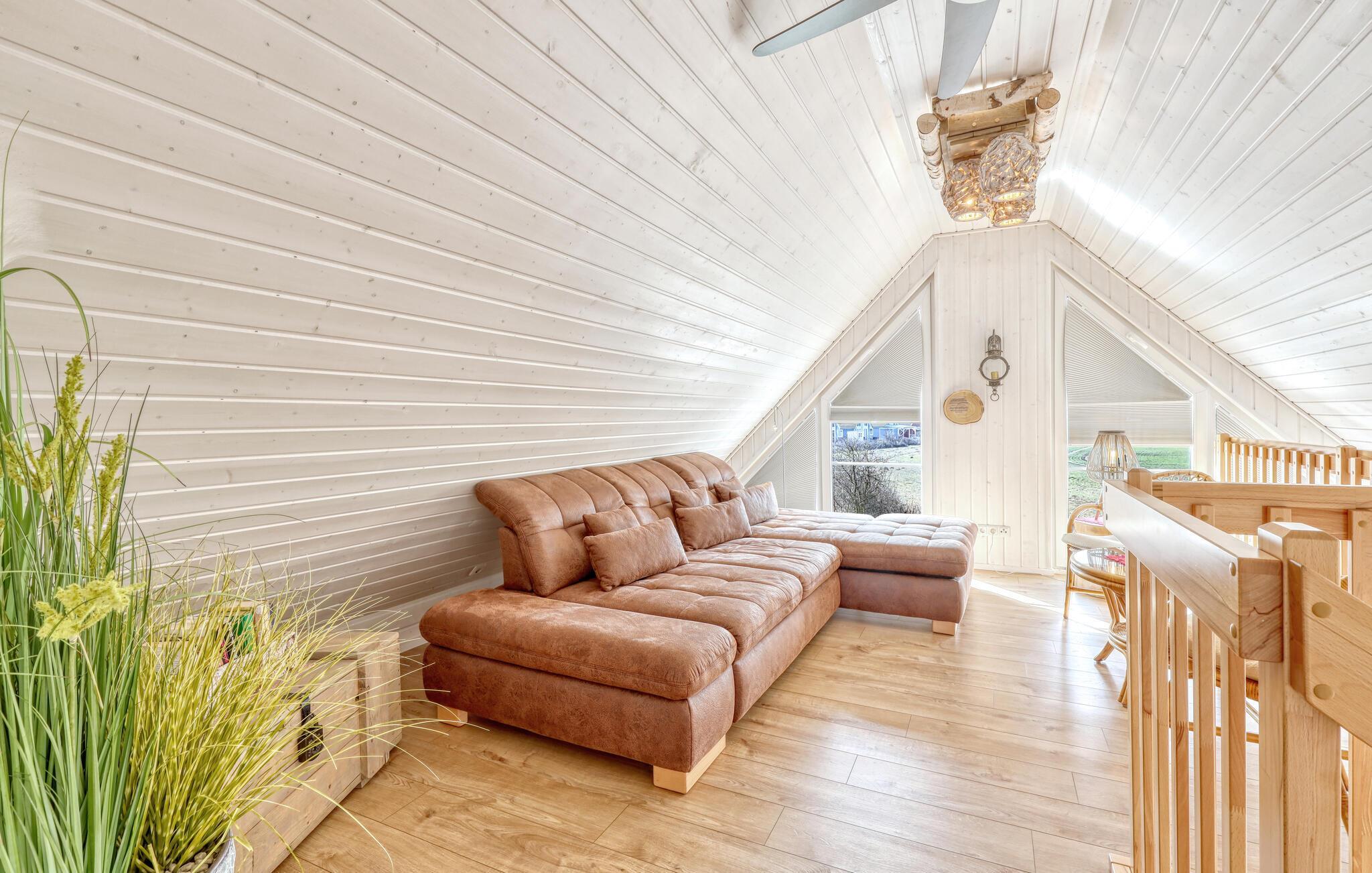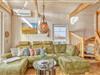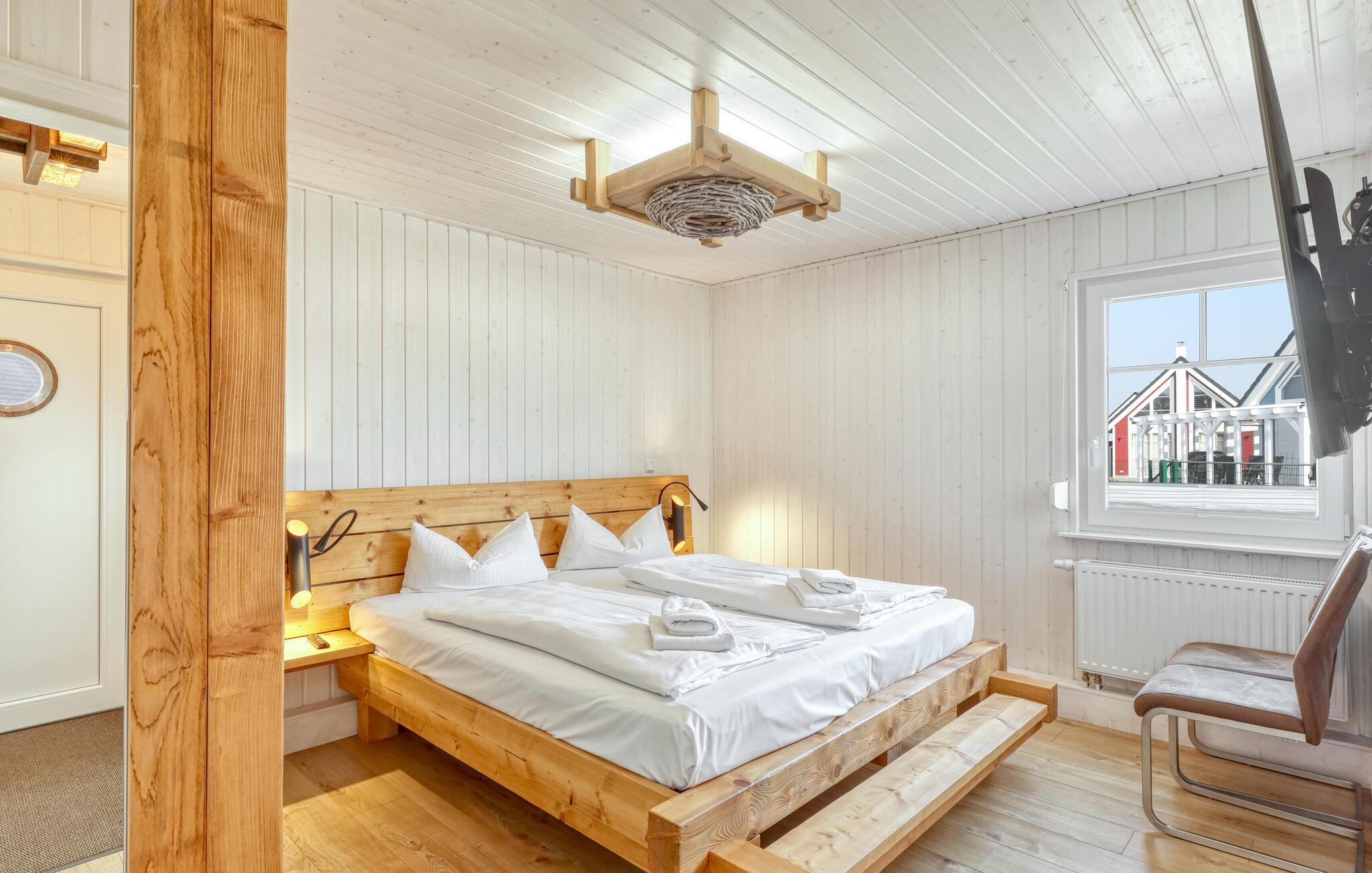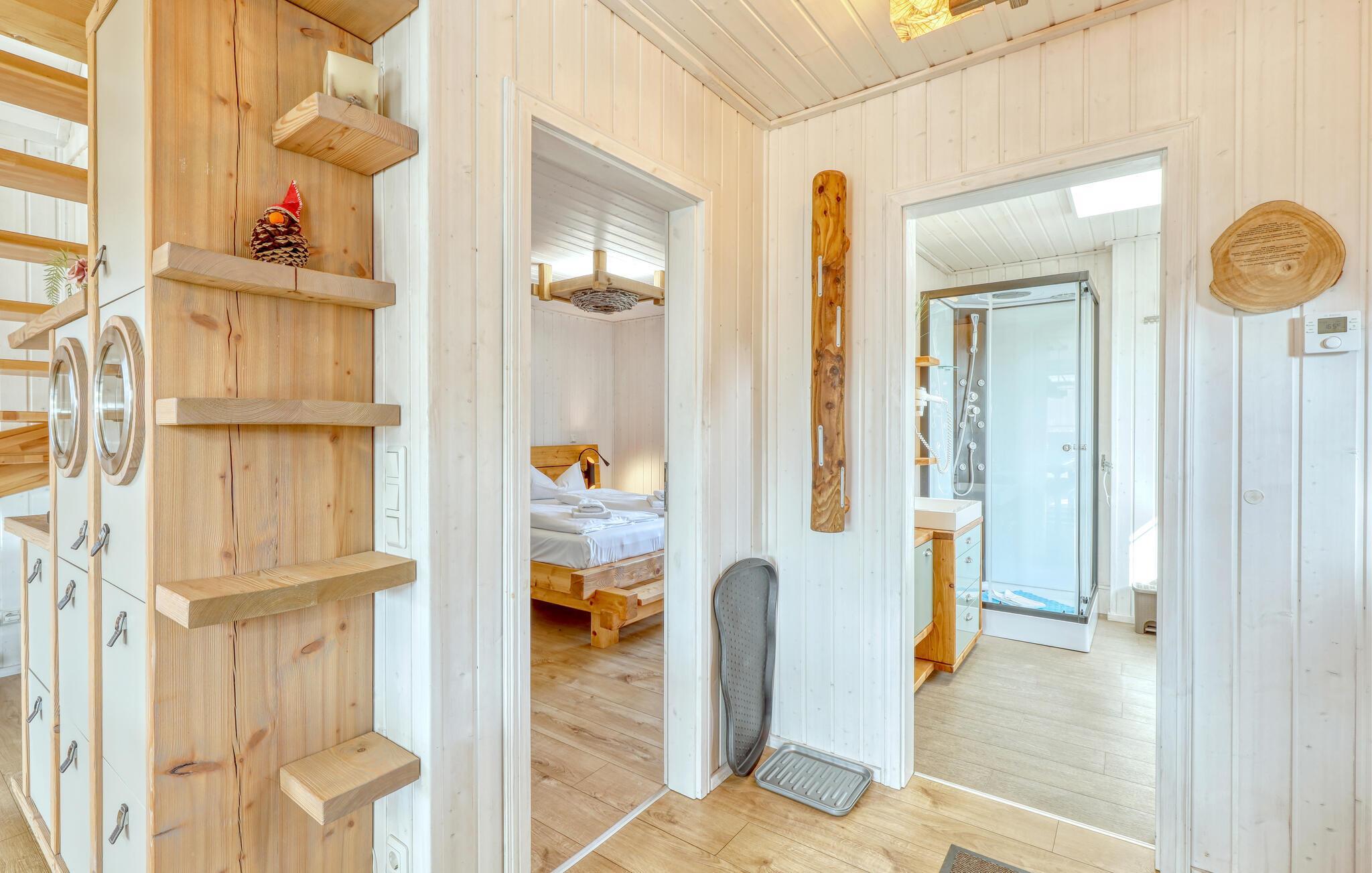Es gibt zwei separate Schlafzimmer, auf der offenen Galerie bietet die Schlafcouch (1,50 x 3,00) zwei weitere Schlafplätze. Hier können Sie den Blick durch die großen Panoramafenster genießen. Im Wohnbereich ist ein kamin für gemütliche, besinnliche Stunden vorhanden. In der Küche finden Sie einen Kühlschrank in Kombination mit Tiefkühlung und Wasser- & Eisspender für die heißen Tage. Sogar eine kleine Waschmaschine steht bereit für den Notfall oder für ein ungewolltes Missgeschick. Des weiteren befinden sich in allen Räumen ein TV. Im Wohn- und Küchenbereich ist dieser noch mit einer Soundbar aufgewertet worden.