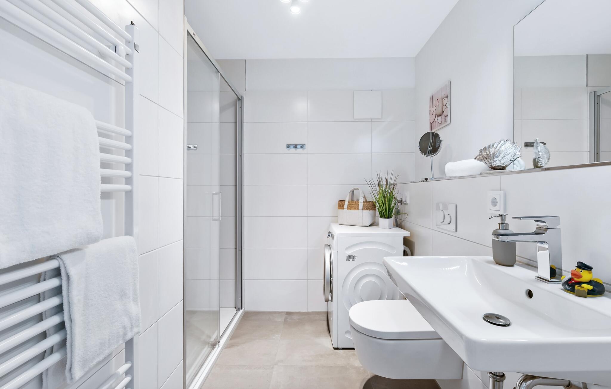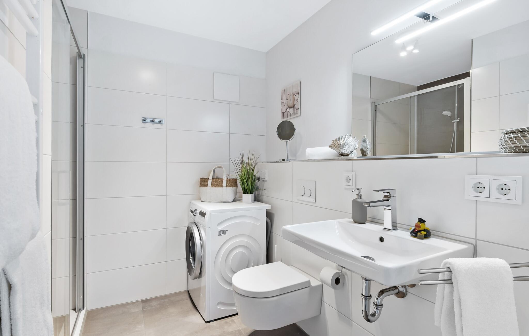 Das schöne Bad verfügt über eine moderne, bodengleiche Dusche, eine Waschmaschine und einen großen Spiegel.