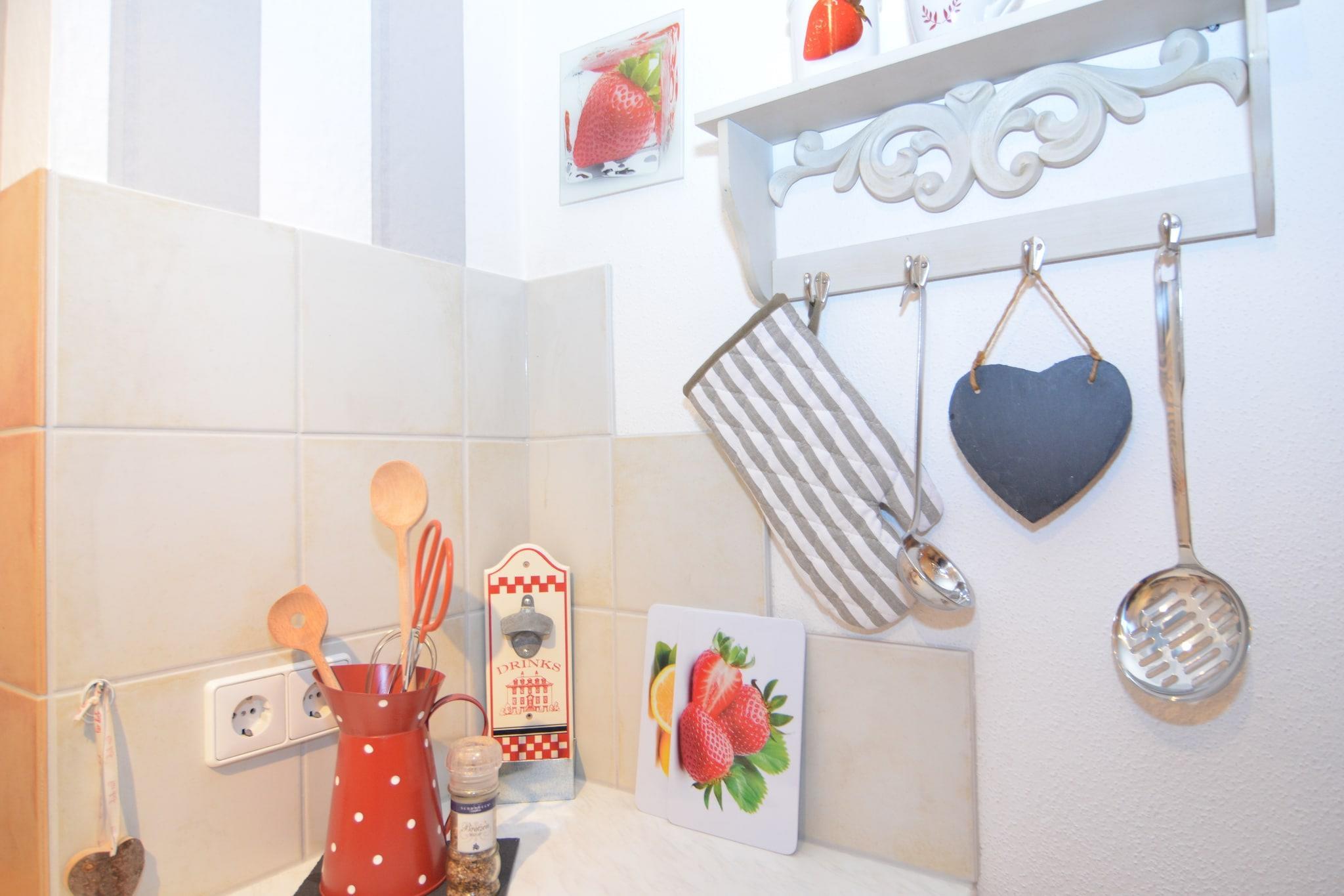 In der 1. Etage: (Eingang(über Außentreppe), offene Küche(Kochherd(Ceranfeld), Kaffeemaschine, Backofen, Spülmaschine, Kühl-/Gefrierkombination), Wohn/Esszimmer(Herd(Holz), Kinderbett, Hochstuhl), Schlafzimmer(Doppelbett), Badezimmer(Dusche, Waschbecken, Toilette), Flur) Radio, Grill, Balkon, Heizung(Zentral, Fußbodenheizung), Garten(50 m2), Gartenmöbel, Parkplatz