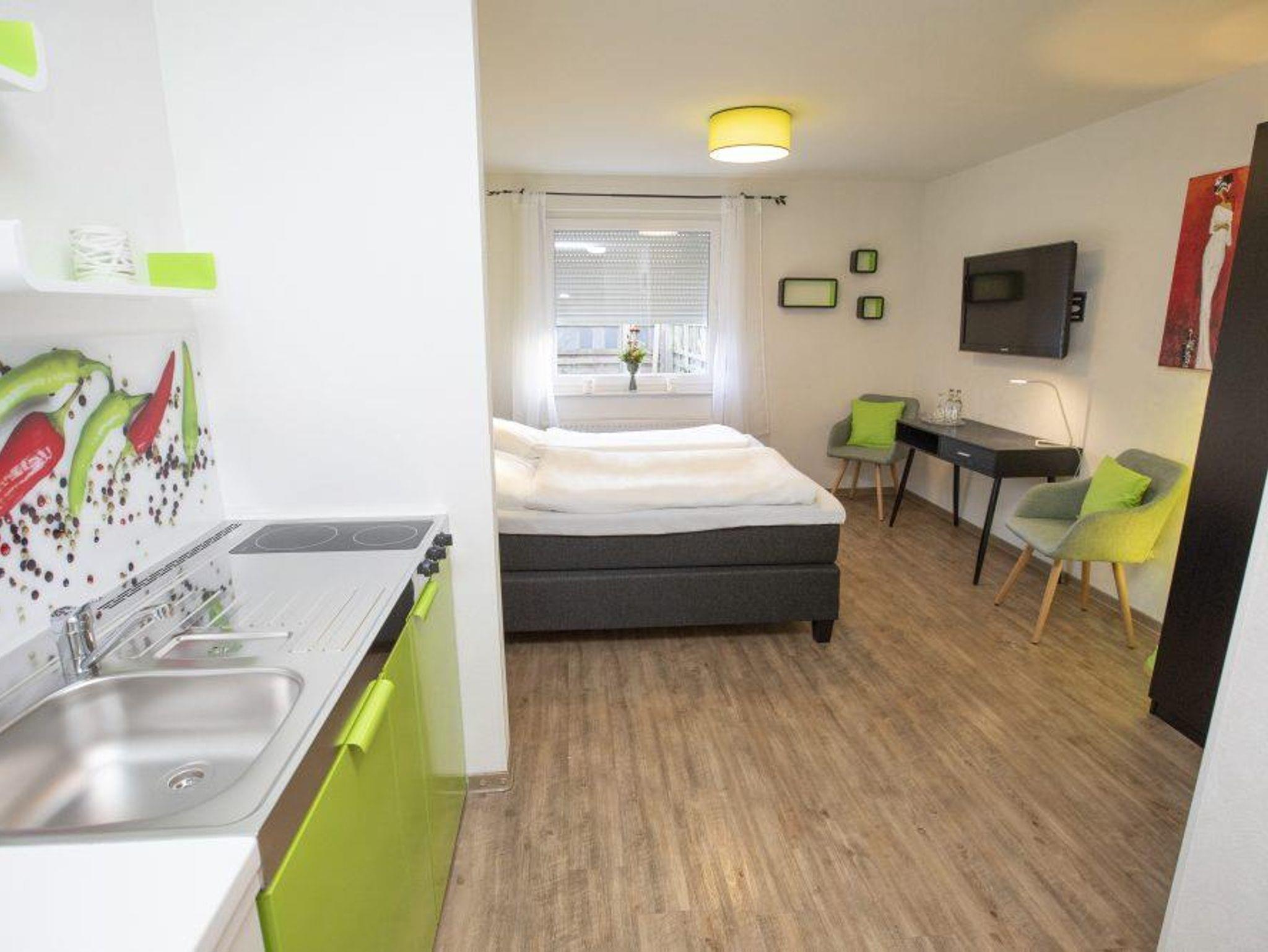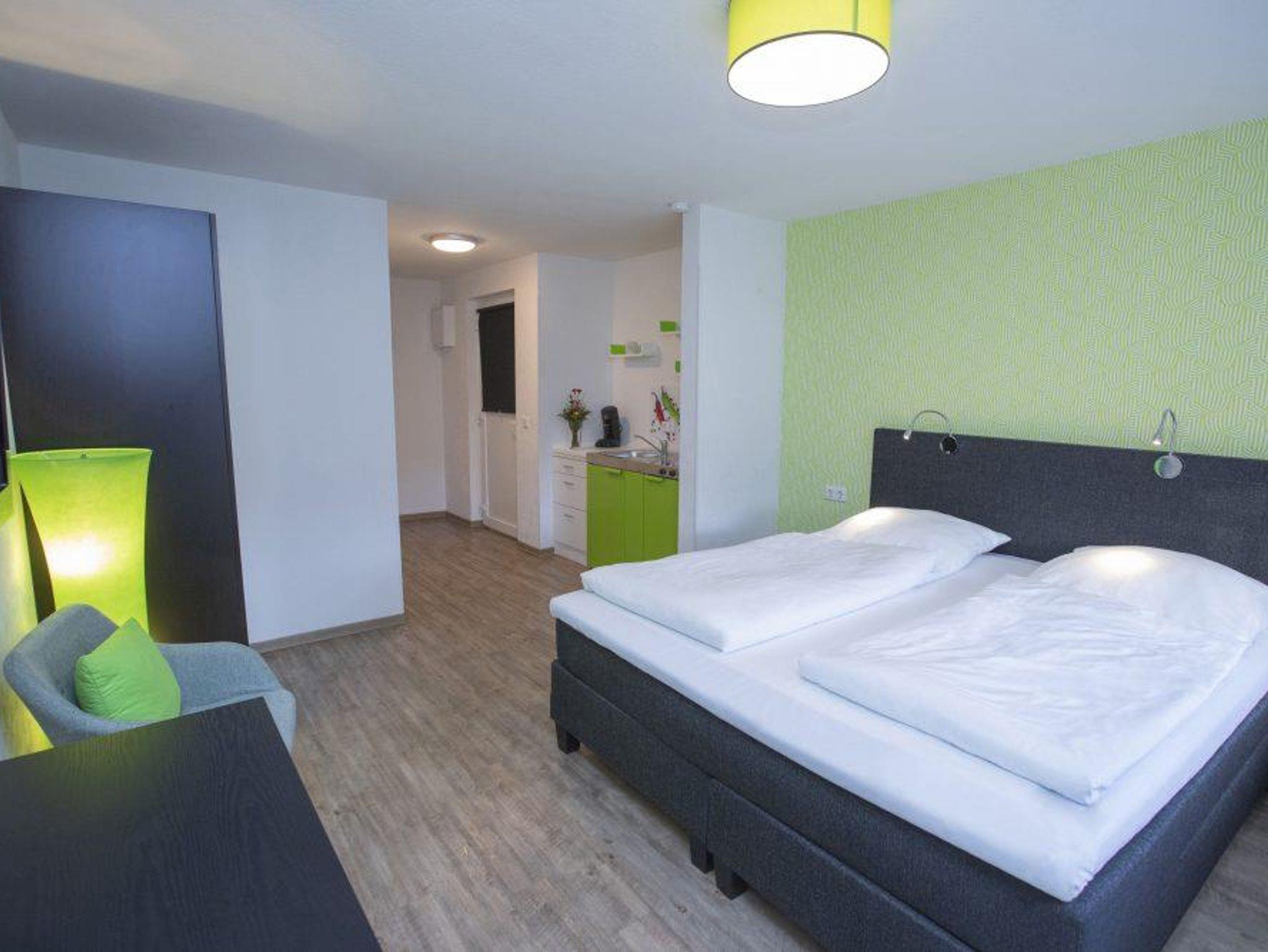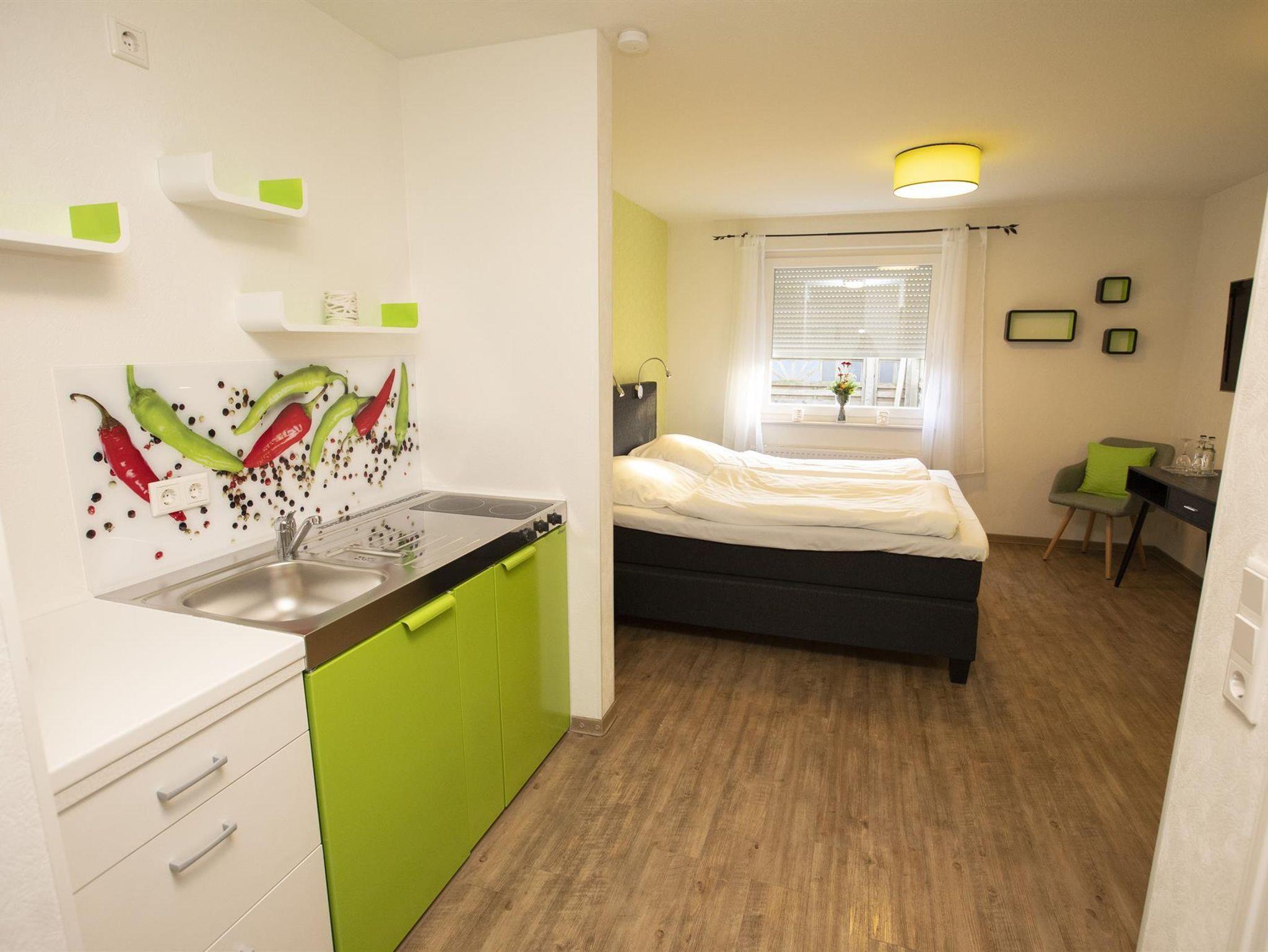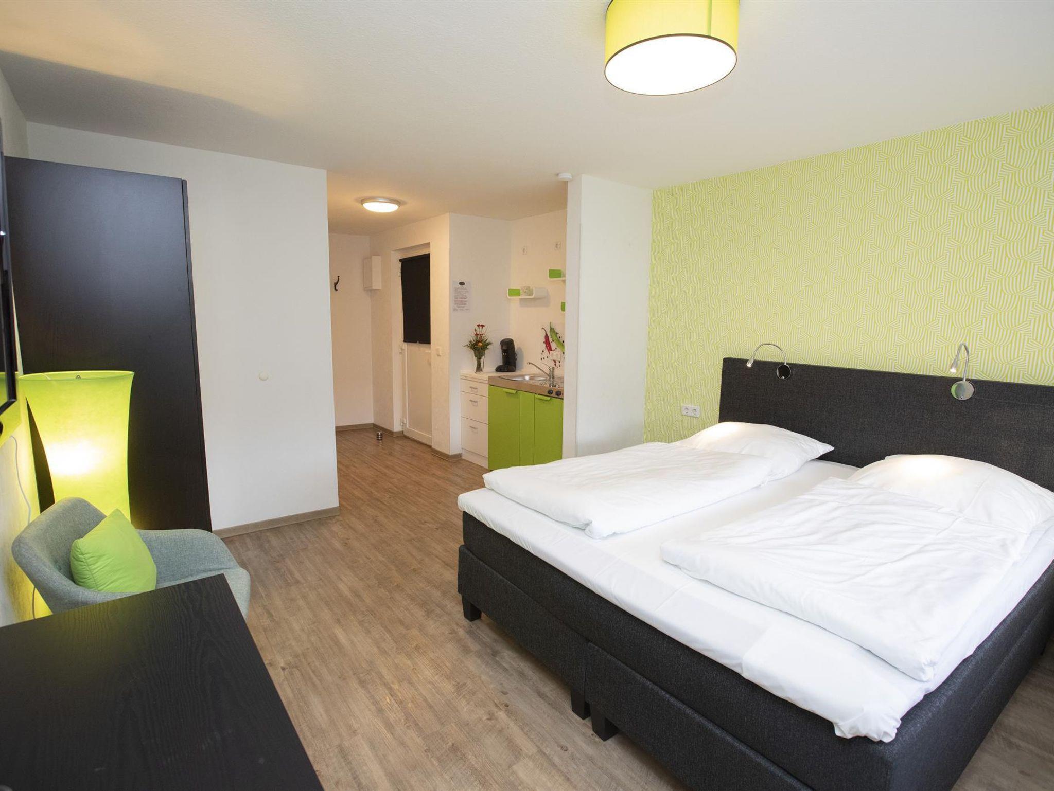 Neue Appartementanlage mit gemütlichen Zimmern und Ferienwohnung Im neuen Haus werden unsere Gäste von 6 hellen Doppelzimmern, 1 Einzelzimmer und einem geräumigen 2-Raum-Appartement empfangen. Alle Zimmer sind mit eigenem Bad, Dusche, kostenfreier Kaffeemaschine, Schreibtisch, 40-Zoll Flachbildschirm und Singleküche ausgestattet. Es gibt WLAN Internet und ausreichend Parkplätze, direkt am Haus. Die Räume sind rauchfrei, Haustiere sind auf Anfrage im eigenen Körbchen gestattet. Für den zusätzlichen Aufwand bei der Reinigung, berechnen wir € 10,00 pro Nacht.