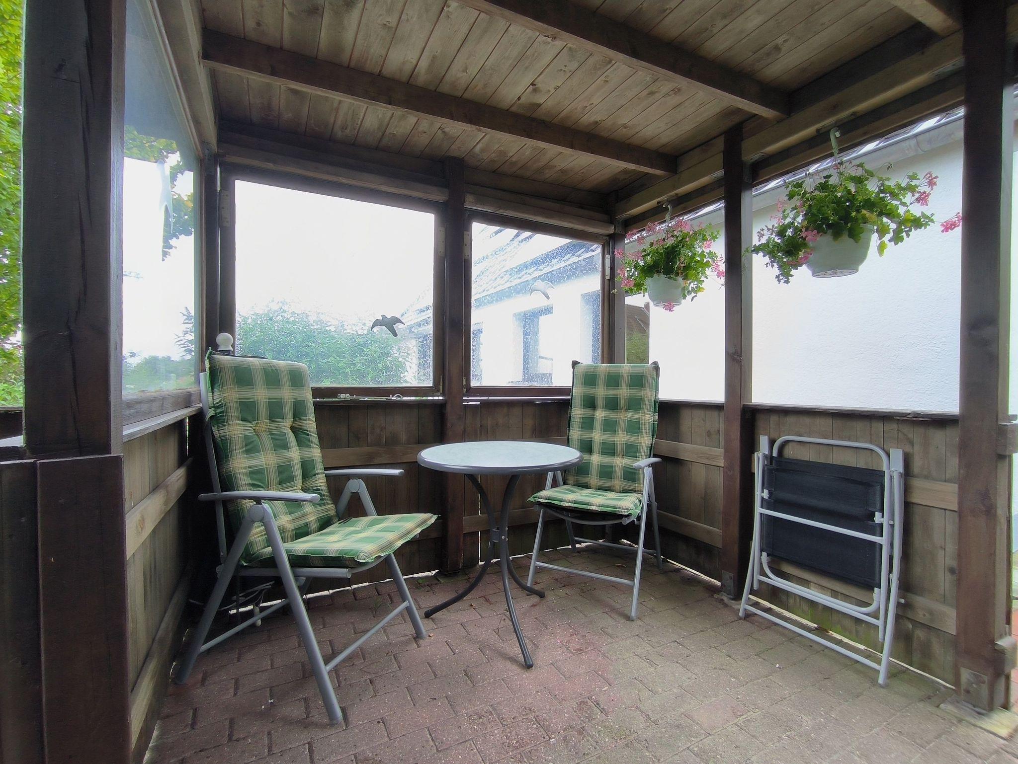 Im Eingangsbereich der Wohnung geht vom kleinen Flur das moderne Badezimmer mit Toilette, Waschbecken und Dusche und Fenster ab. Vom Flur weiter geradeaus geht es in die gut ausgestattete Küche (Kochfeld, Backofen, Wasserkocher, Kaffeemaschine) mit Esstisch und Stühlen. Von der Küche gehen das Schlafzimmer und das Wohnzimmer ab. Im Schlafzimmer gibt es ein Doppelbett (zwei zusammengestellte Betten) und einen großen Kleiderschrank. Das Wohnzimmer ist mit Sofa, Lesesessel, TV und noch einem kleinen Tisch ausgestattet. Zur Ferienwohnung gehört eine kleine Gartenlaube hinter dem Haus und mit Blick in den hübschen Garten: hier können sie windgeschützt und trocken sitzen.