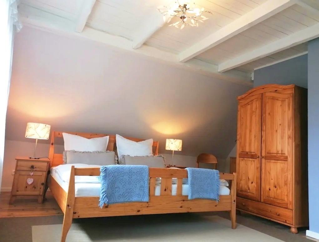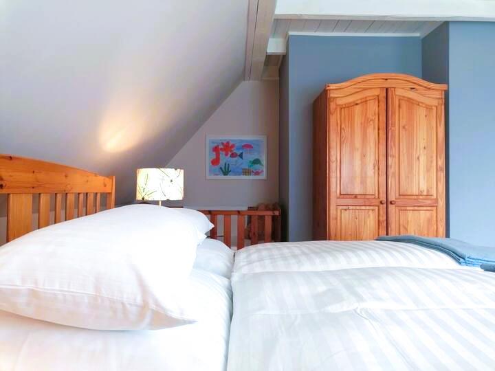 Das große Schlafzimmer mit einem Doppelbett 1,80 x 2,00 m sowie dem Einzelbett 0,90 x 2,00 m befindet sich im Obergeschoss, hier ergänzt durch ein WC en Suite.
