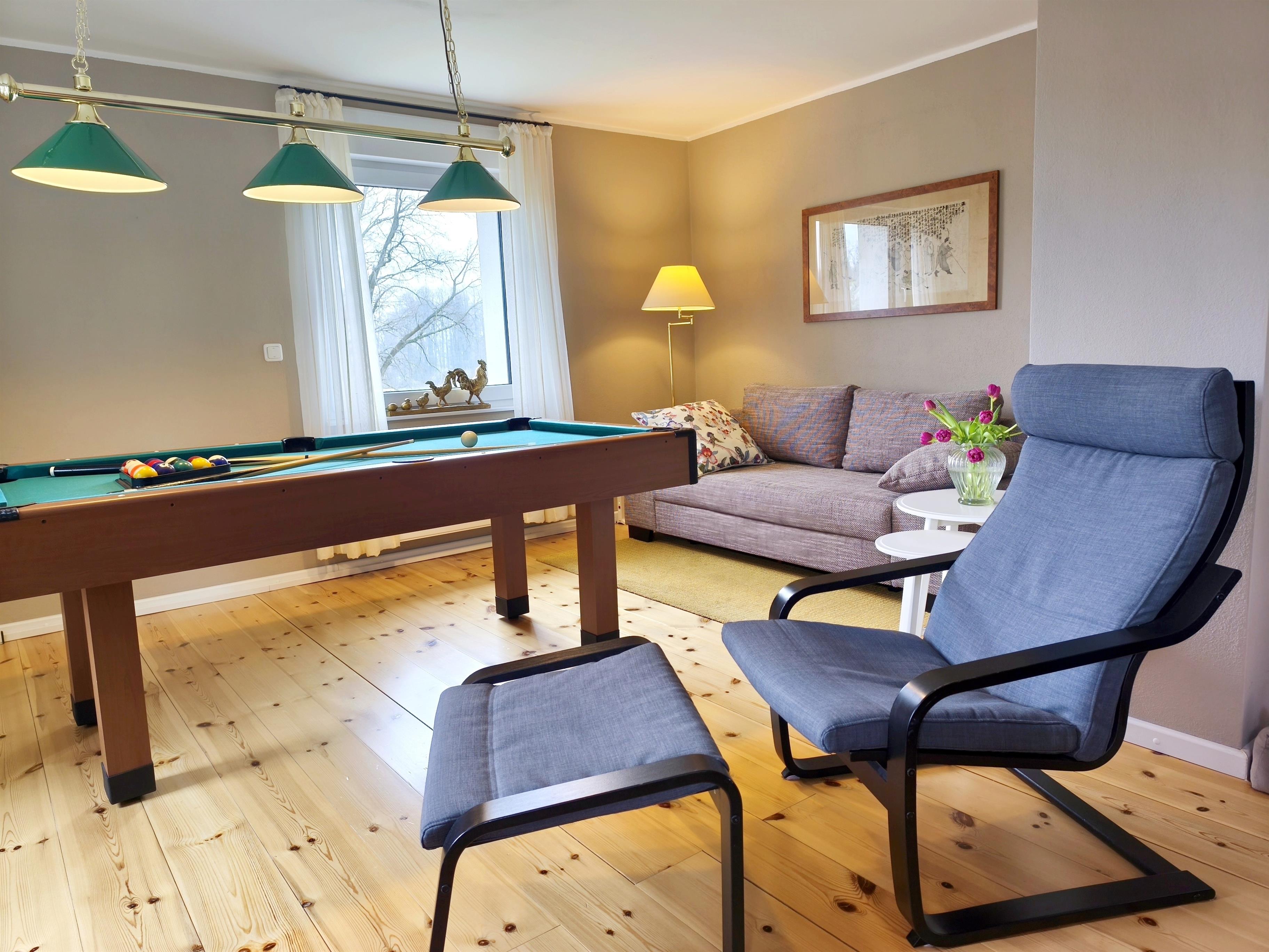 Hier stehen auch der Billardtisch, ein großer Esstisch und eine bequeme Sitzecke für Sie bereit. Netflix and chill auf 43 Zoll oder eigene Konsole an den TV, mit unserem kostenlosem W-LAN ist alles möglich .