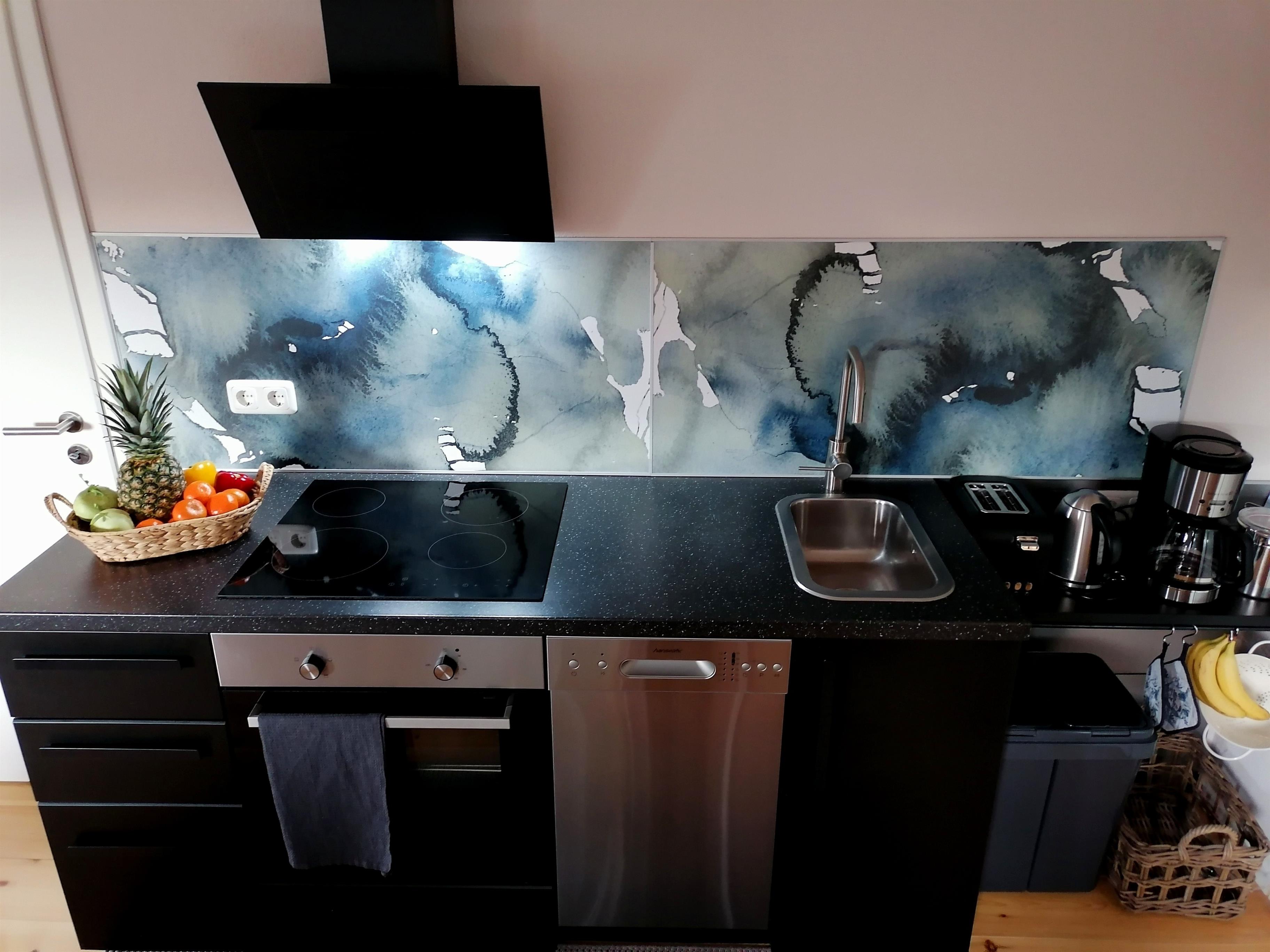 Die komfortabel eingerichtete Küchenzeile bietet alles was es für die Lust am Kochen braucht (Kaffeemaschine, Wasserkocher, Toaster, Ceran-Kochfeld, Backofen, Mikrowelle, Kühlschrank mit Gefrierfach).