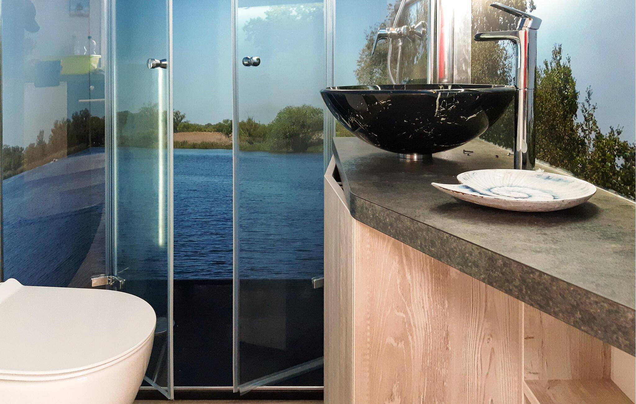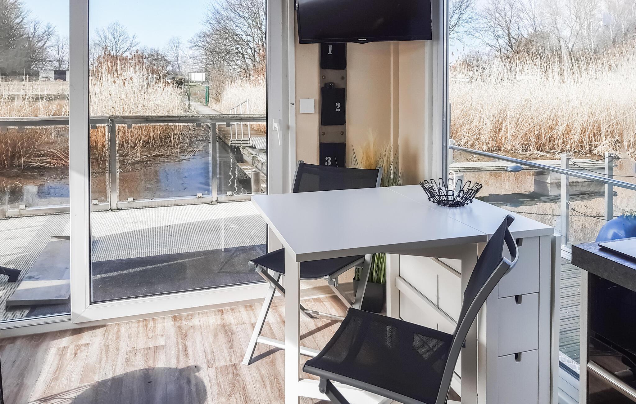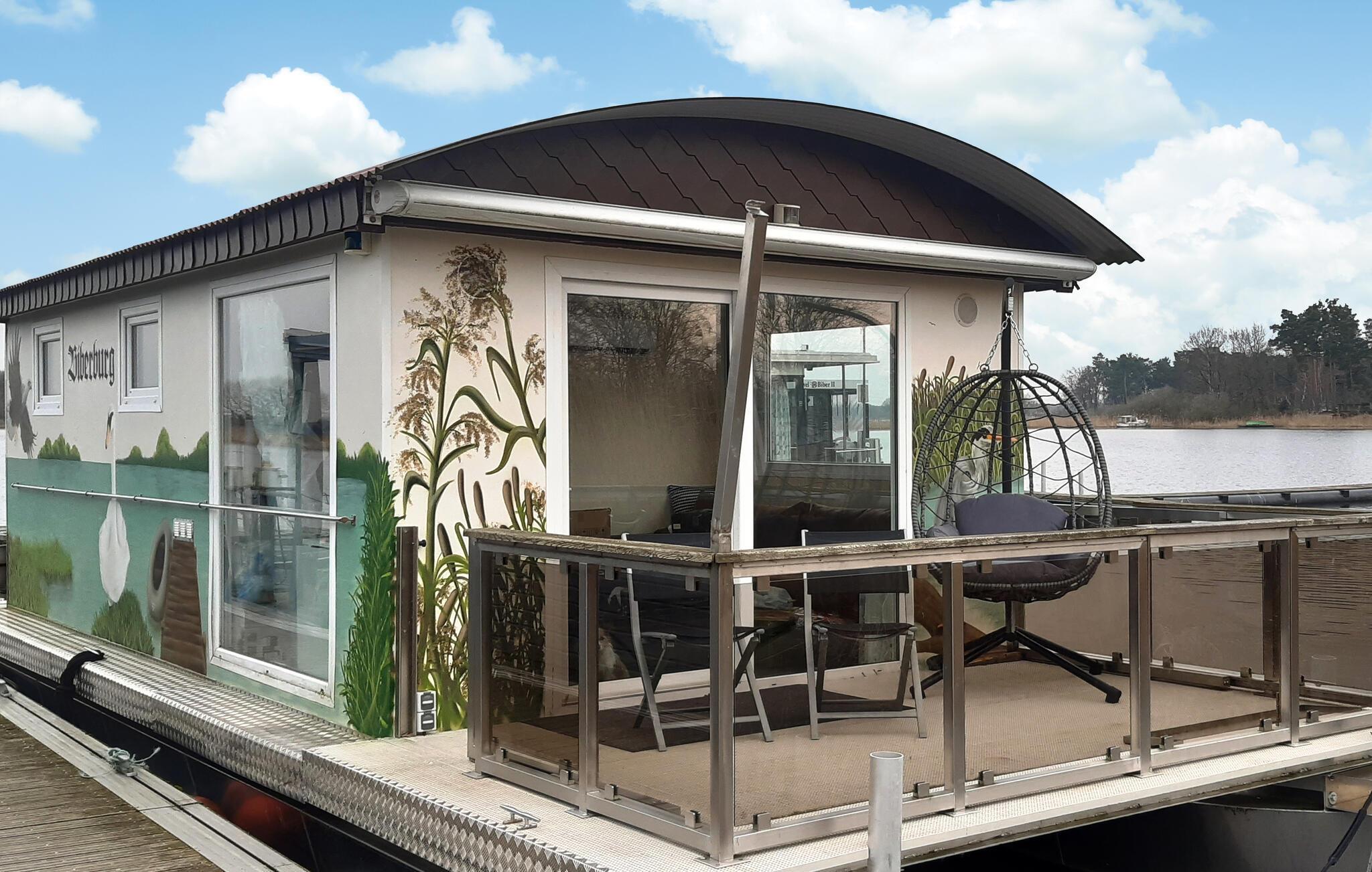 Hier können Sie von der Terrasse aus, direkt in die Pfanne Angeln oder einfach nur den Blick übers Wasser schweifen lassen. Das schwimmende Haus liegt fest verankert am Steg. Die solide und zweckmäßige Ausstattung mit viel Liebe zum Detail sorgt für erholsame Stunden im gemütlichen Ambiente. Ein kleines Schlafzimmer mit einem Doppel- und einem Hochbett sowie einem Schlafsofa im Wohnzimmer mit freiem Blick auf den See. Hier können Sie die Zeit vergessen und einfach die Natur genießen.