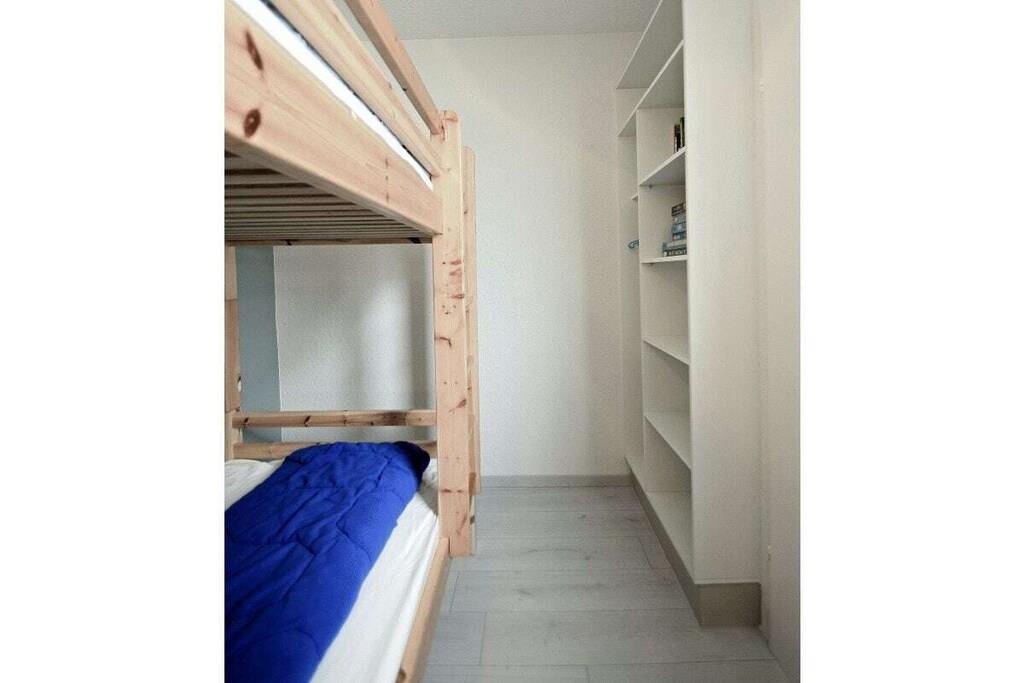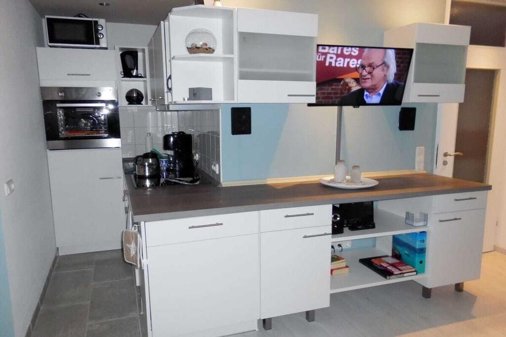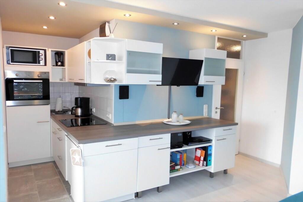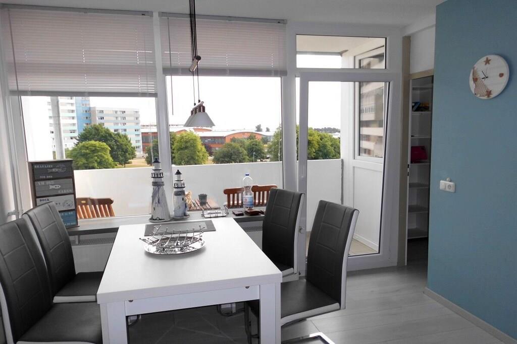 Unsere komplett sanierte und völlig neu ausgestattete Ferienwohnung wird Ihr Urlaubswohlgefühl vom ersten Tag an steigern.. Unsere Wohnung - mit Balkon - befindet sich in der 4. Etage mit Blick in den parkähnlichen Garten und auf Binnensee und Ostsee. Sie wurde komplett neu möbliert, ausgestattet mit neuem Fenster, Balkontür, Küche, hochwertigen Fliesen und Laminatböden, Einbaustrahler in LED- Technik. Unsere Ferienwohnung verfügt über ein Wohnzimmer mit integriertem Essbereich, von wo aus Sie bereits einen sehr schönen Ausblick haben. Eckcouch mit Ottomane - Federkern, Esstisch mit 4 Stühlen, LED Fernseher, CD- Anlage DVD- Player. Die angeschlossene, halb offene Küche beinhaltet: Spülmaschine, Backofen mit Umluft, Ceranfeld, großer Kühlschrank mit Gefrierfach, Mikrowelle sowie eine Dunstabzugshaube mit Abluft. Kaffeemaschine, Eierkocher, Toaster, Wasserkocher, Gewürzschrank etc. Geschirr und Besteck ist für 6 Personen vorhanden. Das Elternschlafzimmer ist mittels einer festen Wand mit Fenster zum öffnen, vom Wohnbereich abgetrennt, durch eine Tür vom Flur aus zu erreichen. Das Doppelbett hat 2 hochwertige Taschenfederkern Einzelmatratzen von 90 x 200 cm, mit verstellbaren Lattenrosten, sowie eine Kommode und Ganzkörperspiegel. Das Kinderzimmer grenzt an die Küche an, und kann mit einer Tür verschlossen werden.Ein separater Heizkörper sorgt auch hier für ausreichend Wärme. Die Wände sind nach außen gedämmt. Ein großes Fenster zum Balkon versorgt dieses Zimmer mit ausreichend Tageslicht und frischer Luft. Ein sehr stabiles Etagenbett mit genügend Zwischenraumhöhe. Die beiden hochwertigen Matratzen sind jeweils 90 x 200 cm groß. Pro Bett eine Nachtlampe. Daneben eine Ablagefläche mit einer kleinen Stereo- Kompaktanlage. Das Bad mit grauen Schieferboden ist mit der neuesten Technik ausgestattet, Duschkabine, Handtuchwärmer, Spiegelschrank, Fön. Im Flur befindet sich ein großer Wandschrank, ein Schrank für Reinigungsutensilien sowie die Garderobe. Der Balkon ist möbliertW- LAN steht meinen Gästen kostenlos zur Verfügung