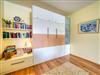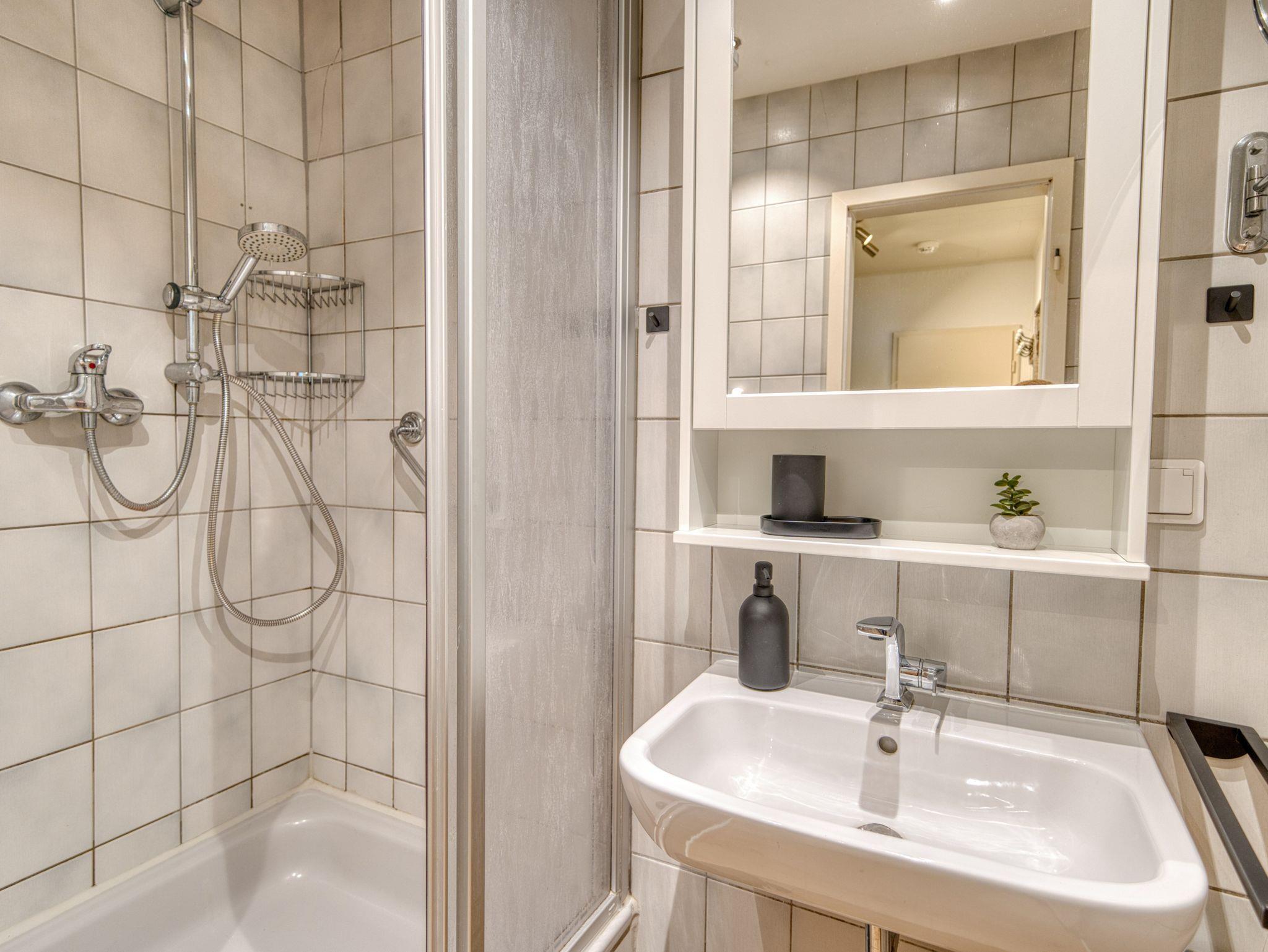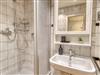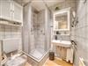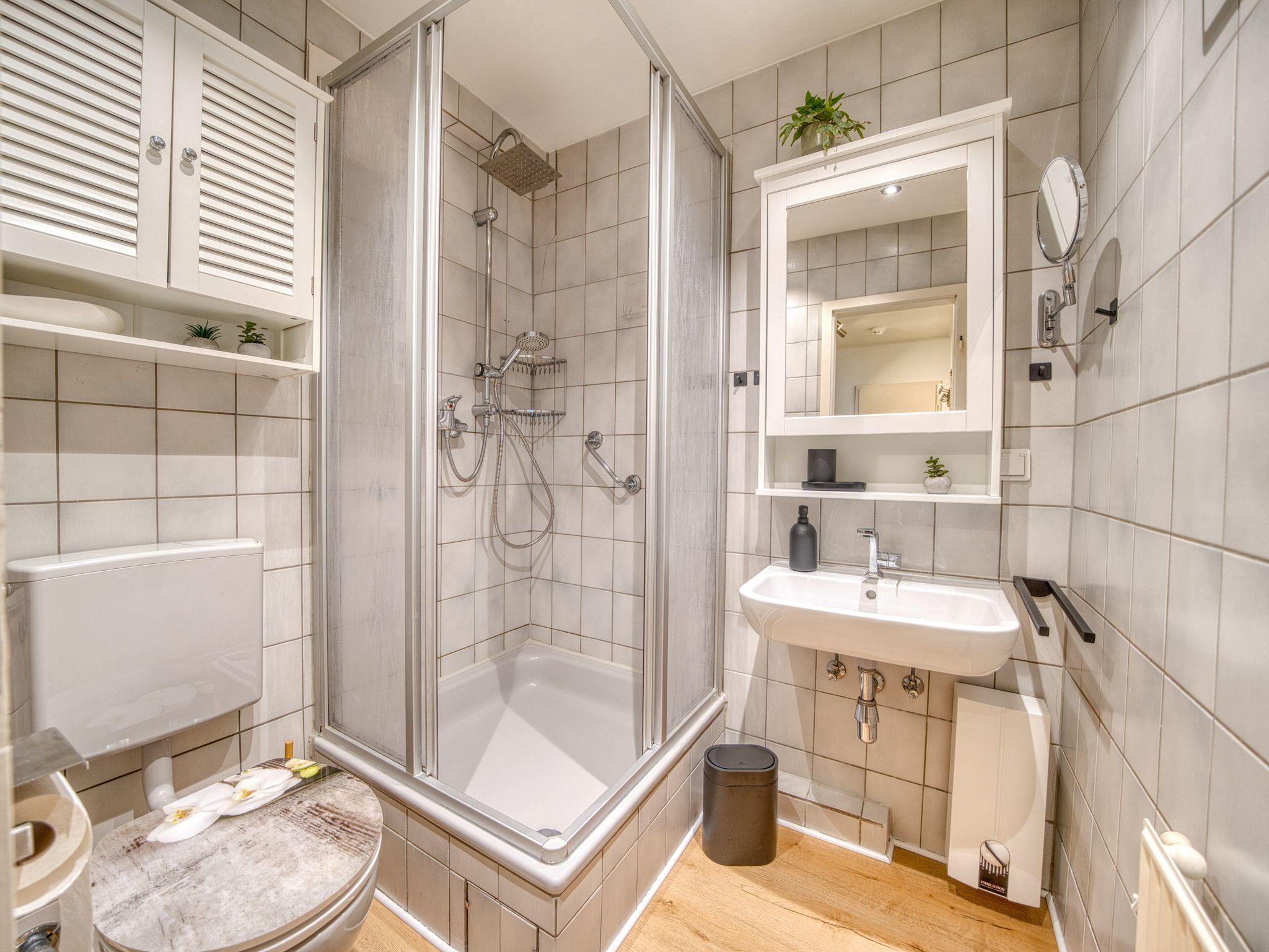 Badezimmer mit Duschkabine, WC und Waschbecken
