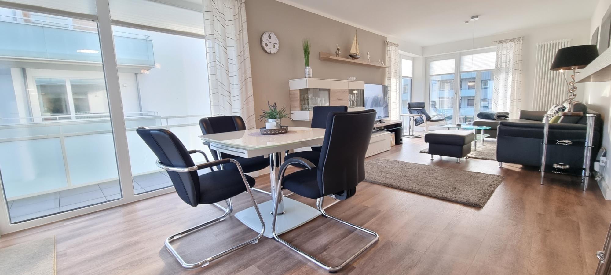 Der helle, großzügige Wohn- und Essbereich lädt zum Verweilen und entspannen ein.Der Essbereich bietet großzügigen Platz mit wunderschönem Blick auf die Ostsee. Auf dem 90°-Balkon finden Sie ein windstilles Plätzchen, an dem Sie beim Entspannen die frische Seeluft genießen können.