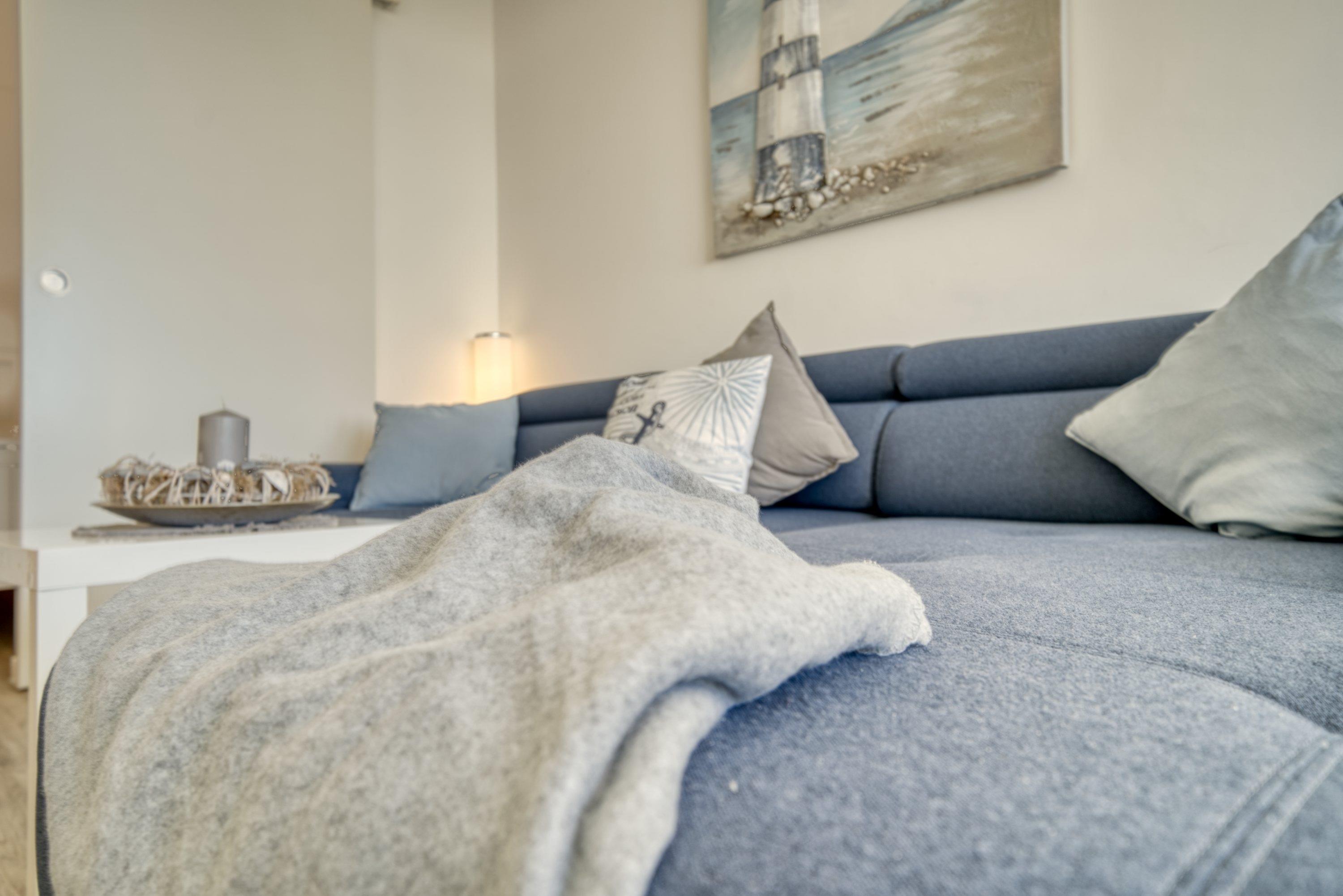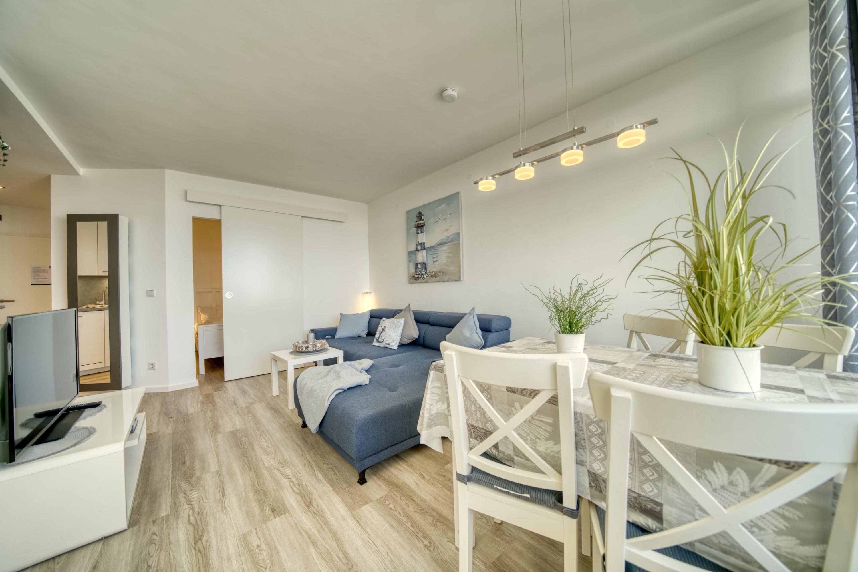 Offener Wohnbereich mit Couch, Essplatz für 4 Personen und Smart-TV, separater Elternschlafbereich mit Doppelbett und TV, Kinderzimmer mit Etagenbett und zusätzlichem TV. Balkon mit Panoramaausblick auf Ostsee und Binnensee. Küche mit Ceranfeld, Backofen, Spülmaschine, Mikrowelle, Kühlschrank mit Gefrierfach und diversen Kleingeräten. Modernes Bad mit Regendusche. WLAN inklusive. Nichtraucherwohnung, keine Haustiere, max. 4 Personen. Fahrstuhl, Fahrradräume, kostenfreier Parkplatz vorhanden. Strand ca. 300?m entfernt, Aktiv-Hus mit Schwimmbad, Sauna und Wellness fußläufig erreichbar.
