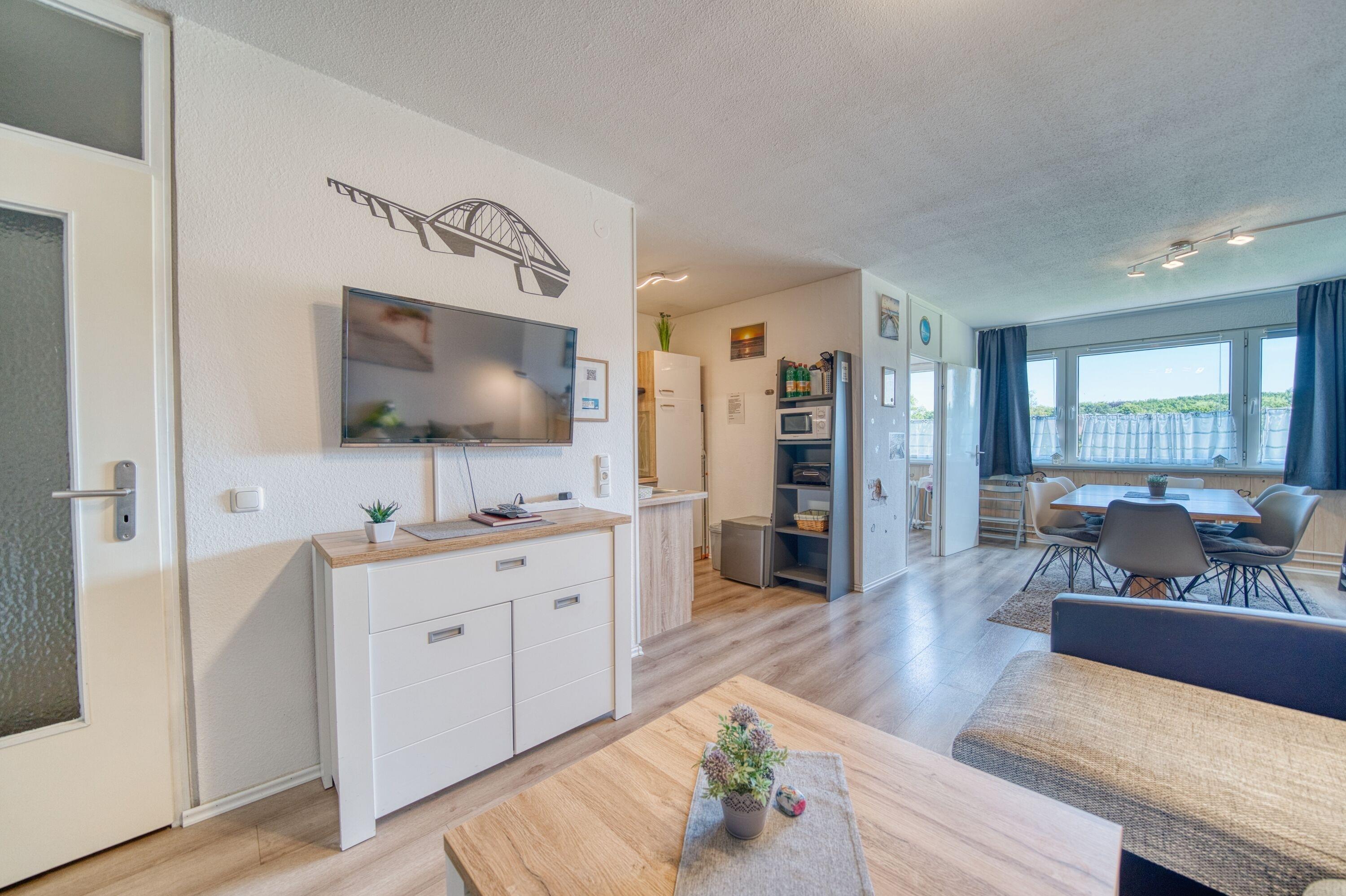 Die 53?m² große Wohnung im Haus O, 2. Etage, ist zur Südseite ausgerichtet und bietet Sonne sowie Blick auf die Salzwiesen. Das Wohn-Esszimmer verfügt über einen Wand-Fernseher, der Elternschlafraum über ein Doppelbett und das Kinderzimmer über ein Hochbett für eine dritte Person (90?×?200?cm). Die Küche ist komplett mit Kühlschrank, Gefrierbox, Backofen und 4-Platten-Ceranherd ausgestattet. Das Bad bietet WC und Duschkabine. Treppenhochstuhl, Kinderhochstuhl, Reisebett und Kinderspielweltkarte sind vorhanden.