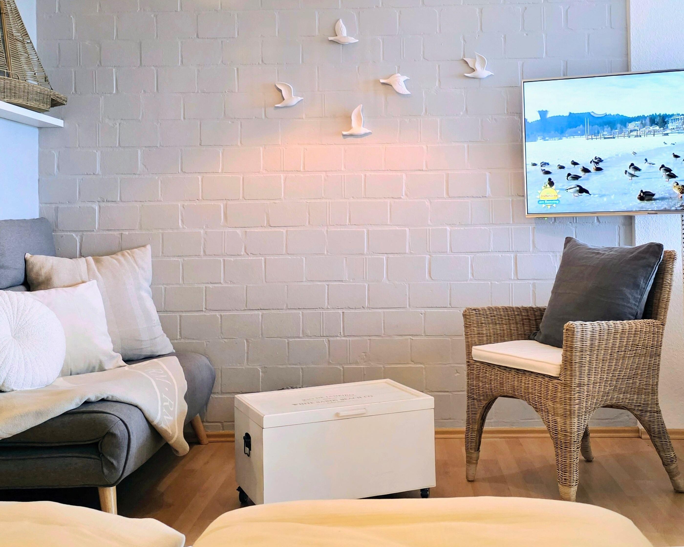 Wohn-/Schlafbereich mit Doppelbett und Schlafsofa, separates Schlafzimmer mit Doppelbett, TV in beiden Räumen, WLAN inklusive. Pantryküche mit Kühlschrank, 2-Platten-Herd, Mikrowelle, Kaffeemaschine, Wasserkocher und Toaster. Babybett, Kinderspielsachen, Eintritt „Schatzinsel“ inklusive. Saisonstrandkorb, Stellplatz nach Verfügbarkeit, Aufzug vorhanden.