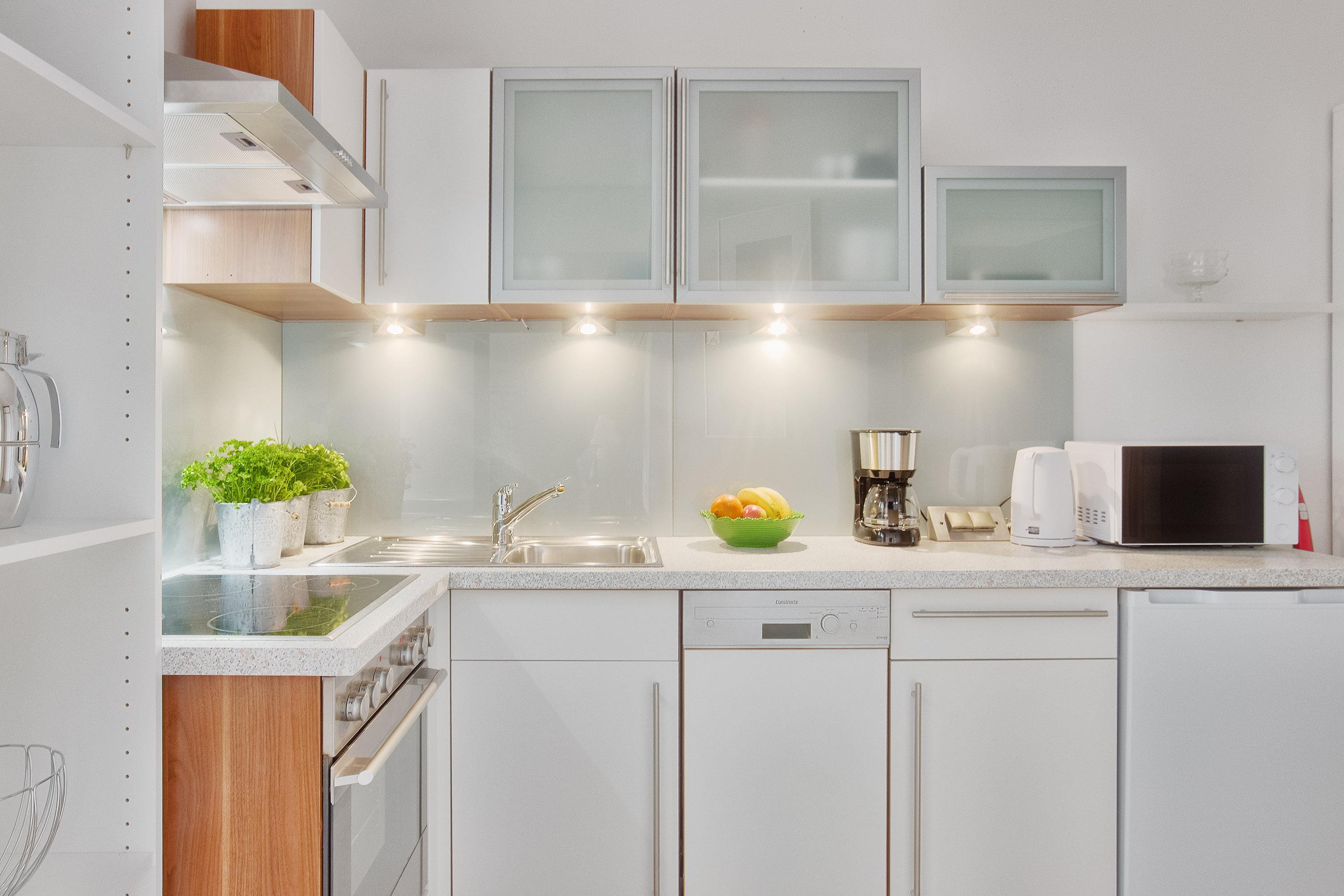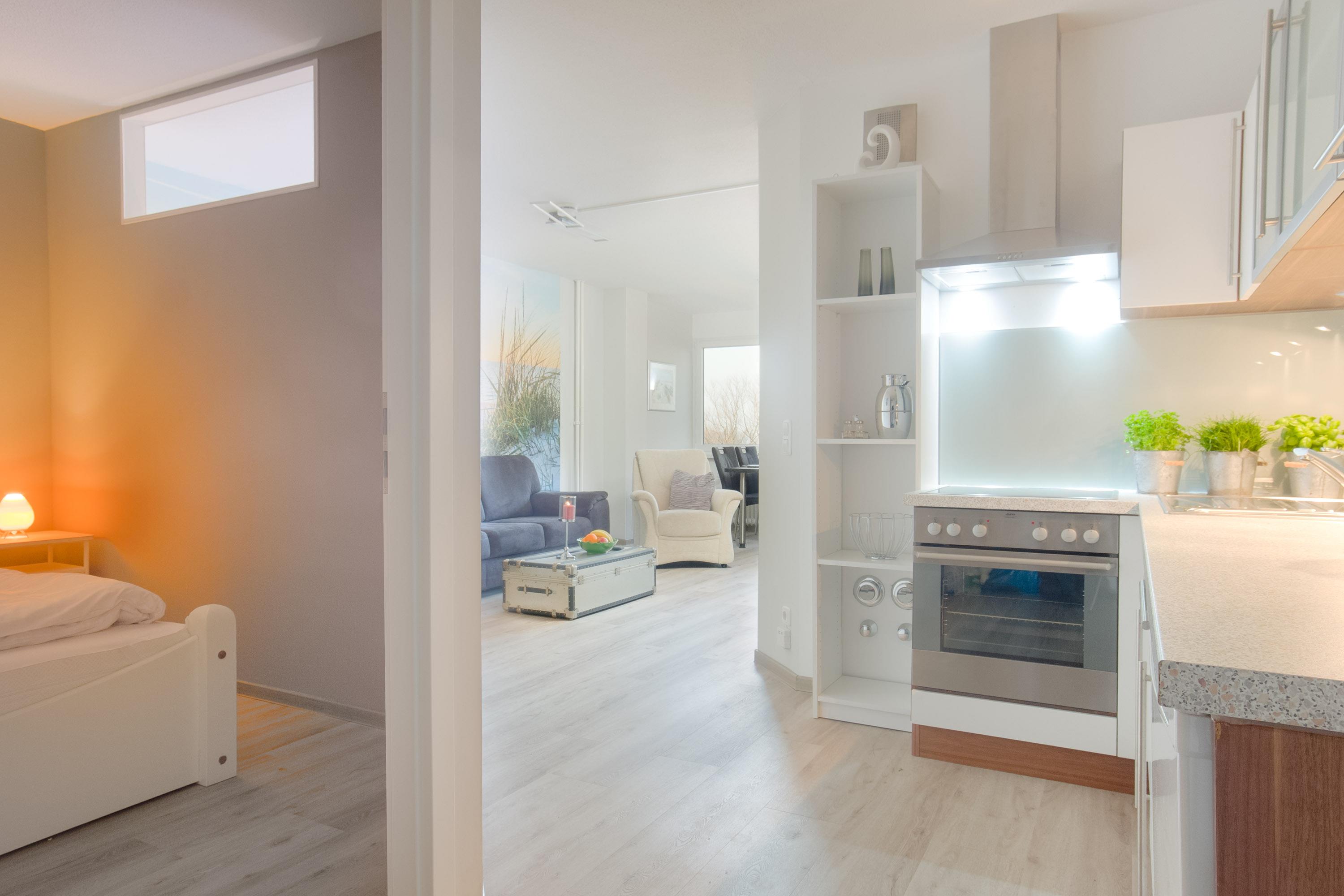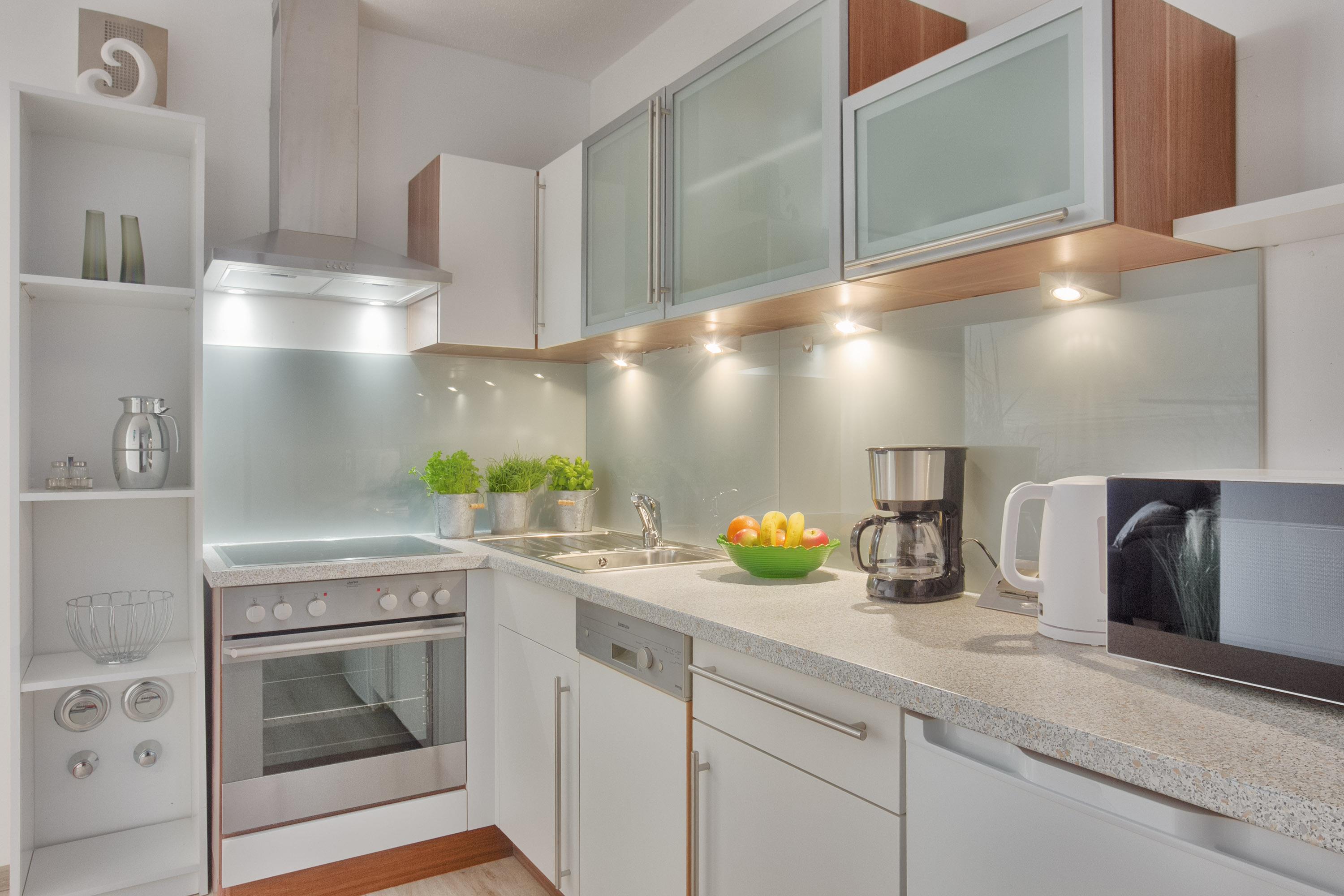 Auch die offene Küche wurde neben dem Wohnbereich komfortabel ohne störende Wände oder Türen integriert. Modern und durchdacht gestaltet, bietet Ihnen die Einbauküche alle Annehmlichkeiten für eine sorgenfreie Selbstversorgung.