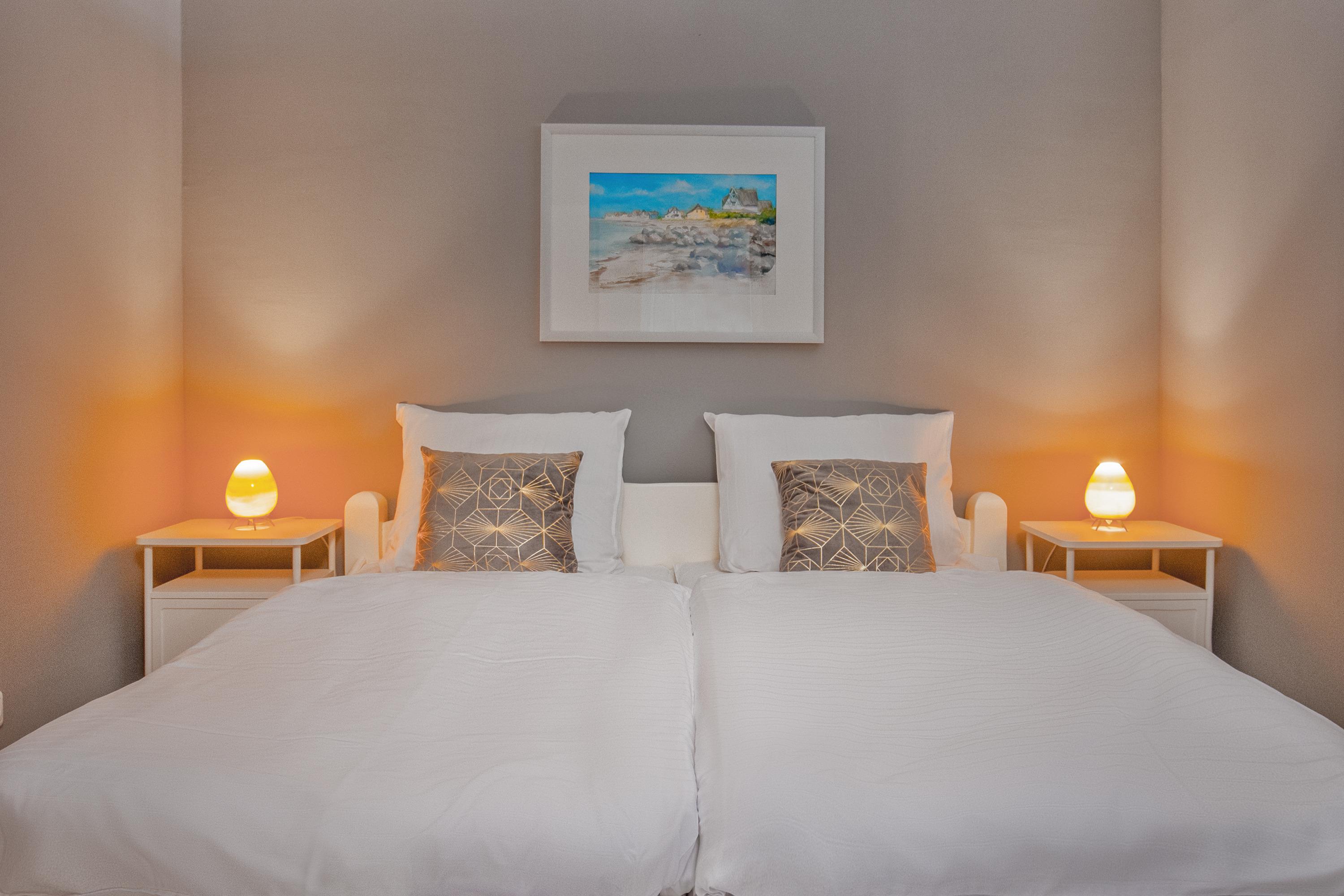 Ebenso komfortabel geht es in den zwei Schlafzimmern der Wohnung weiter. Einmal mit einem bequemen Doppelbett (180x200) und großem Kleiderschrank und im anderen Schlafzimmer ein Etagenbett, welches auch für Erwachsene geeignet ist. Für Verdunklung sorgen Plissees bzw. Rollo.