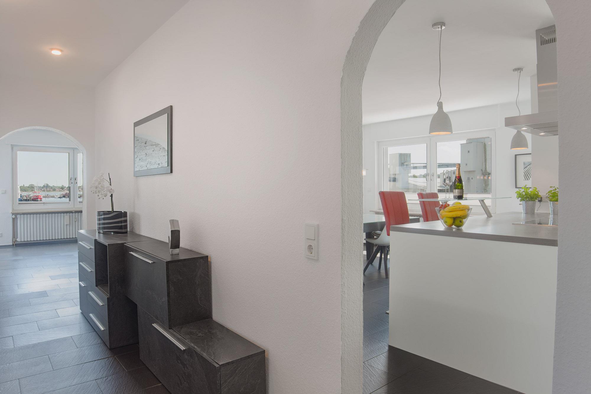 Sie bietet Platz für bis zu 6 Personen (4 Erw + 2 Ki) auf ca. 120 m² im 1.Obergeschoss. Der moderne und großzügige Wohnbereich mit hochwertiger Einrichtungslinie und reichlich Komfort, verbindet eine geschmackvolle, moderne Ausstattung mit einem großartigen Panoramablick auf die Ostsee und die direkt umliegenden Häfen. Verfolgen Sie hier, wie die Jachten Ein- und Auslaufen. Näher am Wasser kann man in Heiligenhafen nicht Urlaub machen!