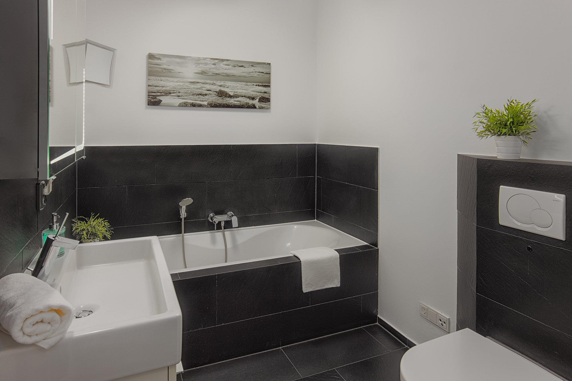 Ebenso komfortabel geht es in den zwei Schlafzimmern der Wohnung weiter. Hier warten einladende Doppelboxspringbetten (180x200 + 180x200), große Kleiderschränke und jeweils zusätzlich ein TV. Für Verdunklung sorgen elektrische Aussenjalousien. Bettwäsche und Handtuchsets sind inklusive.