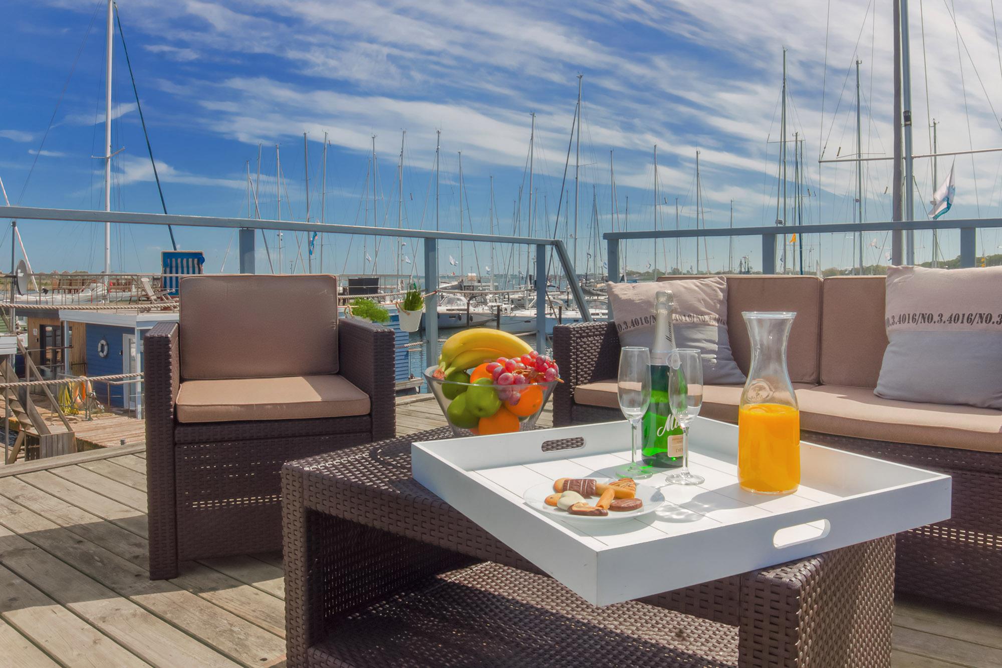 Erleben Sie exklusiven Urlaub auf dem Hausboot Stina mit Panoramablick auf den Jachthafen in Heiligenhafen.