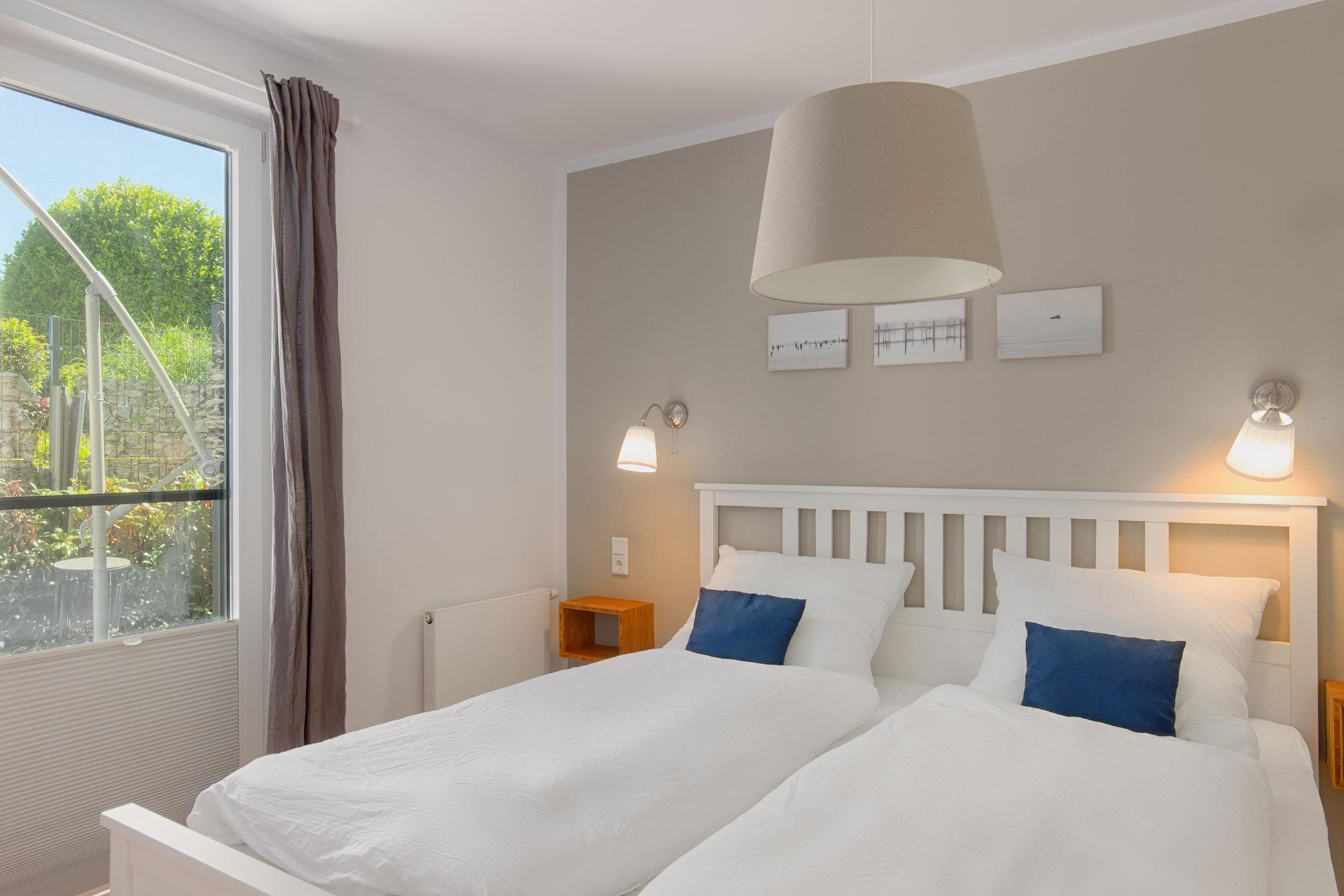 Im Schlafzimmer steht ein Doppelbett (180x200 cm, getrennte Matratzen) sowie ein geräumiger Kleiderschrank zur Verfügung. Ein gemütlicher Alkoven im dänischen Stil (140x200 cm) ist besonders bei Kindern beliebt. Beide Schlafräume sind mit Schiebetüren ausgestattet. Alternativ kann die Couch im Wohnbereich als zusätzliche Schlafgelegenheit genutzt werden. Bettwäsche, auch für Allergiker geeignet, Handtücher, ein Babyreisebett und ein Hochstuhl können bei Bedarf geliehen werden. Verdunkelungsvorhänge sorgen für erholsamen Schlaf.