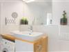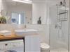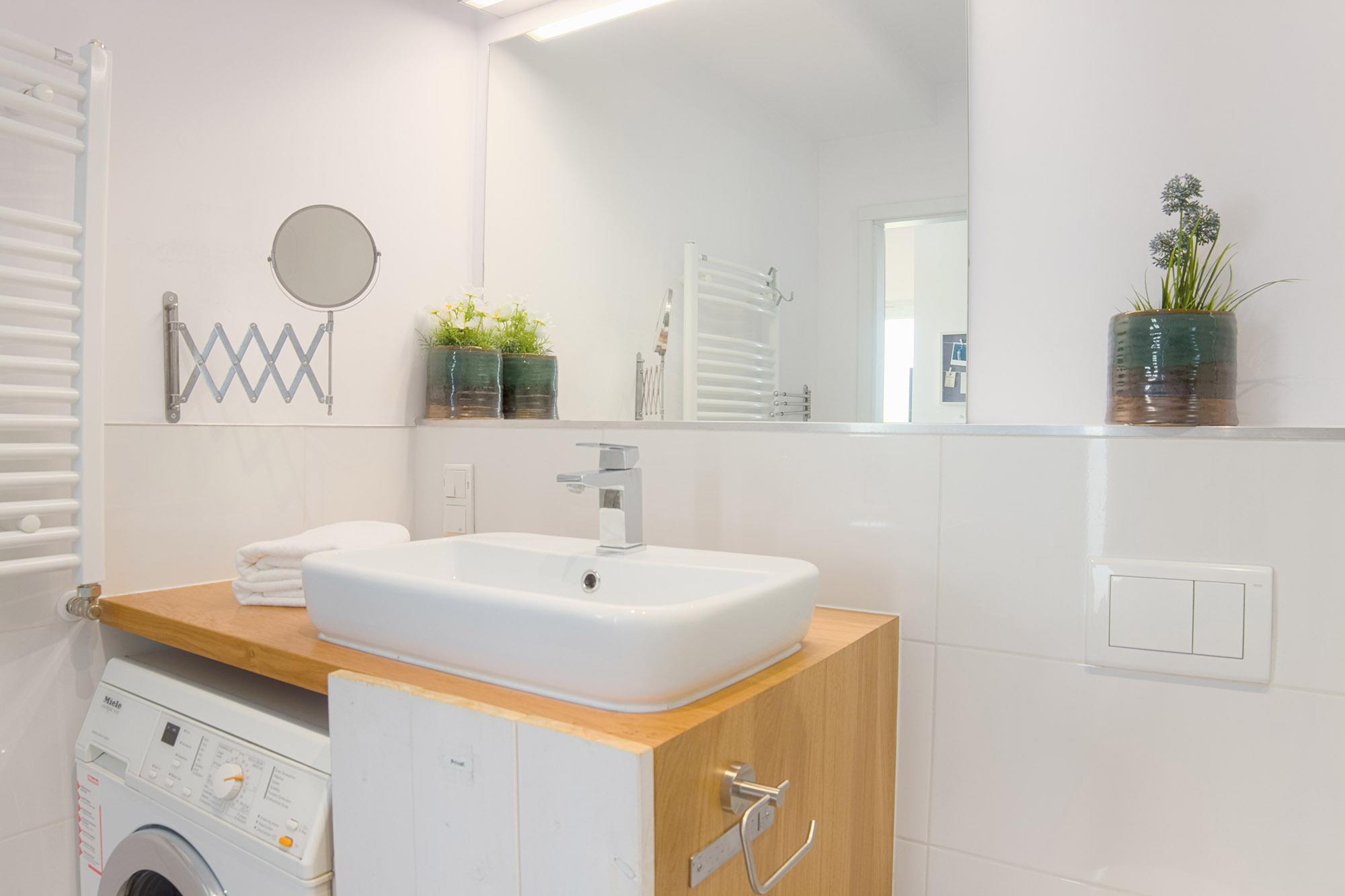 Das moderne Badezimmer ist mit einer ebenerdigen Dusche inklusive Rain-Shower-Funktion, WC, Föhn, Handtuchwärmer und Waschmaschine ausgestattet. Die offene Küche mit Induktionsherd und Spülmaschine lässt keine Wünsche offen, der angrenzende Essbereich lädt zu geselligen Mahlzeiten ein. Im Flur gibt es zusätzlichen Stauraum, und Koffer können platzsparend unter dem Alkoven verstaut werden.