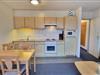 Sie verfügt über ein Bad mit Dusche, eine Küchenzeile (mit Mikrowelle, Backofen mit Herdplatten, Kühlschrank mit Gefrierfach, Kaffeemaschine, Wasserkocher, Toaster etc.) und einen gemütlichen Wohn-/ Essbereich mit einer großen Couch, welche man mit einem Topper (Liegefläche 80 x 200 cm) für eine 3. Person nutzen kann.