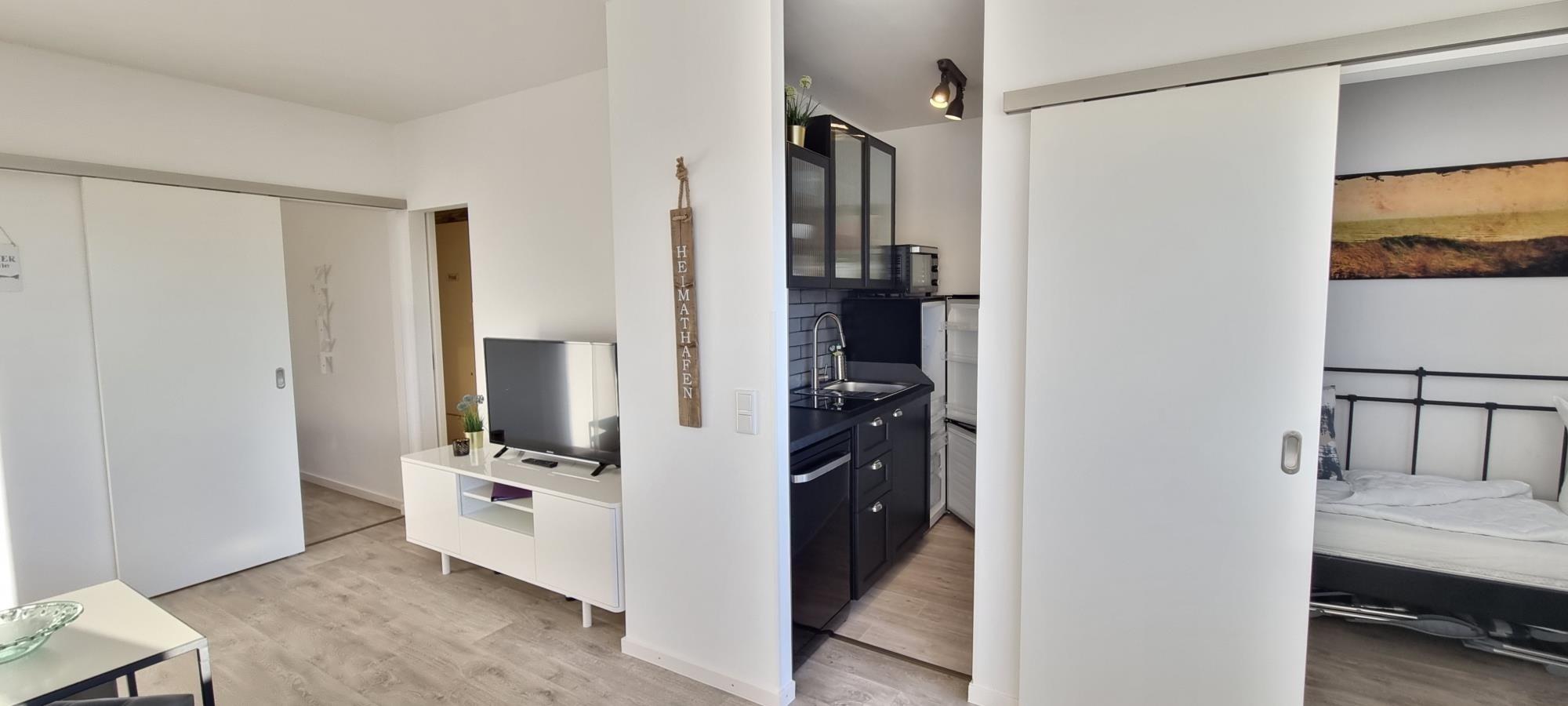 Der helle und freundlich gestaltete Wohnraum lädt zum Verweilen ein. Eine bequeme Couch sowie ein moderner Flachbildfernseher bieten Ihnen besten Komfort für entspannte Abende. Große Fenster sorgen für viel Tageslicht und schaffen eine angenehme Wohlfühlatmosphäre.