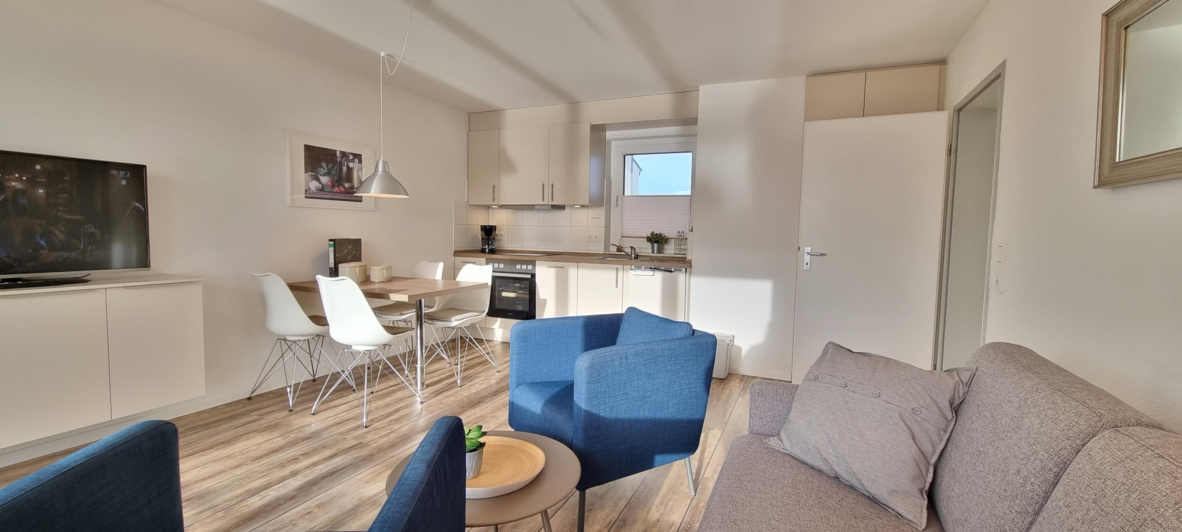 Die modern eingerichtete 2-Zimmer-Ferienwohnung überzeugt mit durchdachter Raumaufteilung und lichtdurchfluteten Wohnbereichen: