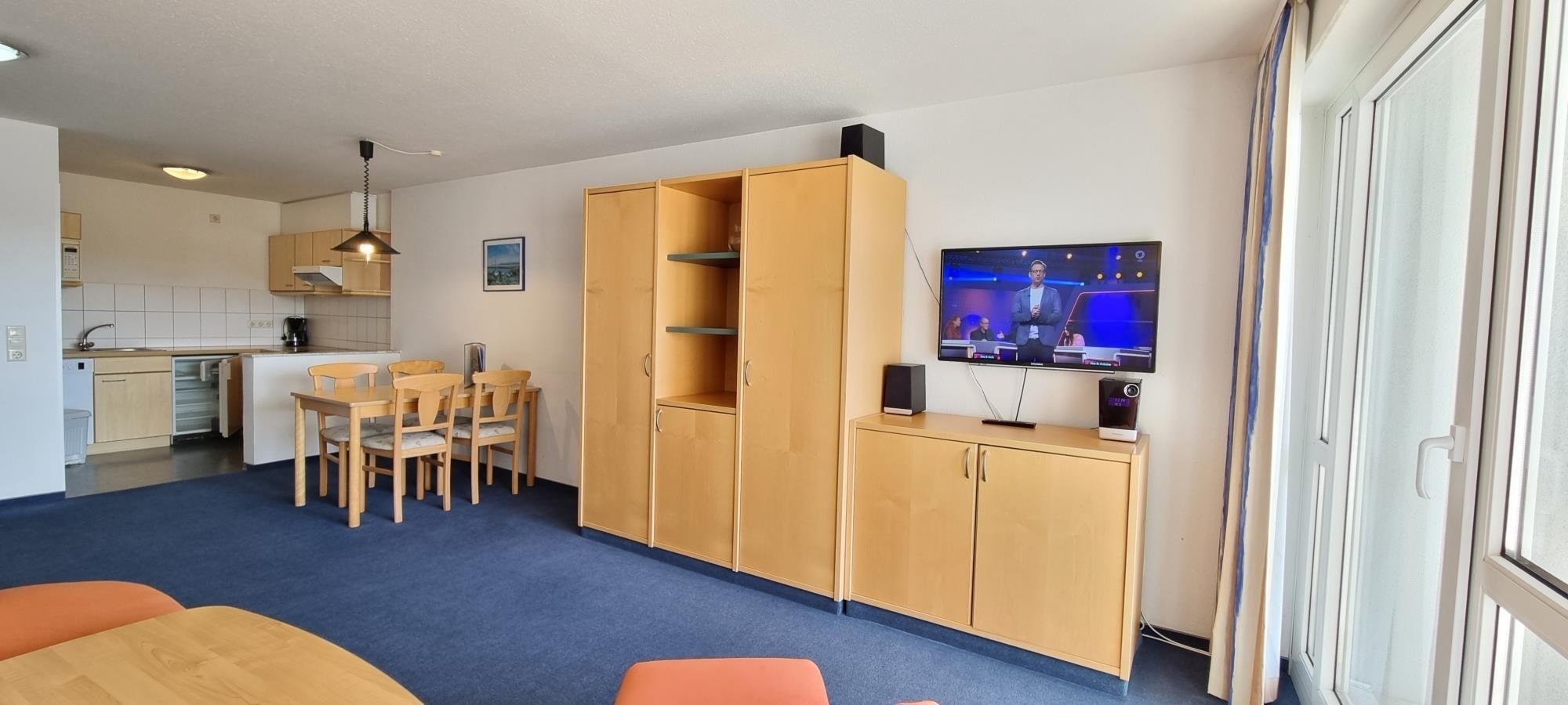 Das separate Schlafzimmer ist mit einem gemütlichen Doppelbett und großem Kleiderschrank ausgestattet, sodass Sie erholsame Nächte genießen können. Im hellen Wohnbereich finden Sie eine offene Küchenzeile mit Esstisch – ideal für die Selbstverpflegung während Ihres Urlaubs. Für zusätzliche Gäste steht eine Schlafcouch im Wohnzimmer zur Verfügung.