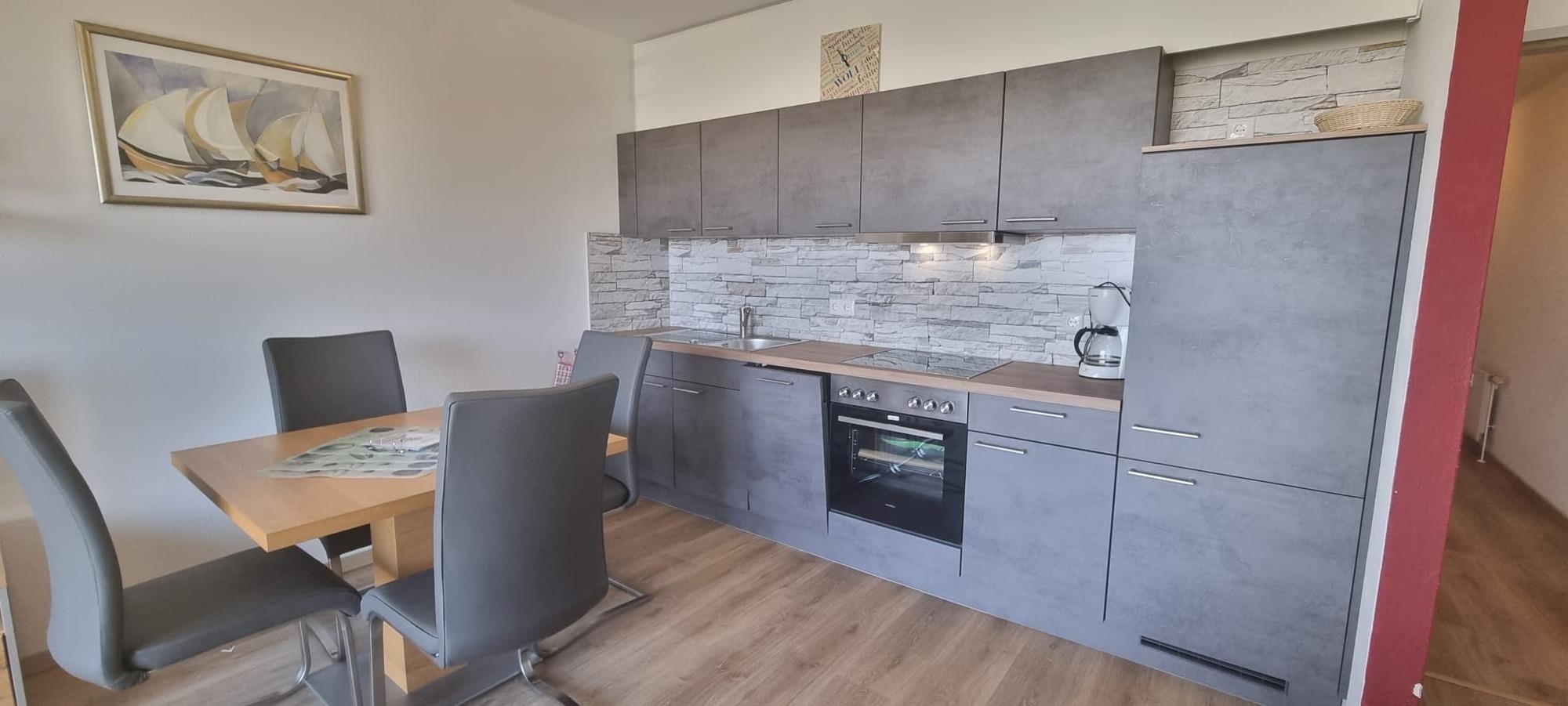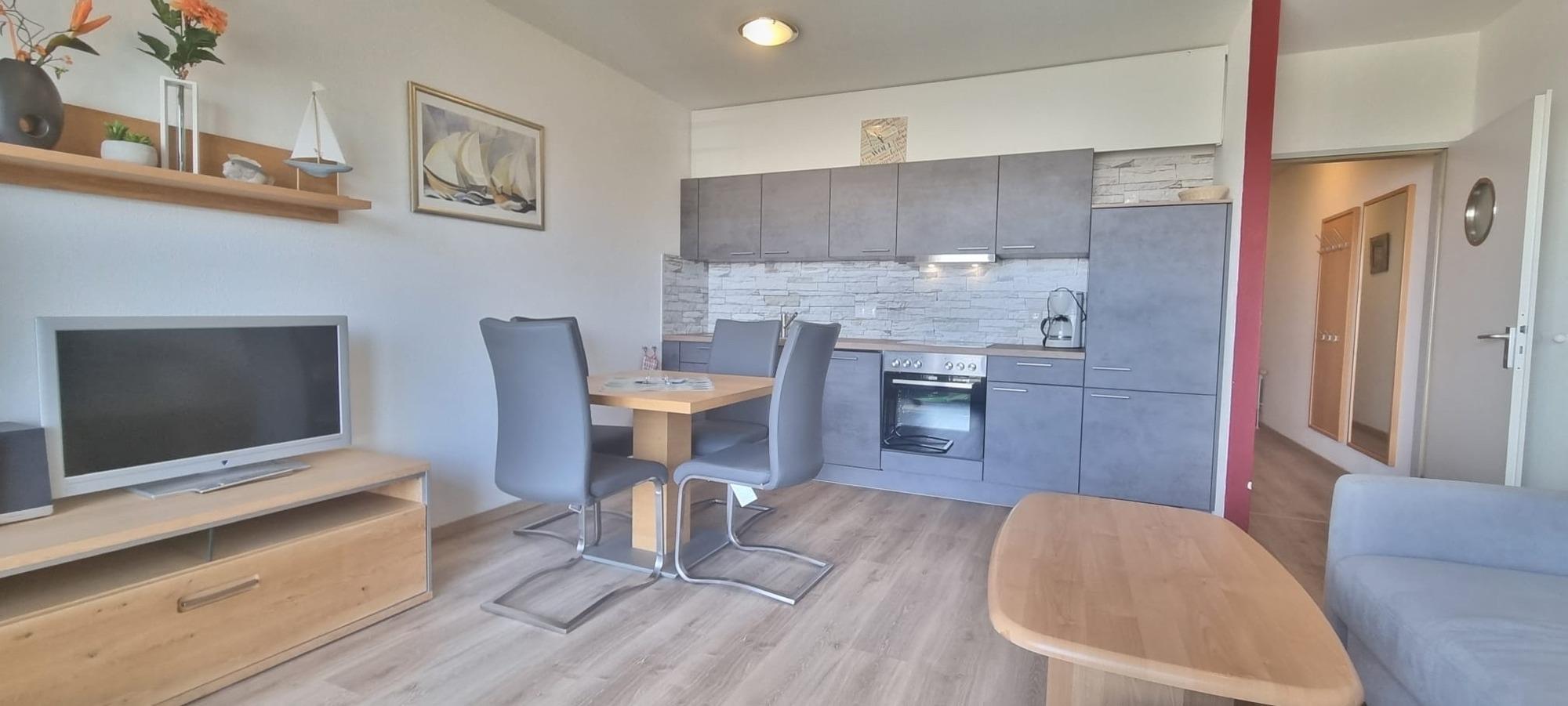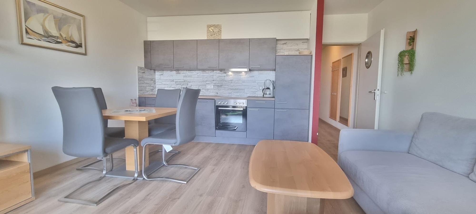 Das separate Schlafzimmer mit Doppelbett und geräumigem Kleiderschrank bietet ausreichend Platz für erholsame Nächte. Im kombinierten Wohn- und Küchenbereich erwartet Sie eine neue, moderne Küchenzeile, die ideal für Selbstversorger ausgestattet ist und komfortables Kochen im Urlaub ermöglicht. Das Wohnzimmer verfügt zusätzlich über eine Schlafcouch mit Schlaffunktion, sodass auch weitere Gäste bequem übernachten können.