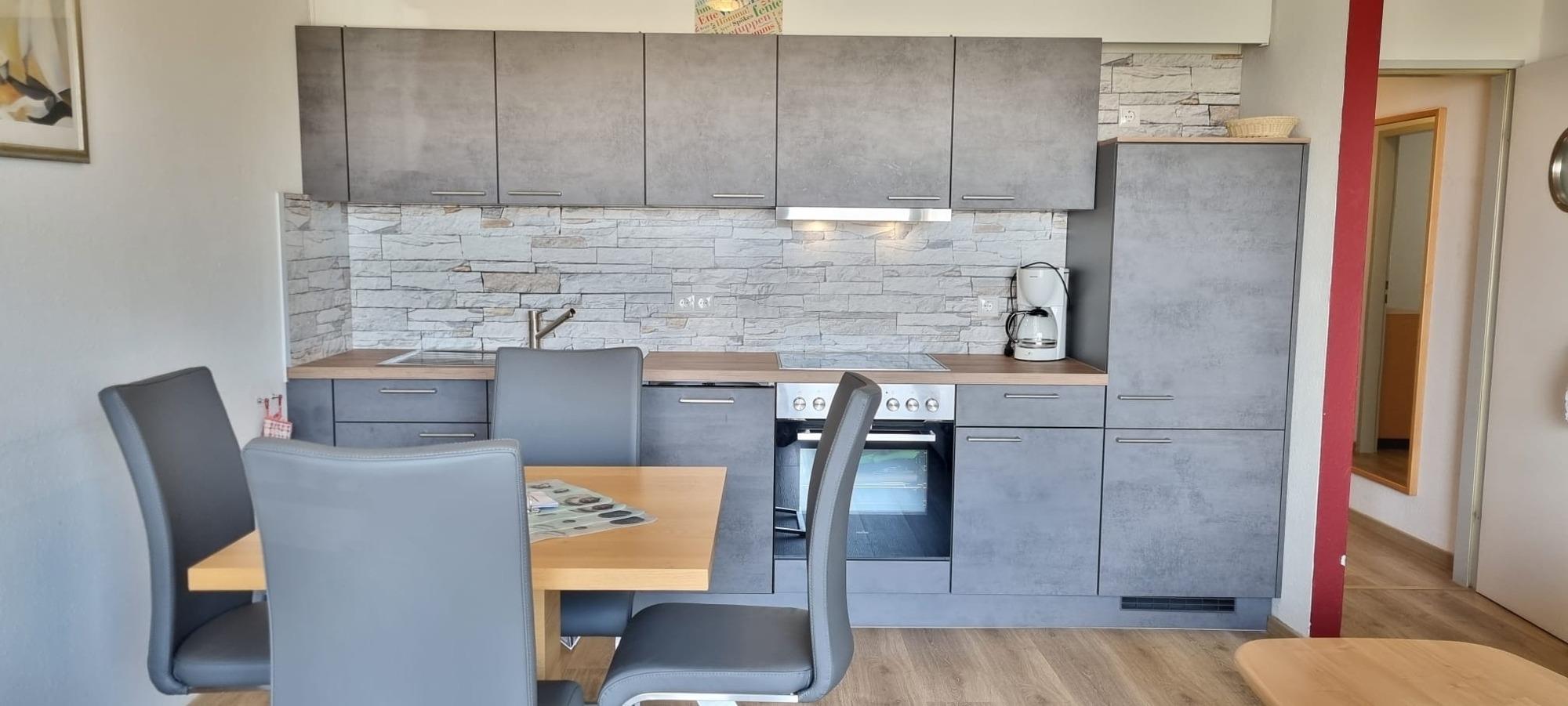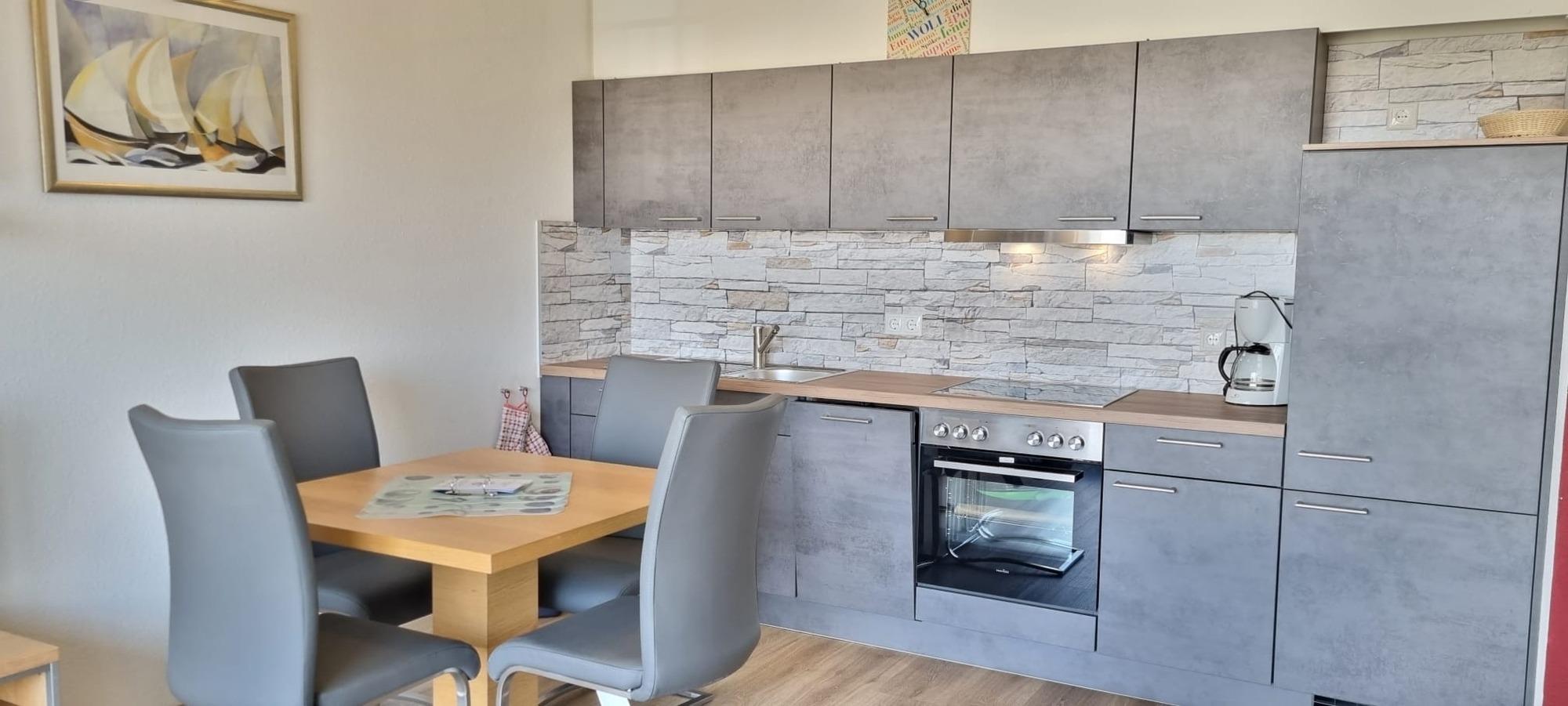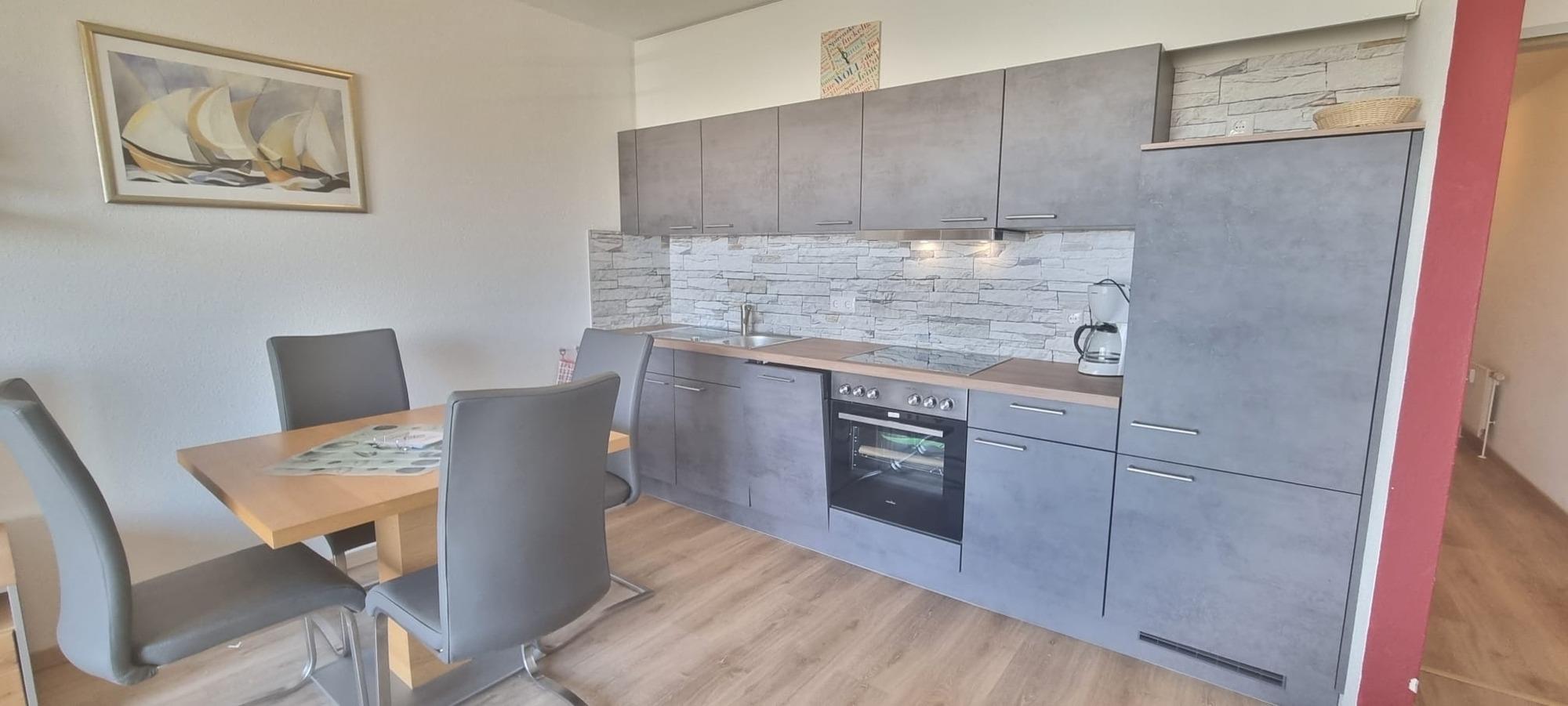 Das separate Schlafzimmer mit Doppelbett und geräumigem Kleiderschrank bietet ausreichend Platz für erholsame Nächte. Im kombinierten Wohn- und Küchenbereich erwartet Sie eine neue, moderne Küchenzeile, die ideal für Selbstversorger ausgestattet ist und komfortables Kochen im Urlaub ermöglicht. Das Wohnzimmer verfügt zusätzlich über eine Schlafcouch mit Schlaffunktion, sodass auch weitere Gäste bequem übernachten können.