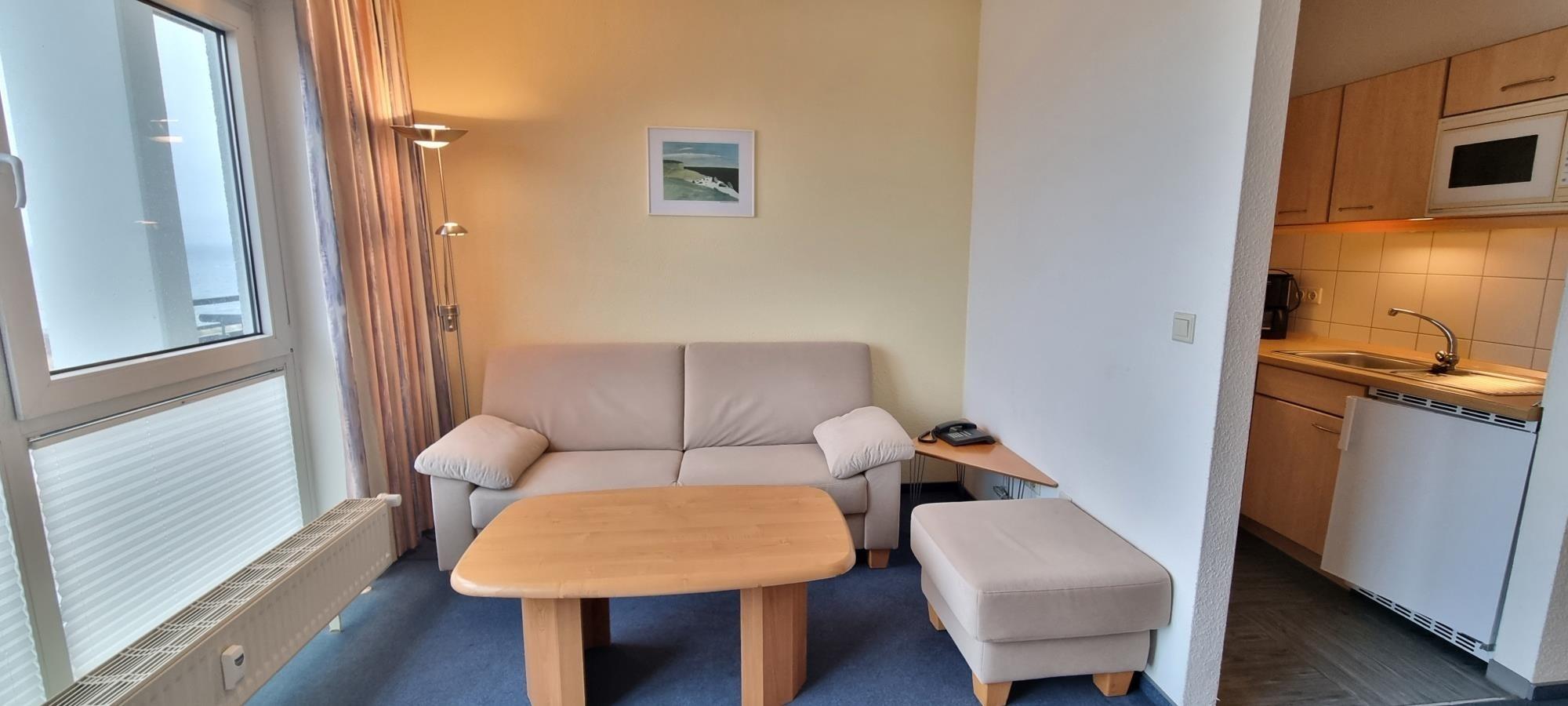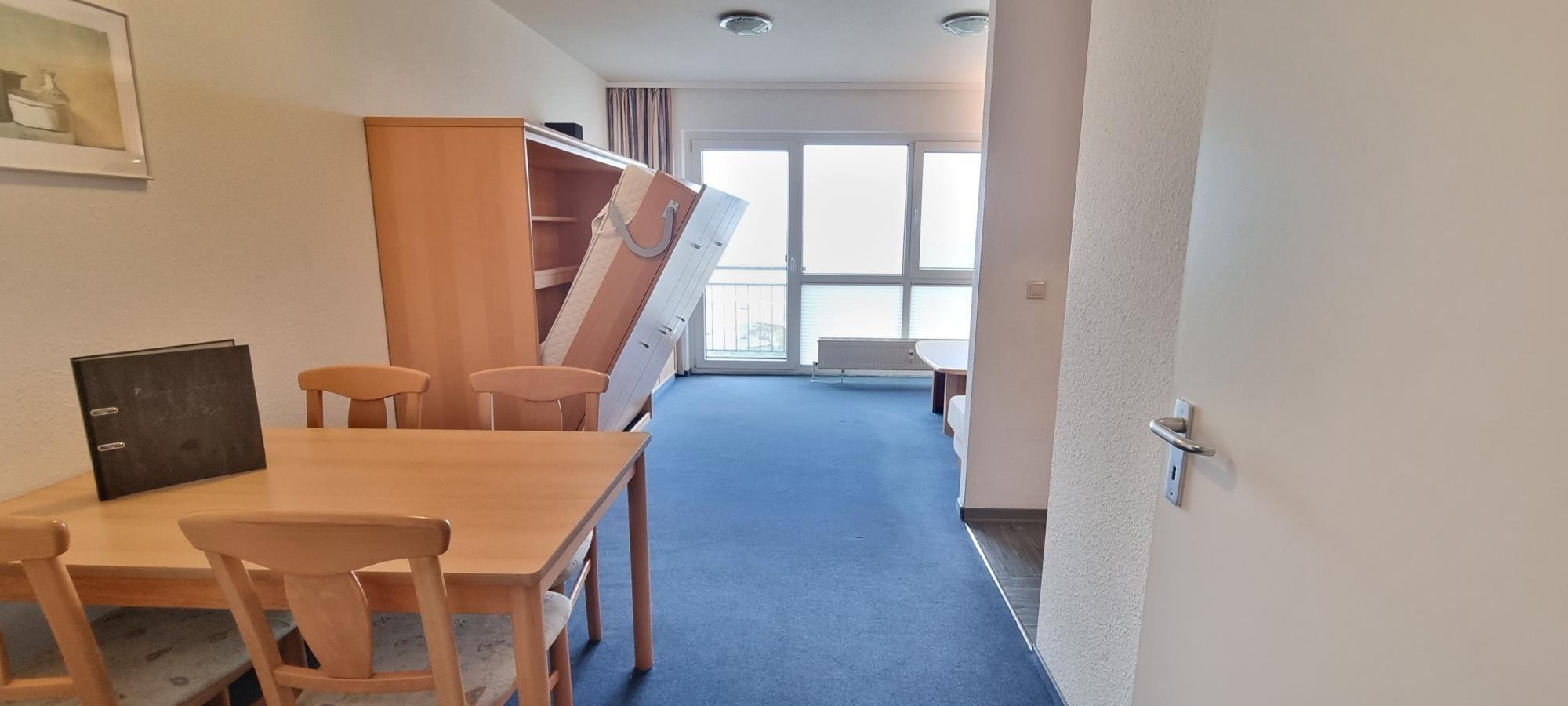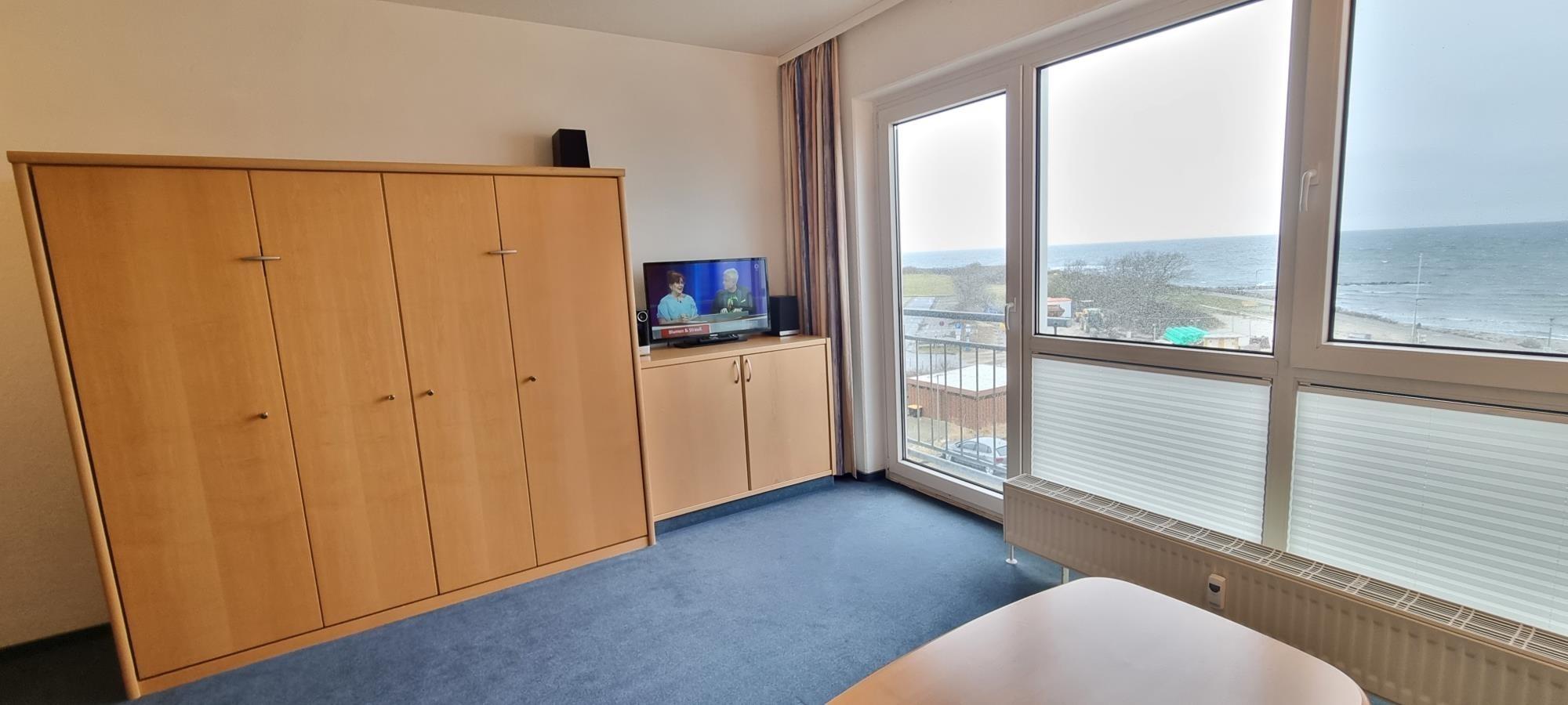 Der kombinierte Wohn- und Schlafbereich ist kompakt und praktisch gestaltet. Ein platzsparendes Schrankbett bietet komfortablen Schlaf für zwei Personen und sorgt tagsüber für mehr Bewegungsfreiheit. Vom französischen Balkon aus – ohne Sitzmöglichkeit – genießen Sie frische Ostseeluft und einen schönen Blick Richtung Meer.