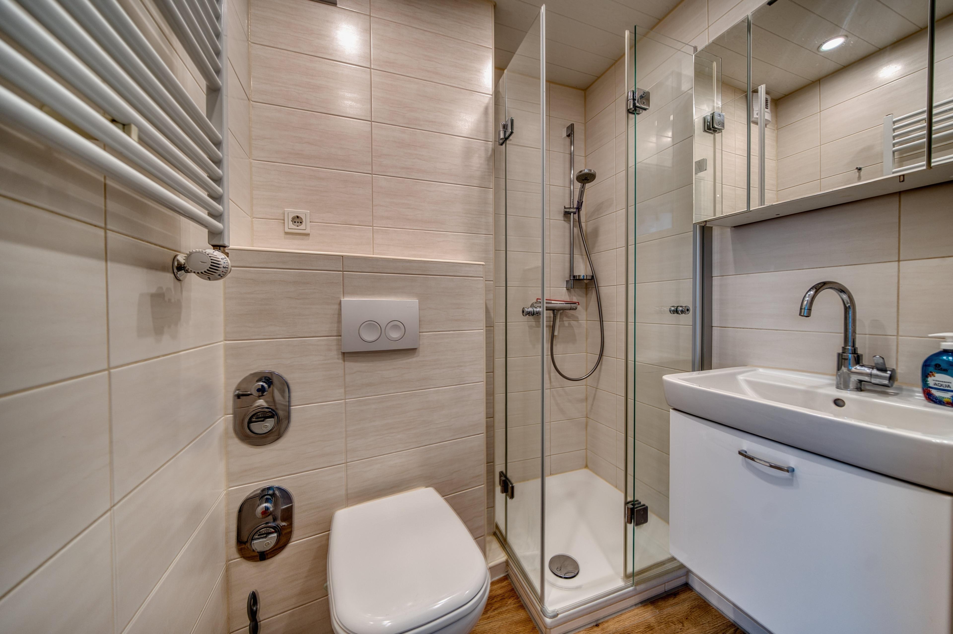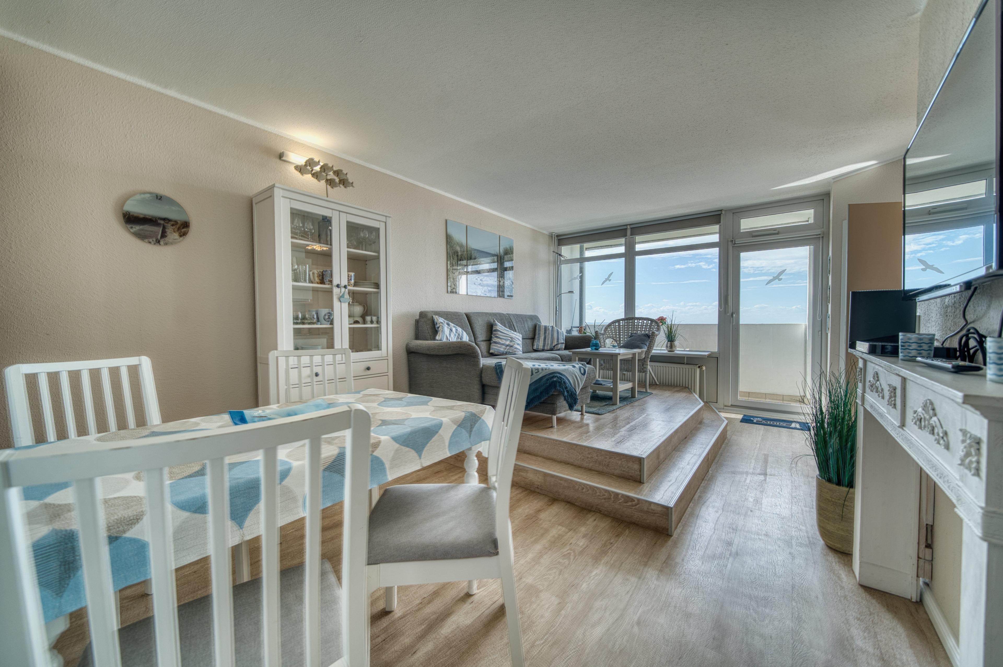 Die Wohnung bietet Wohnzimmer auf erhöhter Plattform mit Couch und Westbalkon, separaten Schlafbereich mit Doppelbett und TV, Kinderzimmer mit Etagenbett, Essbereich für 4 Personen, moderner Vinylboden. Küche mit Ceranfeld, Backofen, Mikrowelle, Kühlschrank mit Gefrierfach, Geschirrspüler, Kaffeemaschine, Toaster, Wasserkocher und Geschirr. Duschbad mit Handtuchtrockner. WLAN inklusive. Nichtraucher, keine Haustiere, Fahrstuhl, Fahrradräume, ca. 300?m zum Strand, Parkplatz hinter dem Ferienpark.