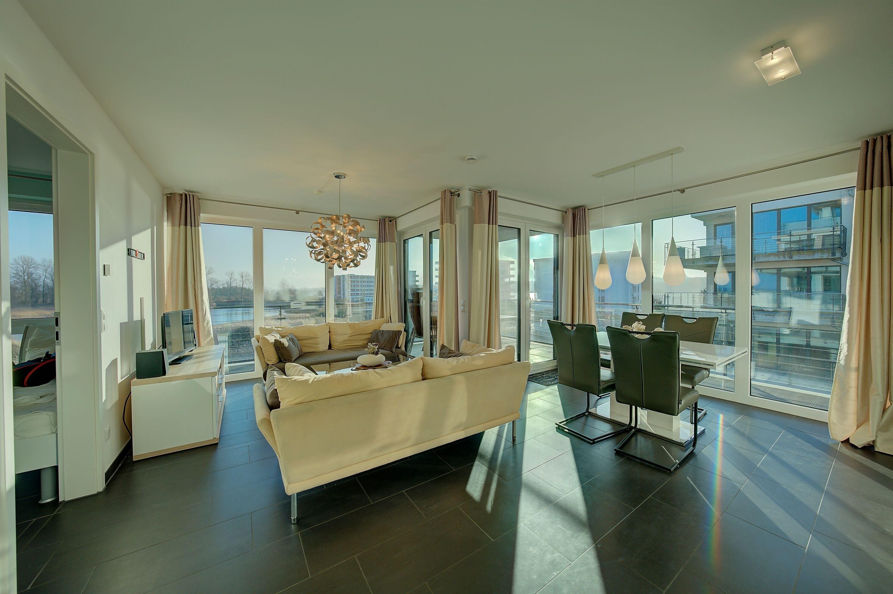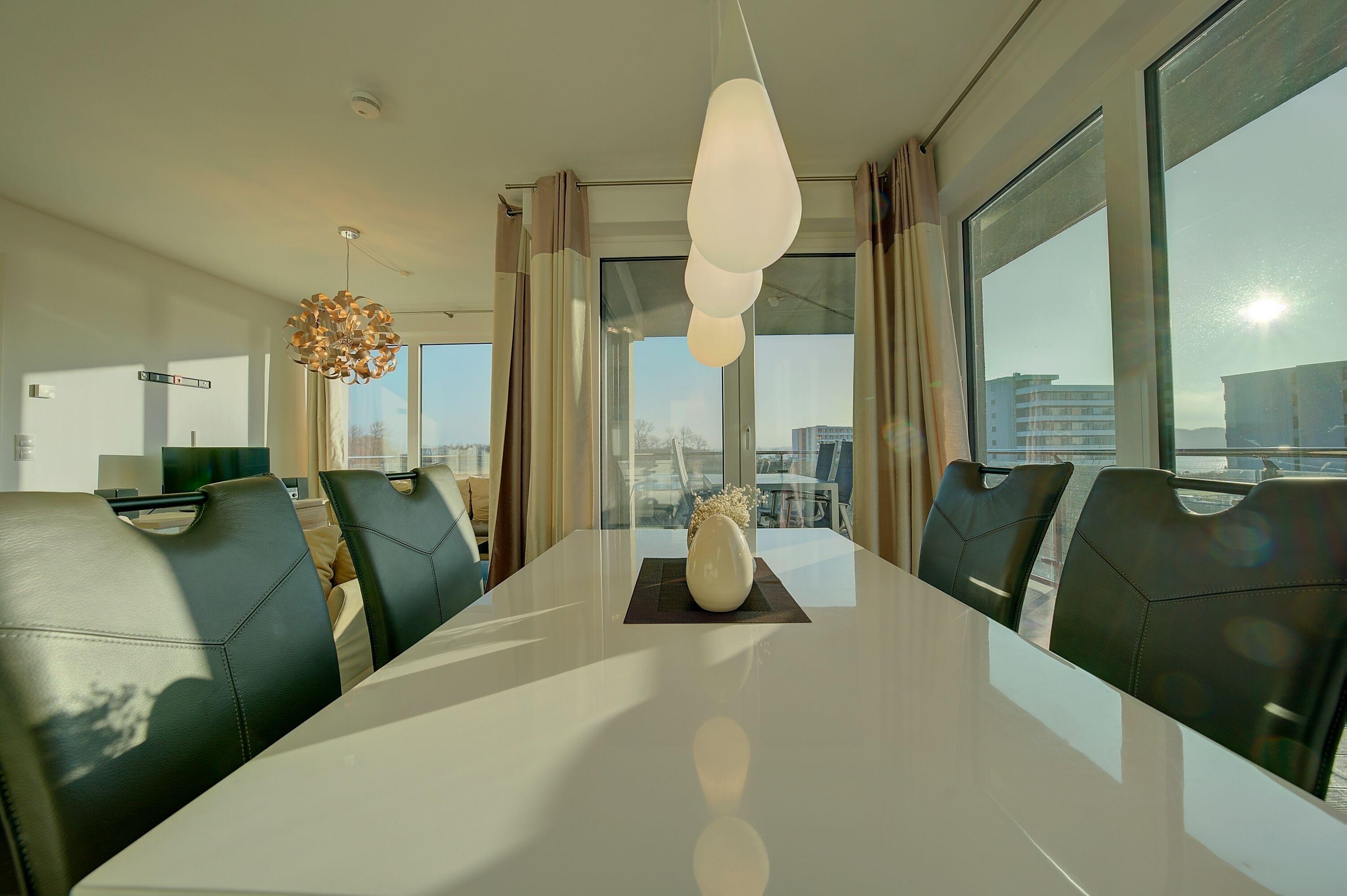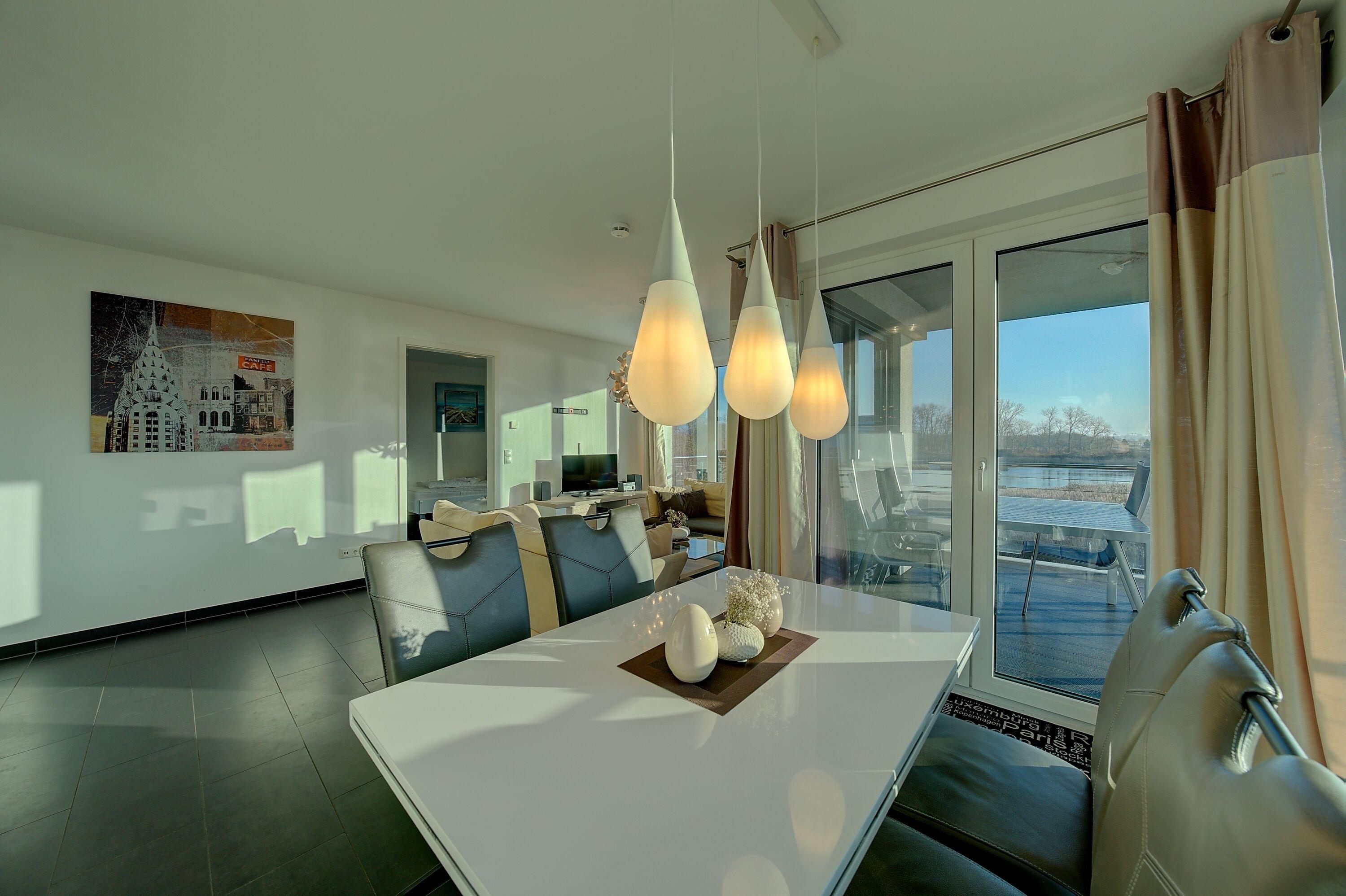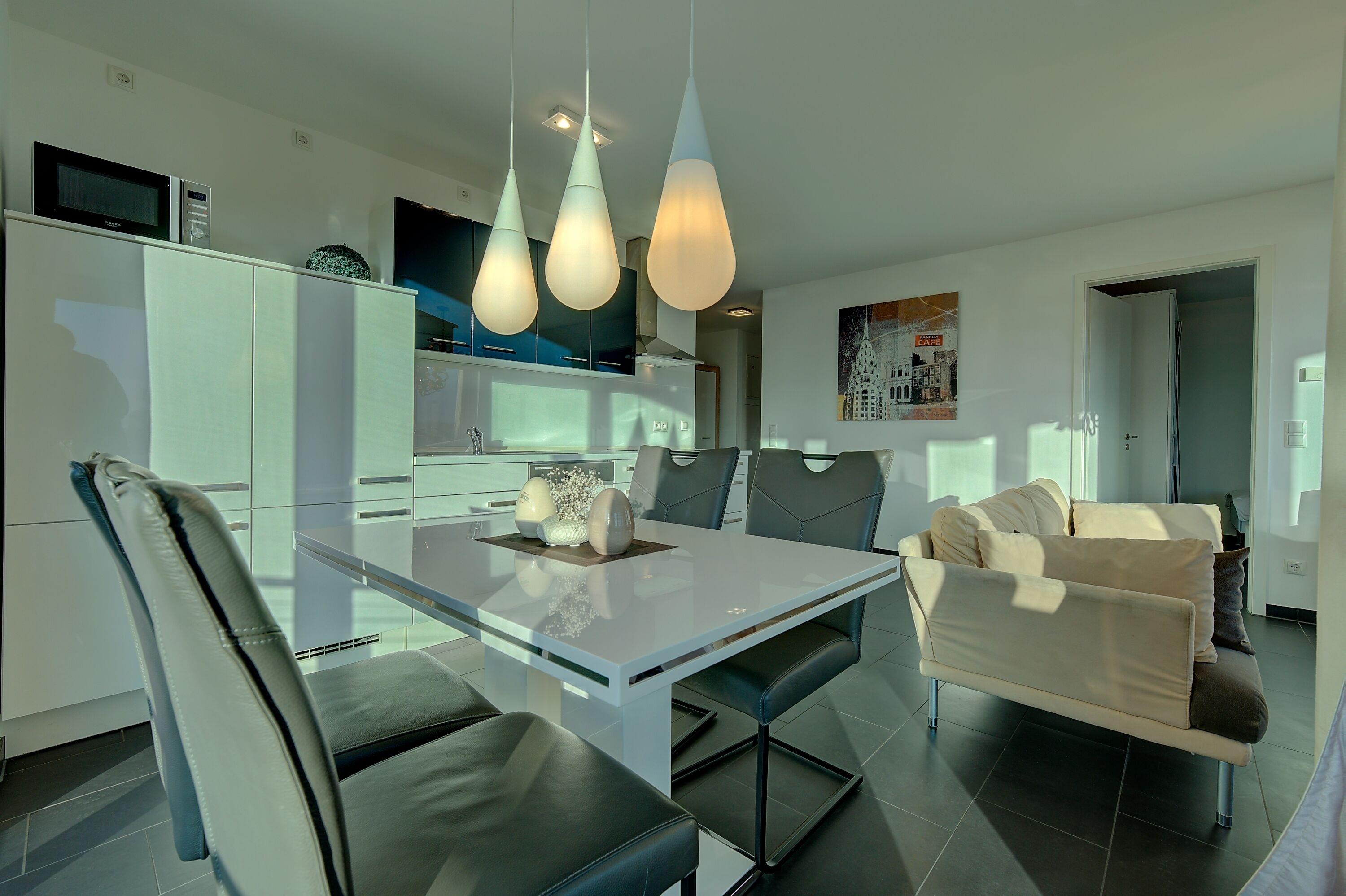 Der lichtdurchflutete Wohnbereich bildet das Herzstück der Wohnung. Eine gemütliche Sofaecke lädt zum Entspannen ein, während ein Flatscreen-TV sowie eine kleine Auswahl an Büchern für Unterhaltung sorgen. Der angrenzende Essbereich bietet bequem Platz für bis zu vier Personen und ist ideal für gemeinsame Mahlzeiten oder gesellige Abende.